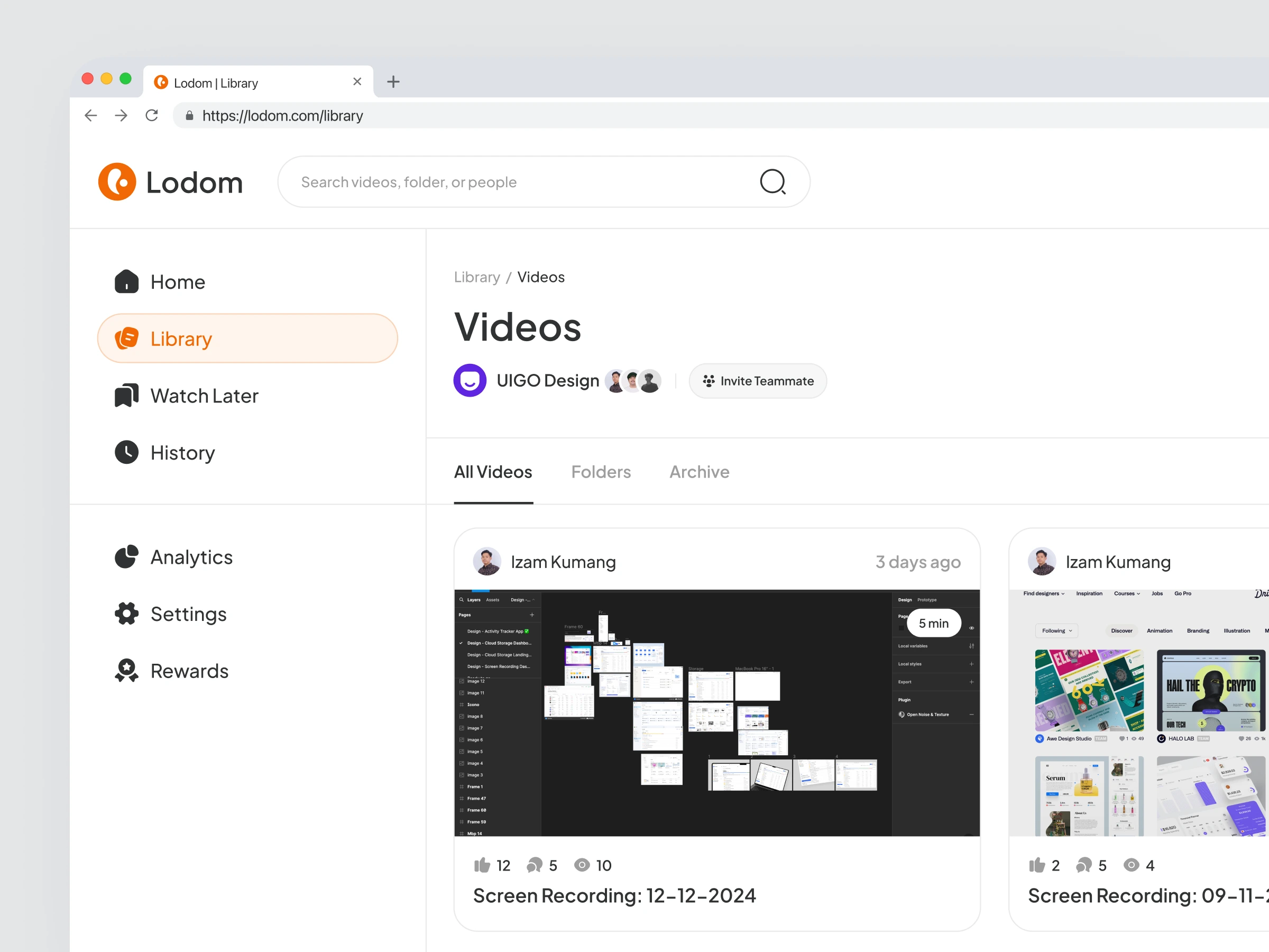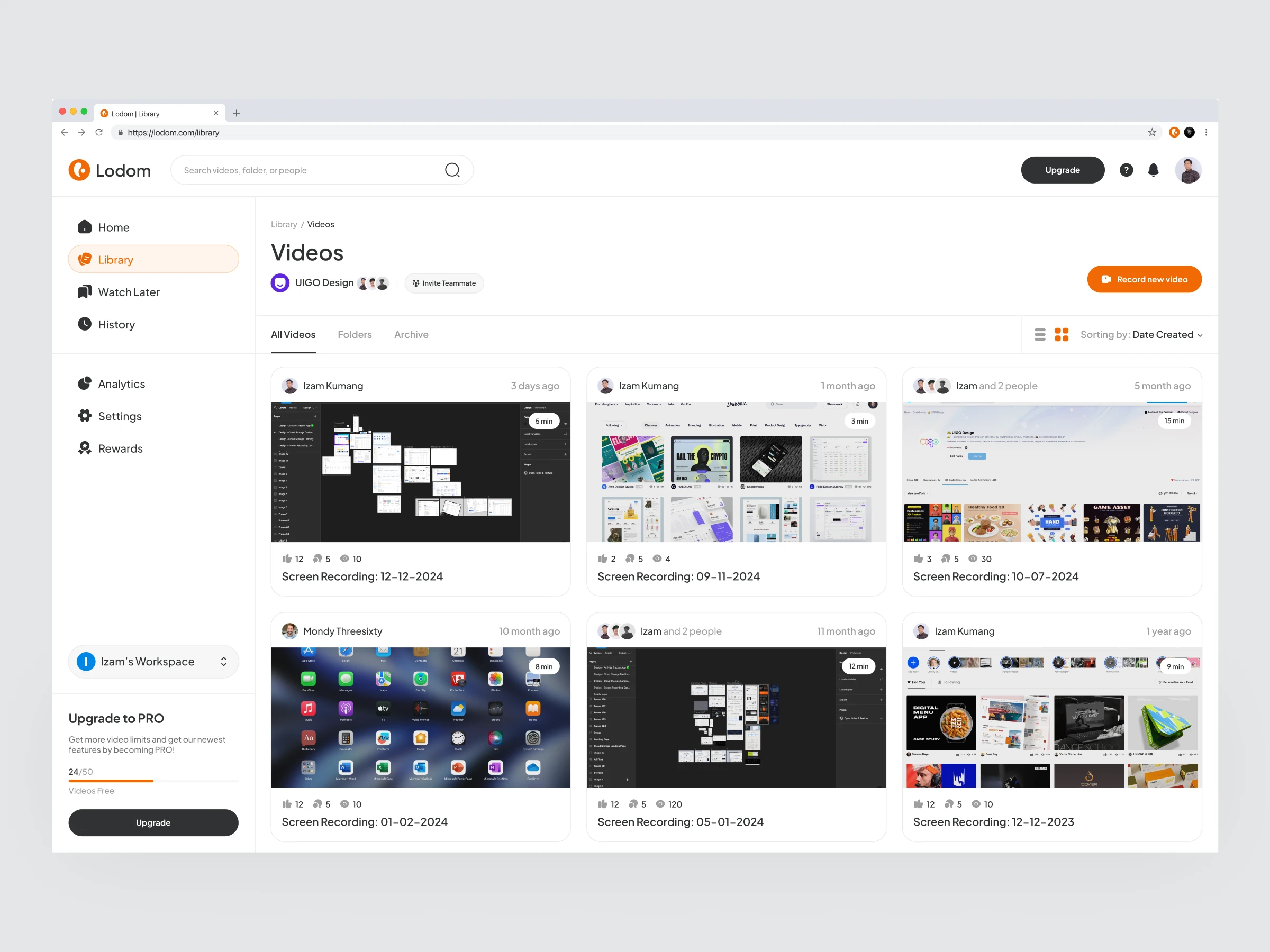 Lodom's dashboard library. Centralized hub for screen recordings, featuring intuitive organization, quick search, and easy content management.