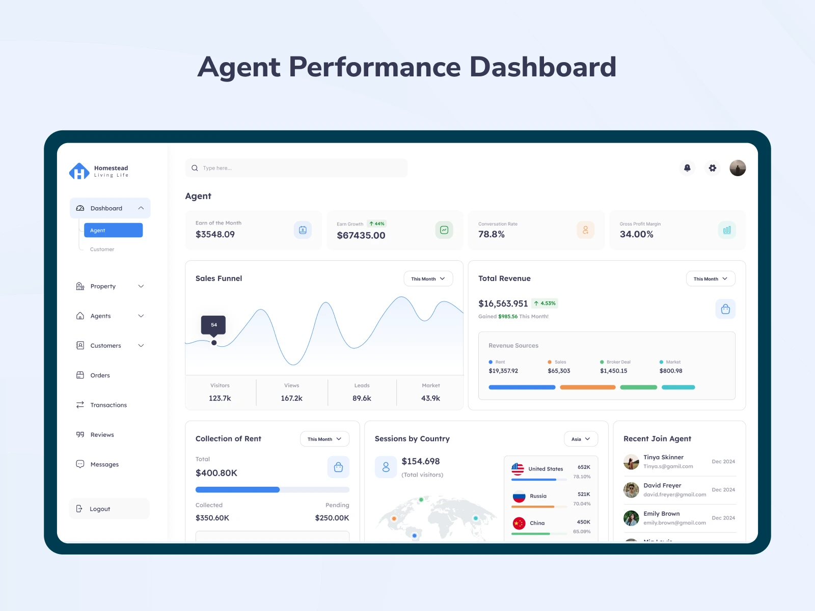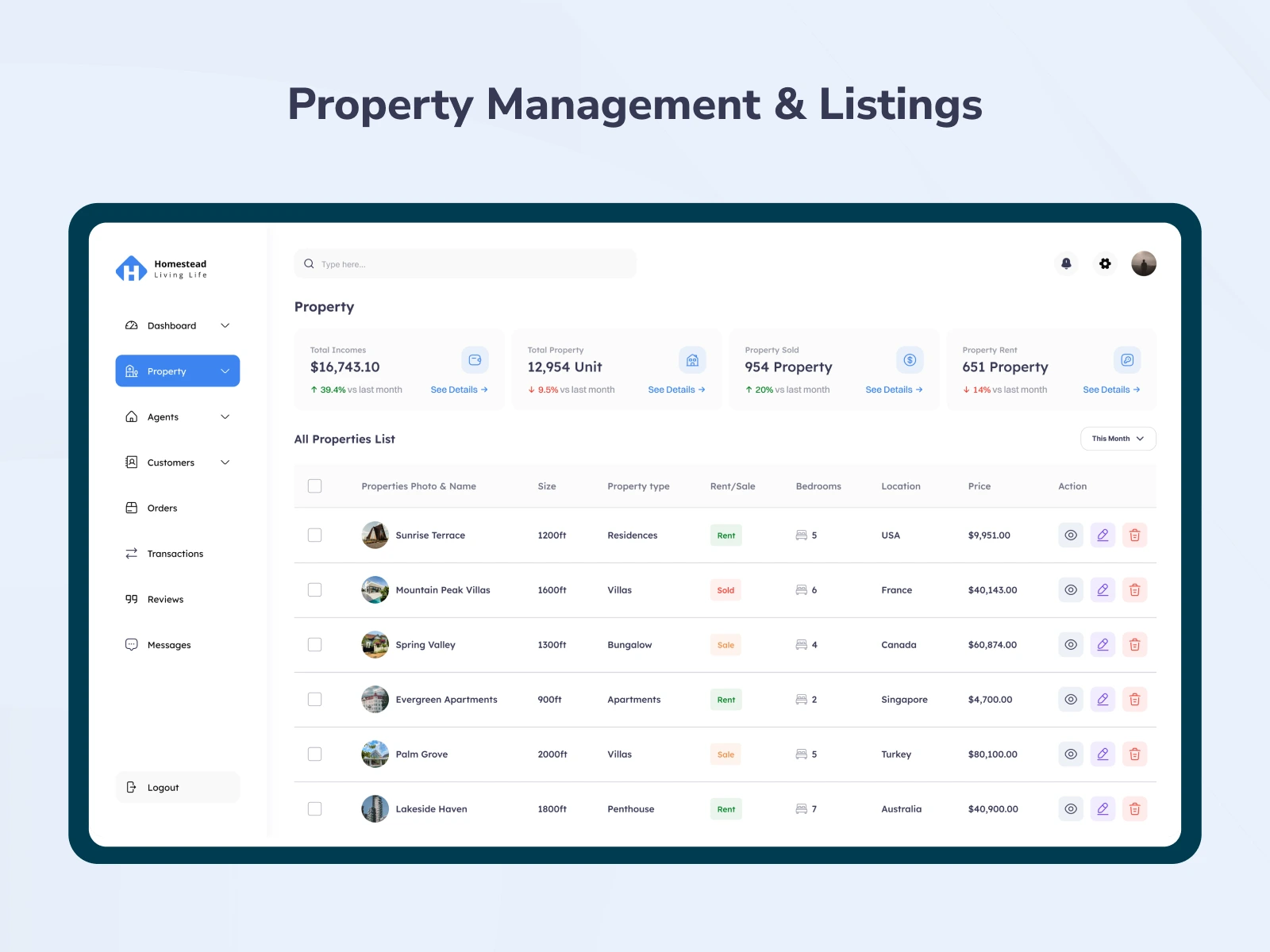 I structured the dashboard into dedicated modules for properties, agents, customers, orders, transactions, reviews, and messaging—each optimized for speed and clarity.