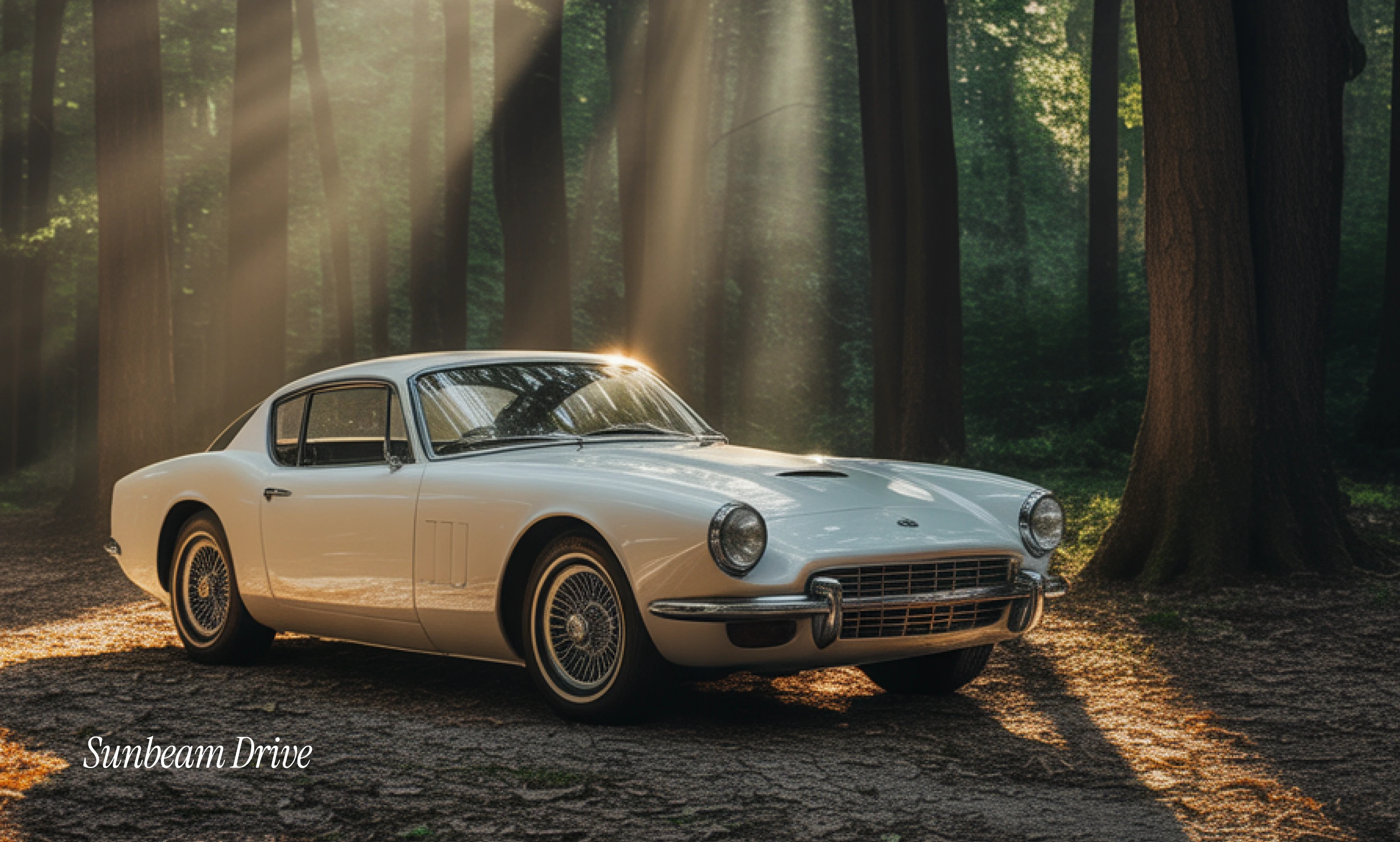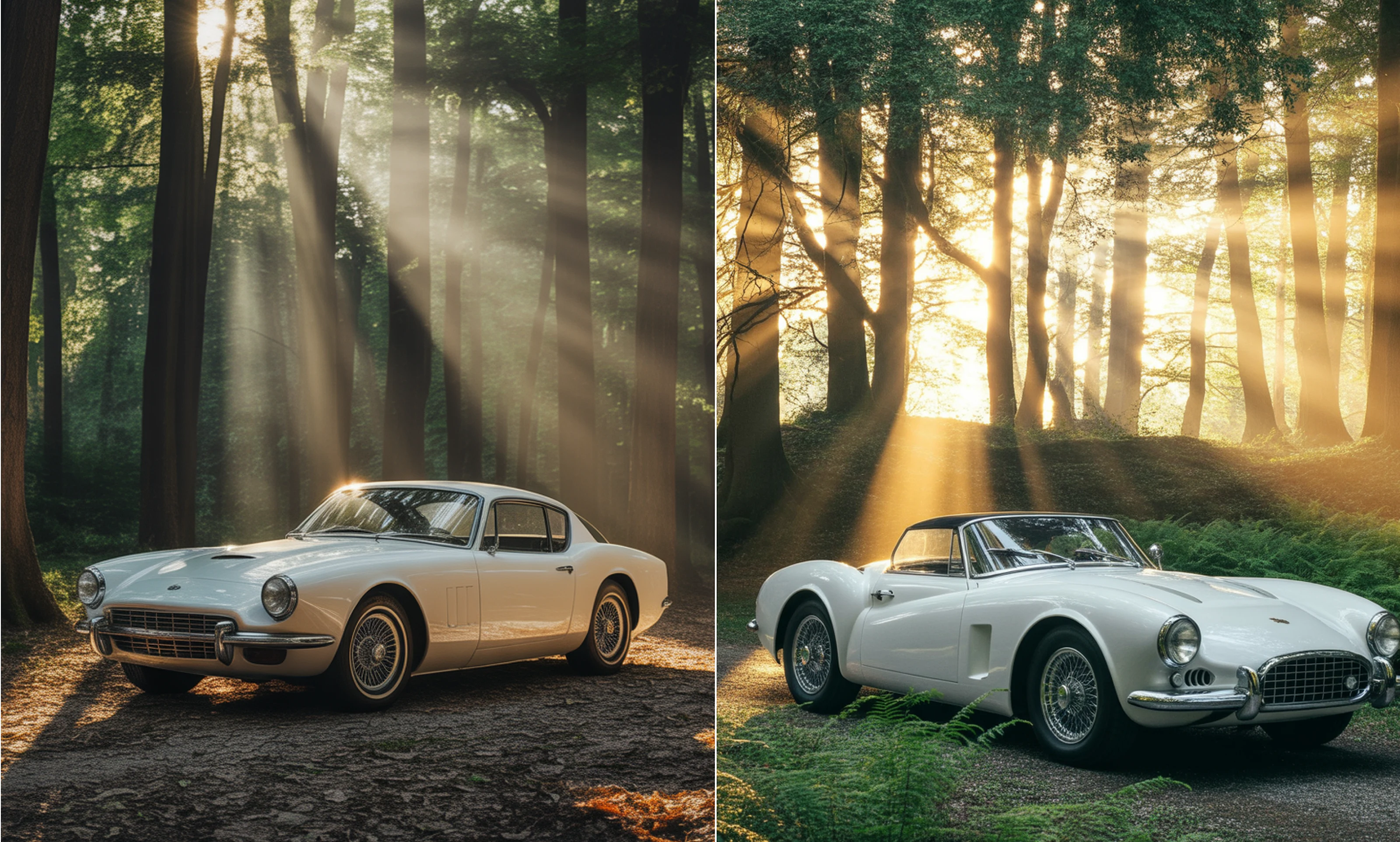 Classic white vintage sports car parked in a quiet forest clearing, dramatic sunlight beams cutting through dense trees, moody atmospheric fog, deep shadows, lush greenery, cinematic composition, high-contrast lighting, premium automotive photography style, serene and dramatic mood
