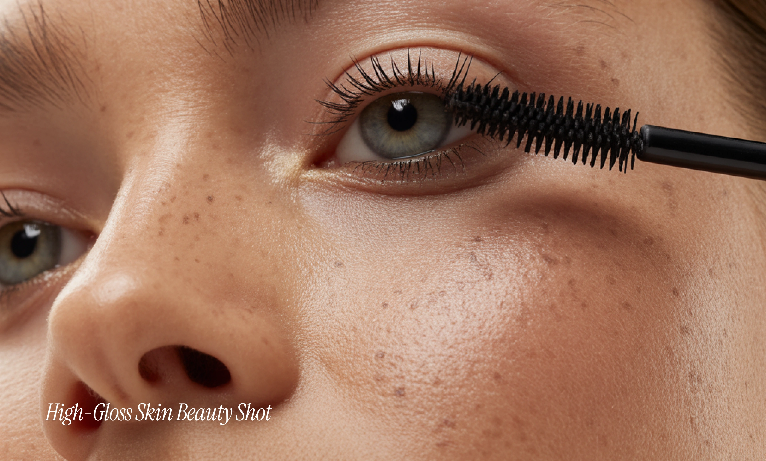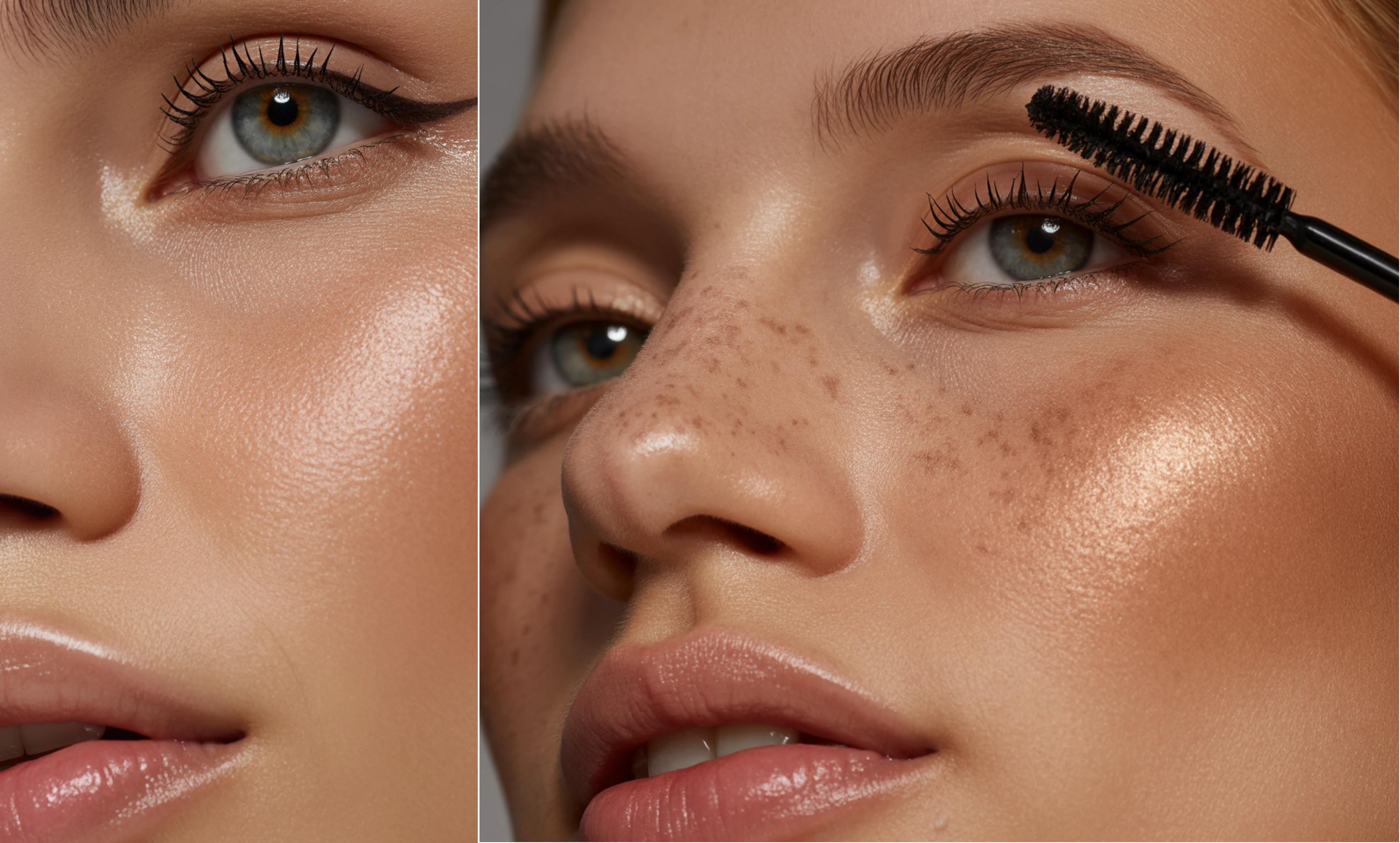 Extreme close-up beauty shot, glossy radiant skin with fine natural freckles, soft dewy highlights, long curled lashes touched by a mascara wand, subtle shimmer on eyelids, plump hydrated lips, warm neutral tones, ultra-detailed editorial makeup photography, clean soft diffused lighting, hyper-real texture and clarity