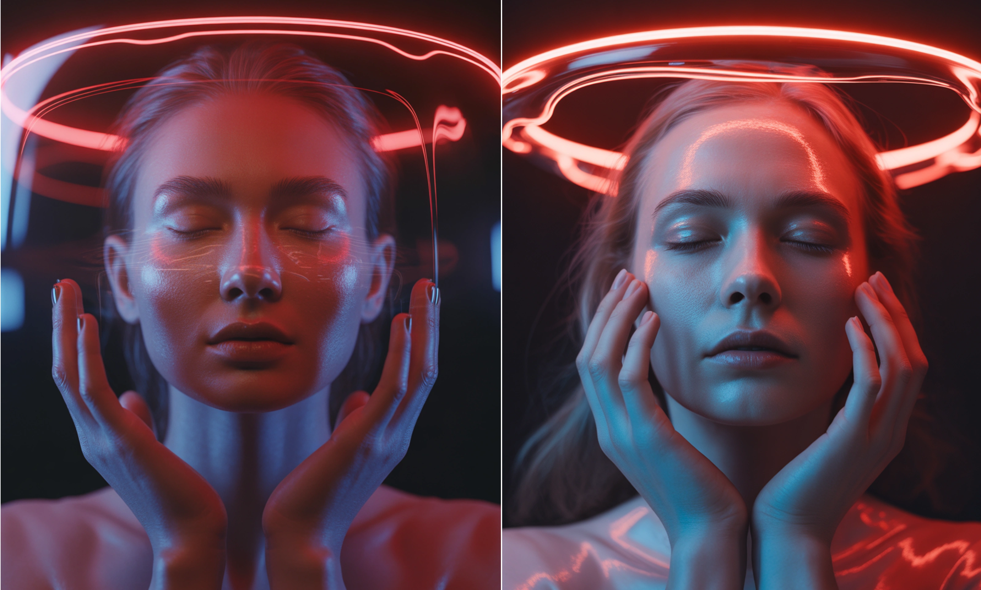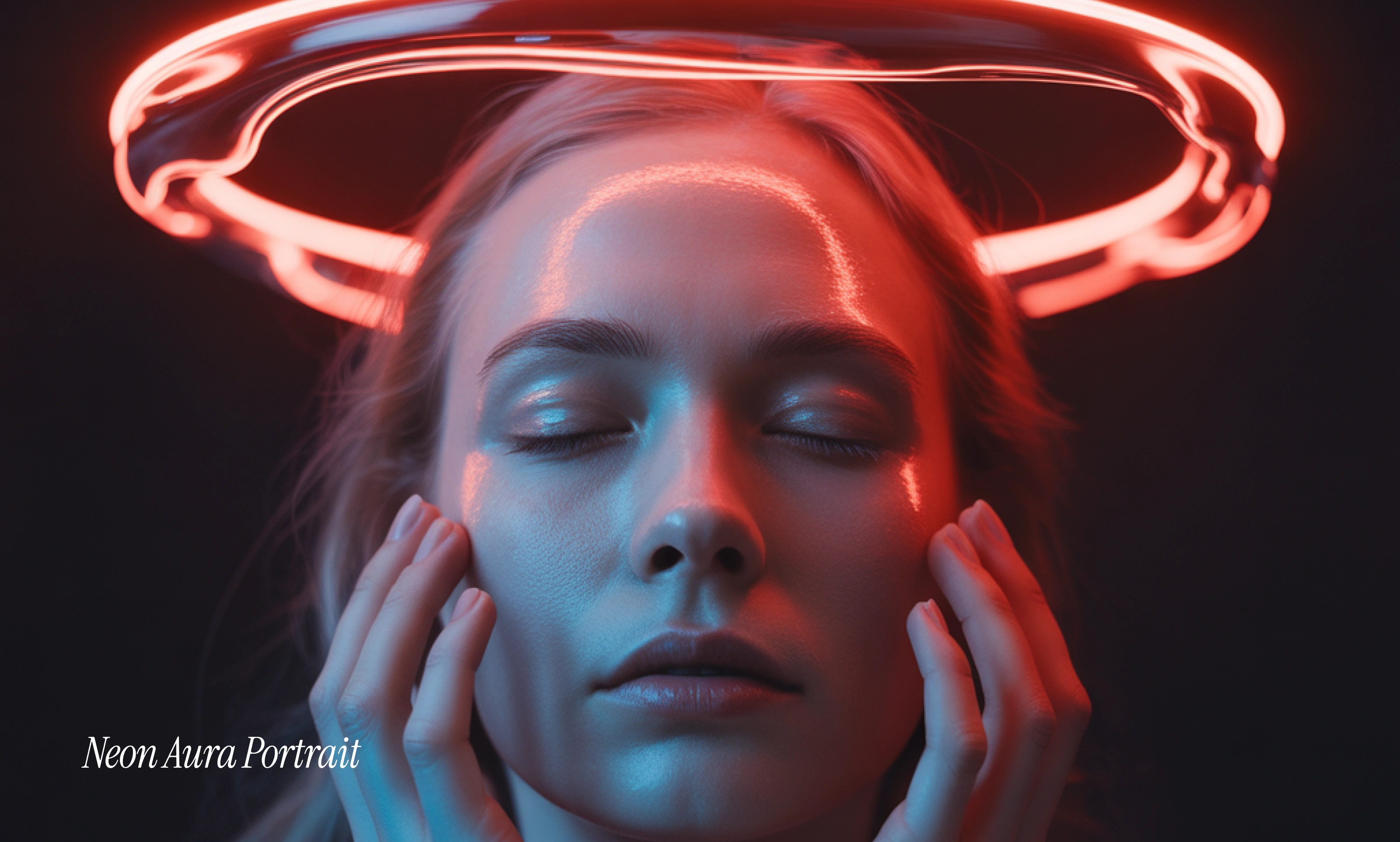 Surreal futuristic portrait, person with eyes gently closed, hands on face, glowing red neon halo floating above the head like liquid light, soft reflections on the skin, dark minimal background, dreamy cyber-aura mood, cinematic lighting, ethereal sci-fi atmosphere, high-detail emotional expression