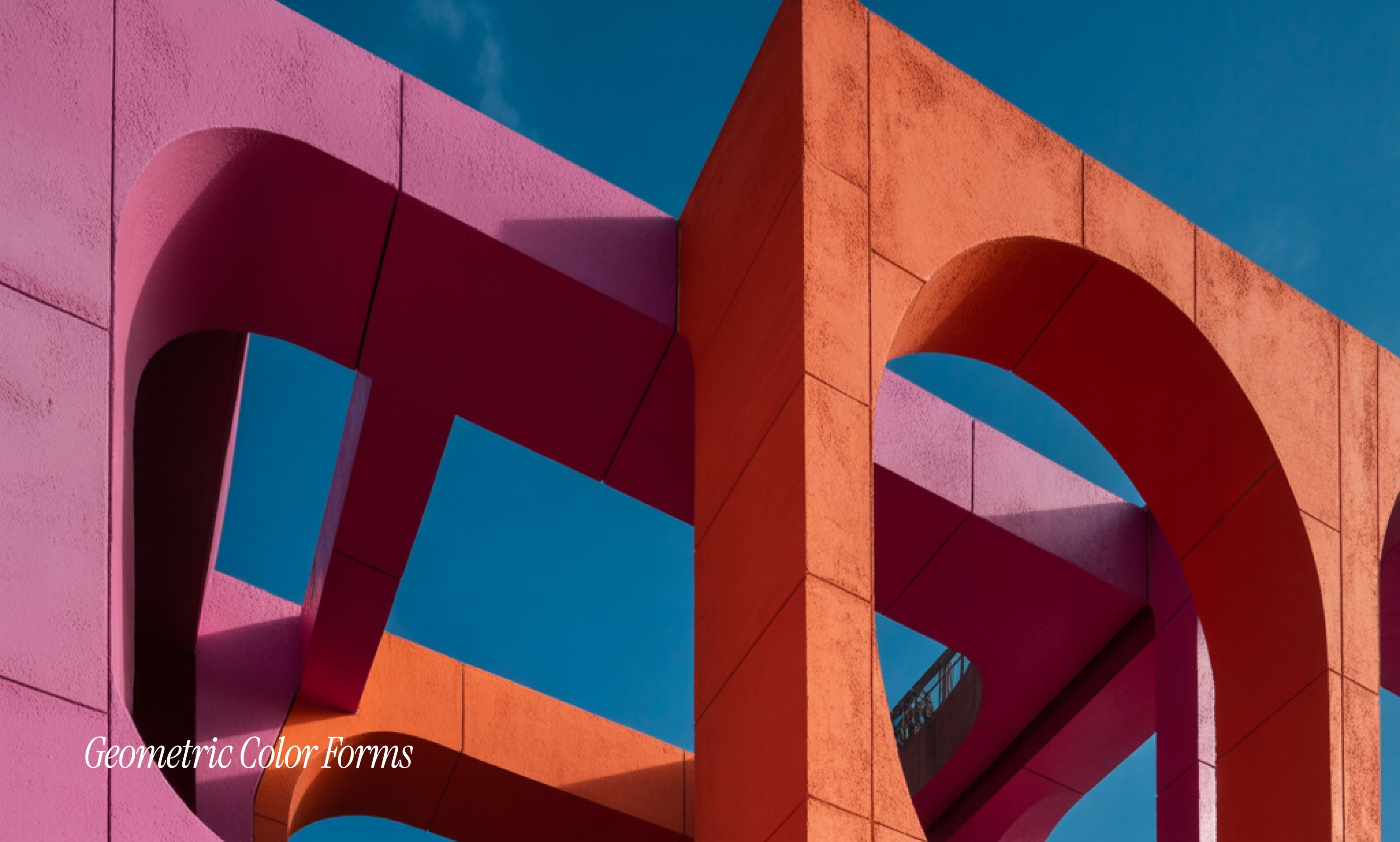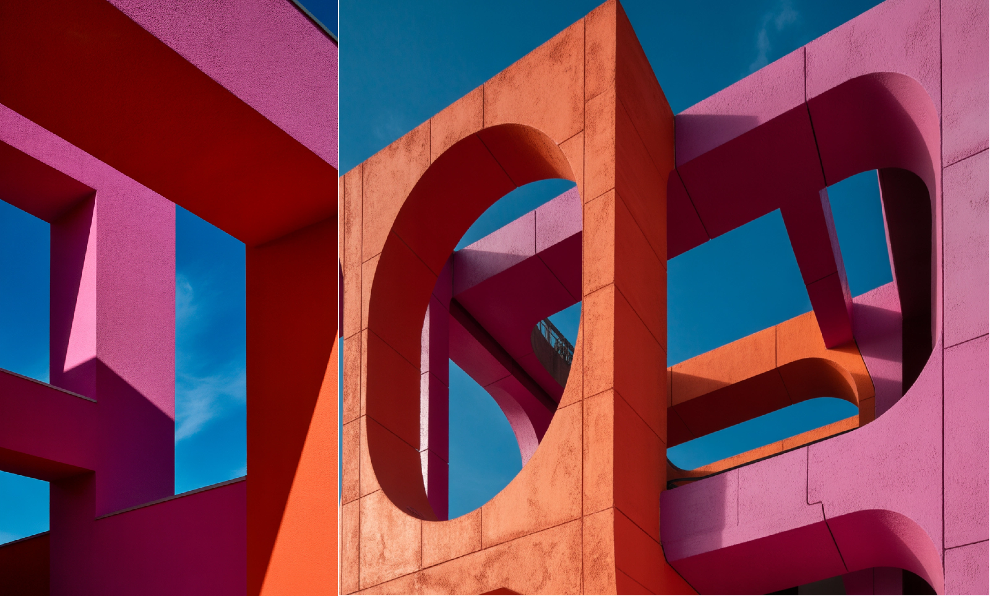 Vibrant modern architectural scene with bold geometric shapes, bright pink and red textured walls, large open cut-out windows framing a deep blue sky, sharp sunlight casting dramatic angular shadows, minimal and graphic composition, clean contemporary design, high-contrast color palette