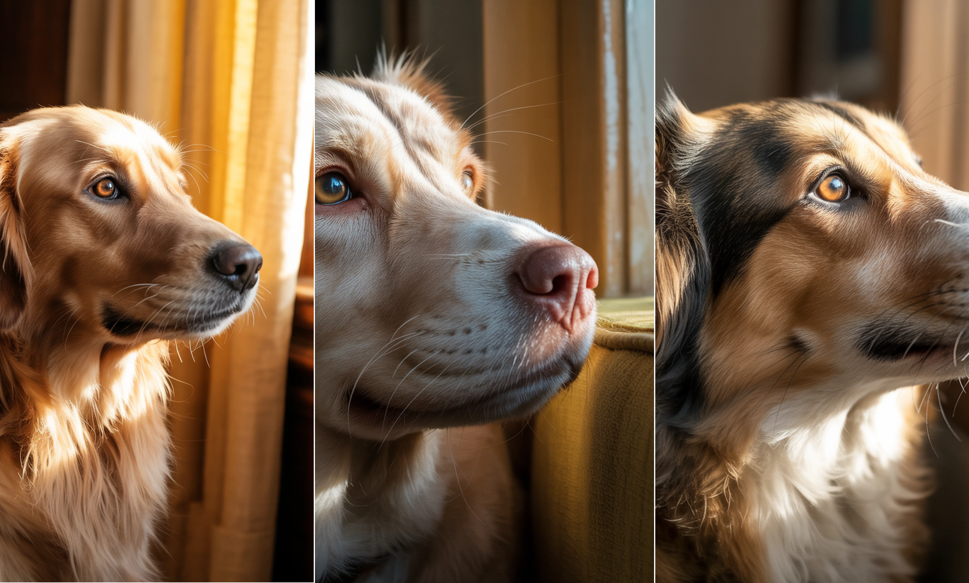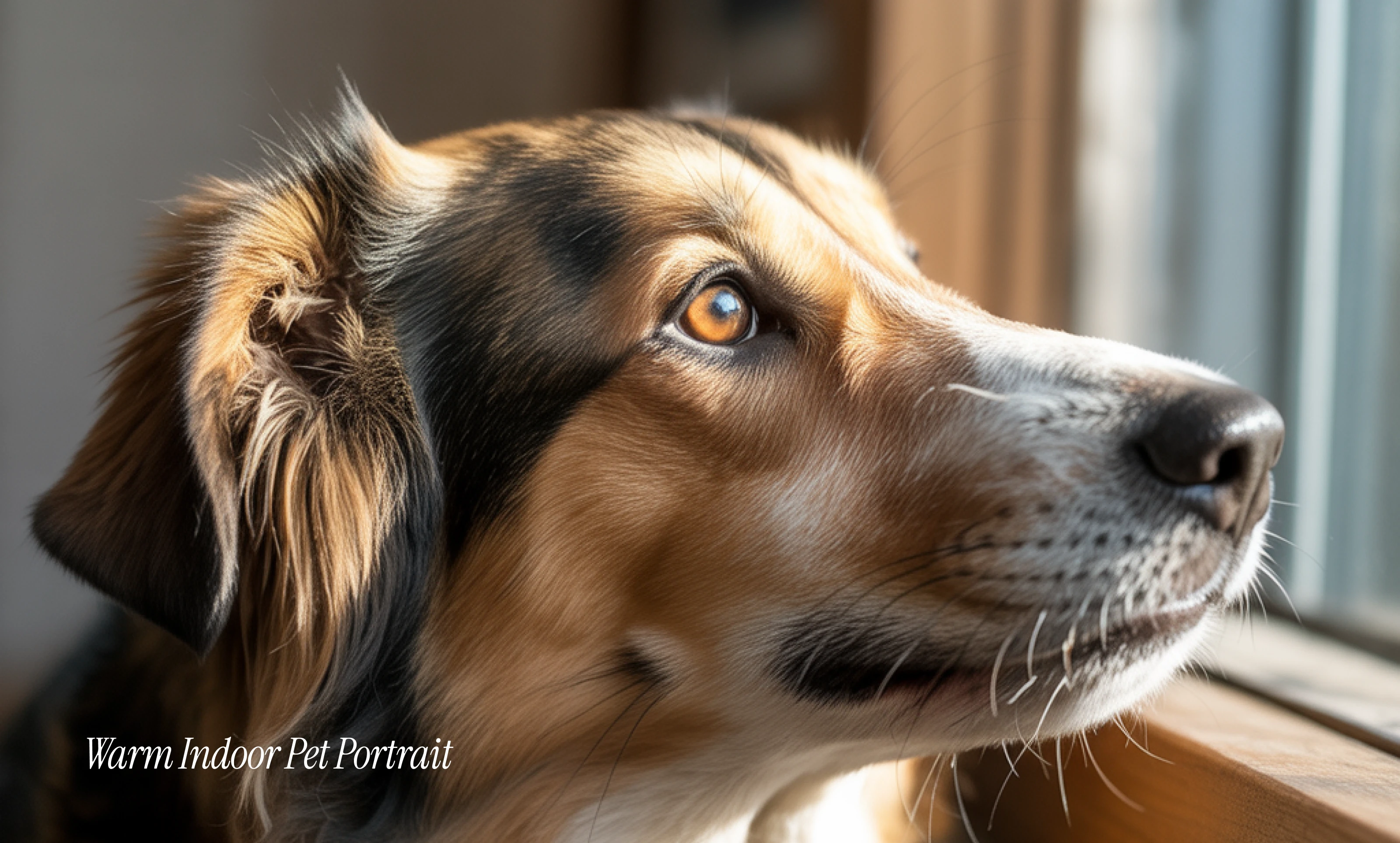 Cinematic close-up portrait of a dog gazing toward warm sunlight, golden hour light casting soft shadows on its face, expressive bright eyes, detailed fur texture, calm indoor setting, rich contrast and warm tones, high-quality pet photography style