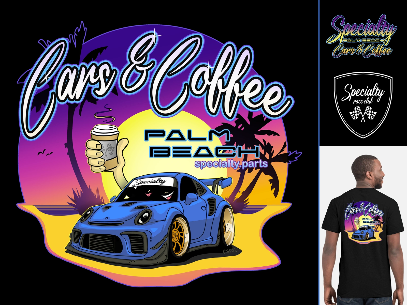 This was hand drawn digital T-shirt design created in photoshop for Specialty Parts specifically for their merch booth at the Cars and Coffee Palm Beach.