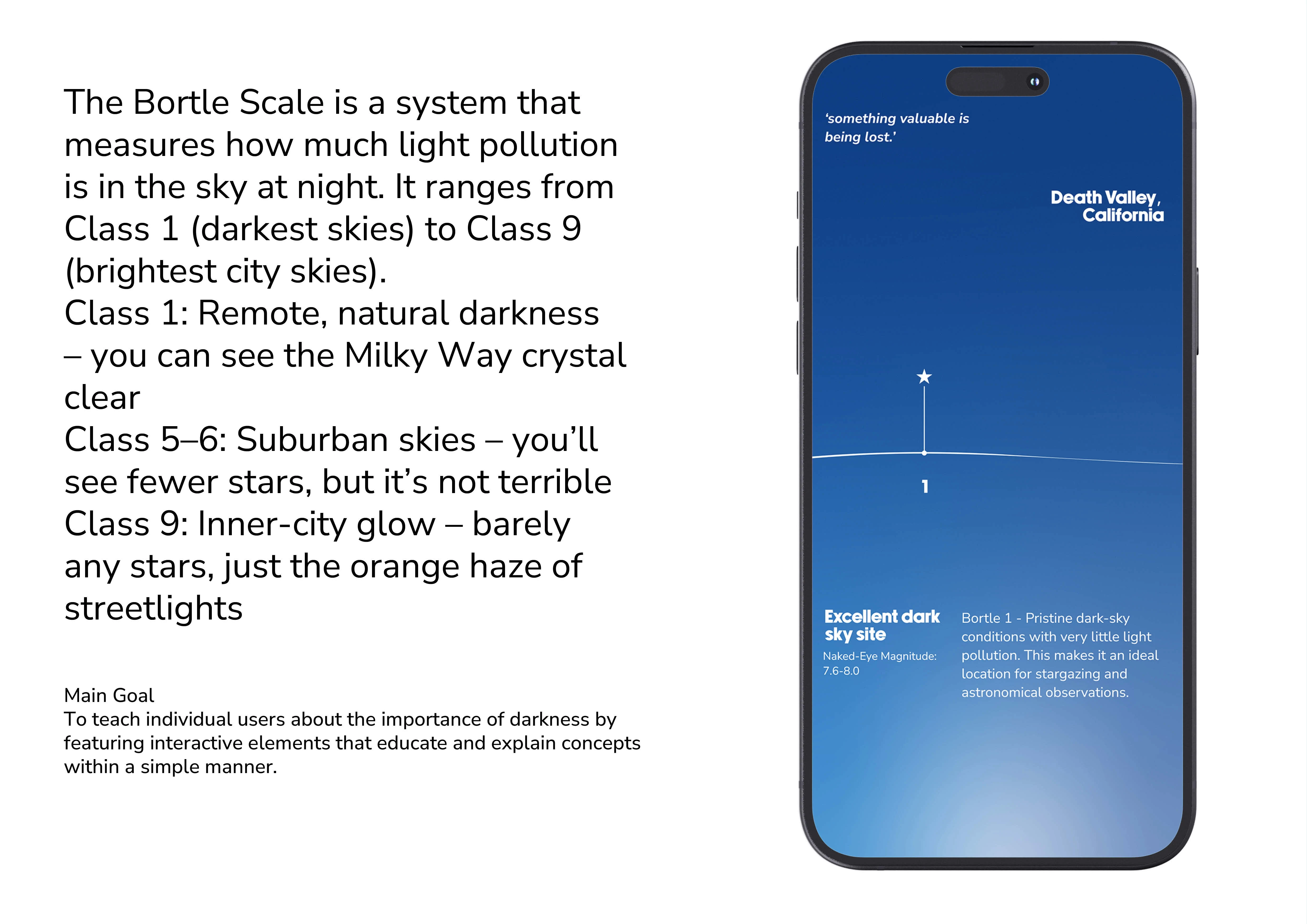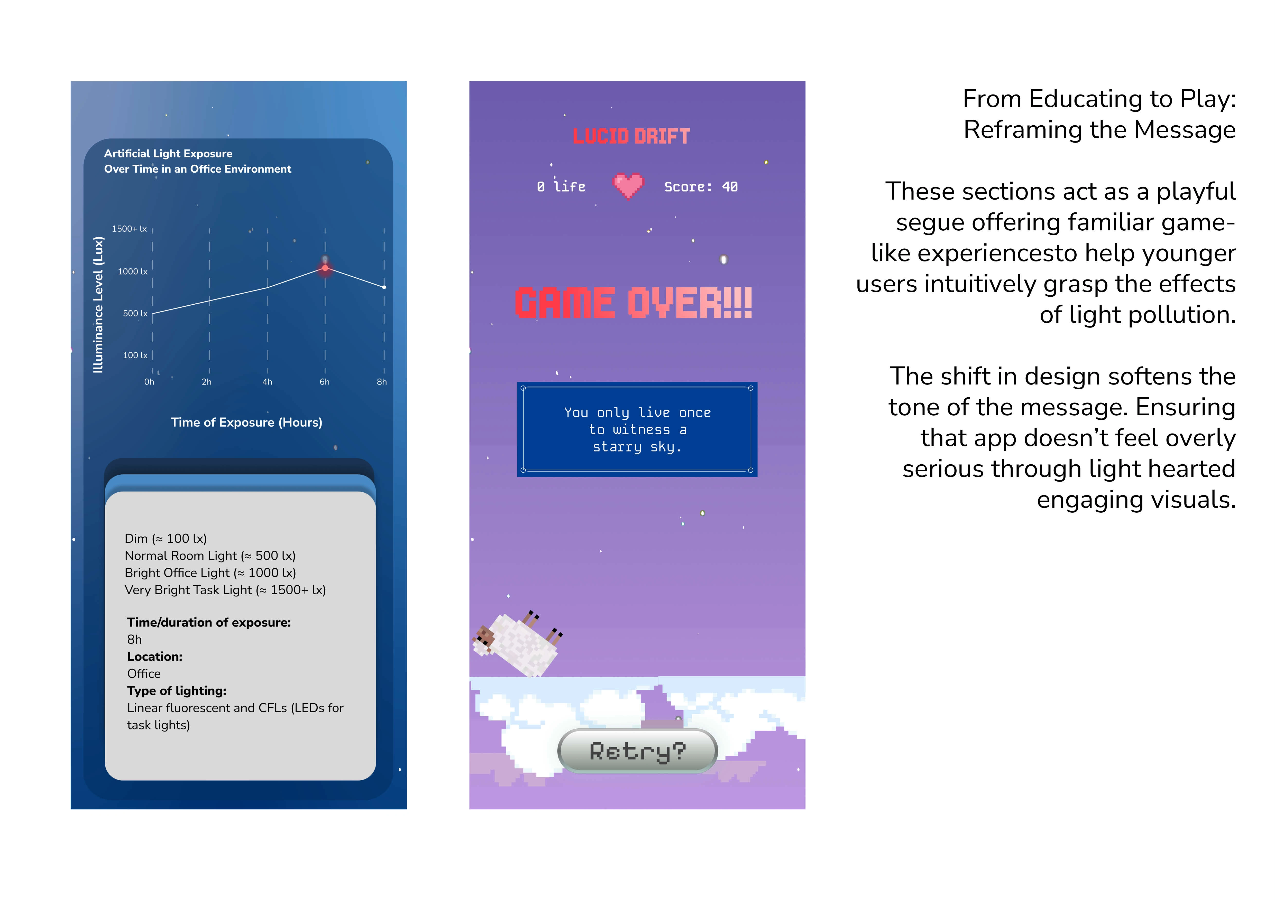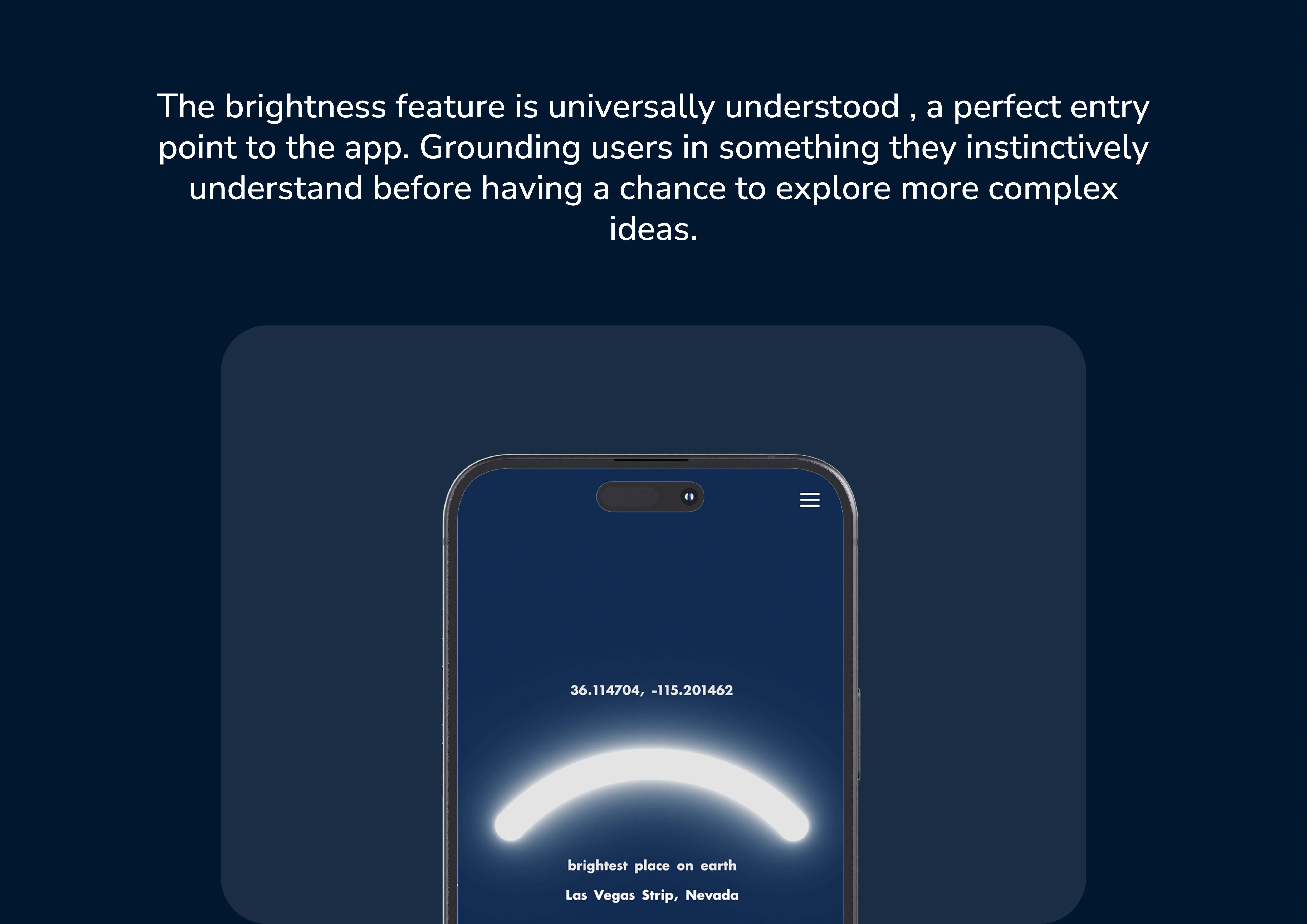 It didn't take long to realise through research and design, that documenting the impacts of light pollution on the human body and health - particularly melatonin production and natural sleep cycles, should be a topic that is well addressed and spoken about. From here it became clear what was required: refocusing the app back to solving the core problem, and integrating seamless and engaging design experiences. Documenting these effects not through chart and text-heavy screen but through immersive and intuitive design.