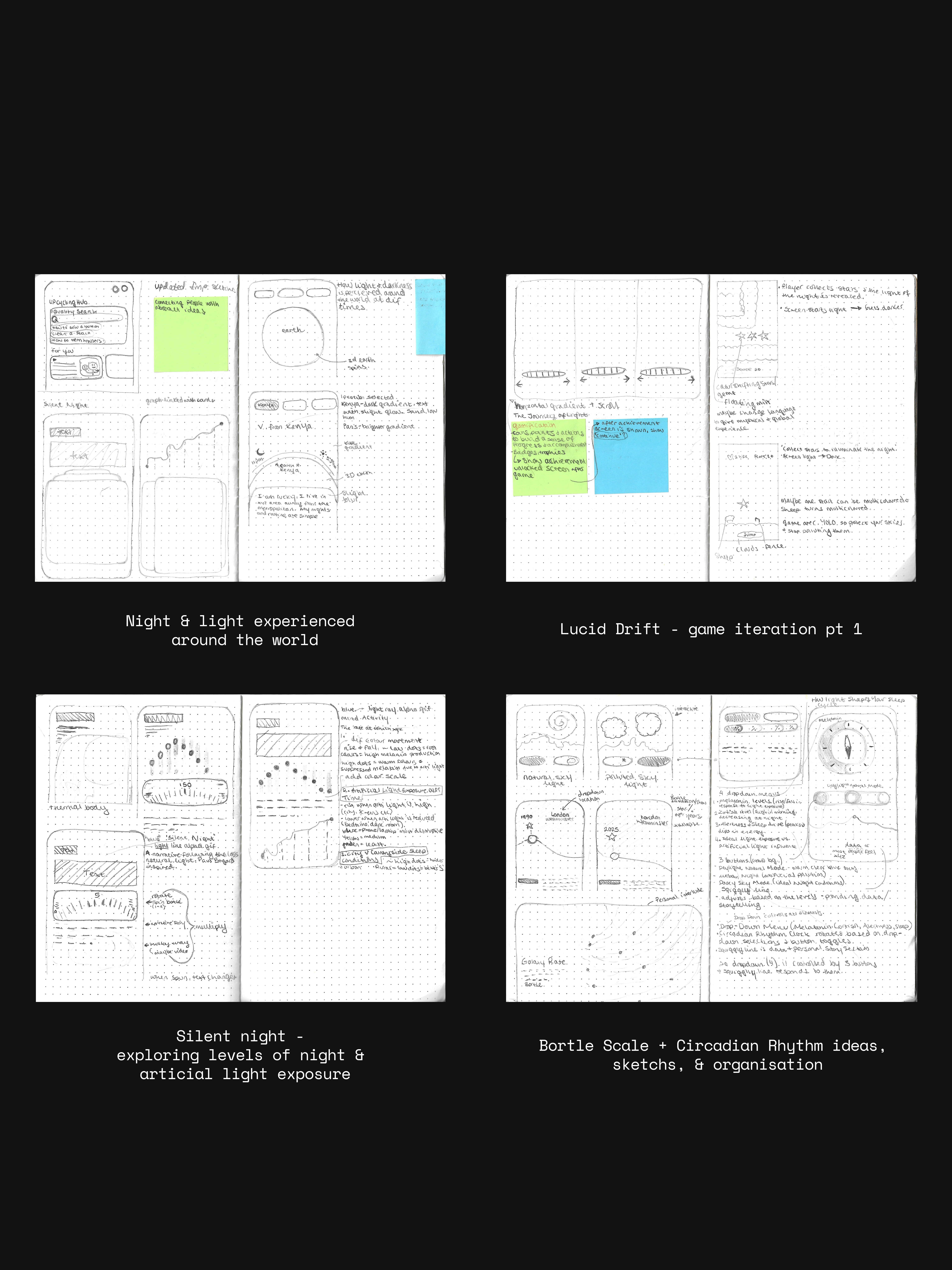 I explored a wide range of visual formats to communicate hormone rhythms and light exposure; ranging from metaphor-based UI elements, glowing dots and motion trails. Through feedback from peers ensured that the interface remained both scientifically grounded and intuitive for younger, non-expert users. Furthermore, the feedback also inspired visual cues to bridge the gap between everyday familiar tech habits and biological awareness.