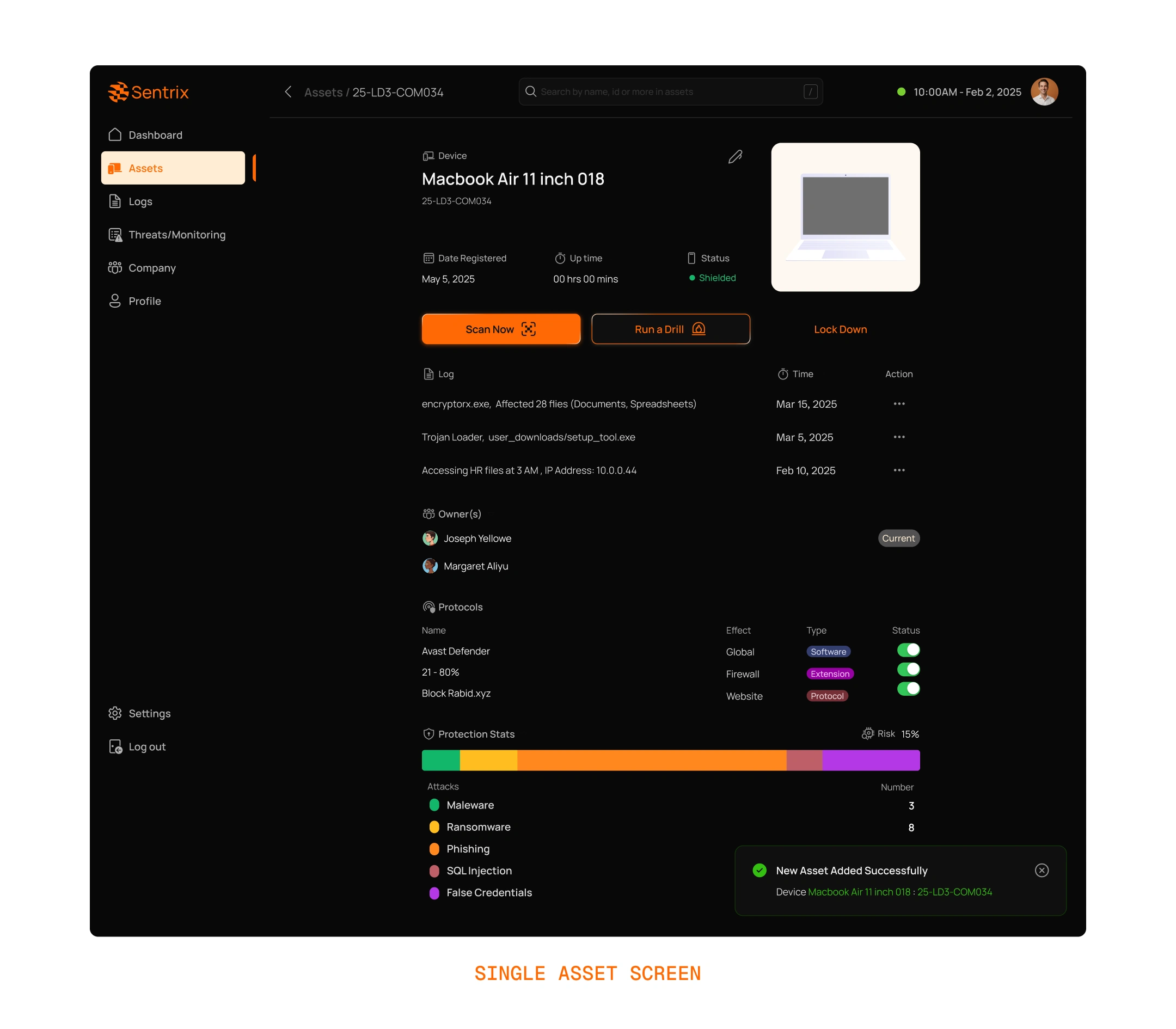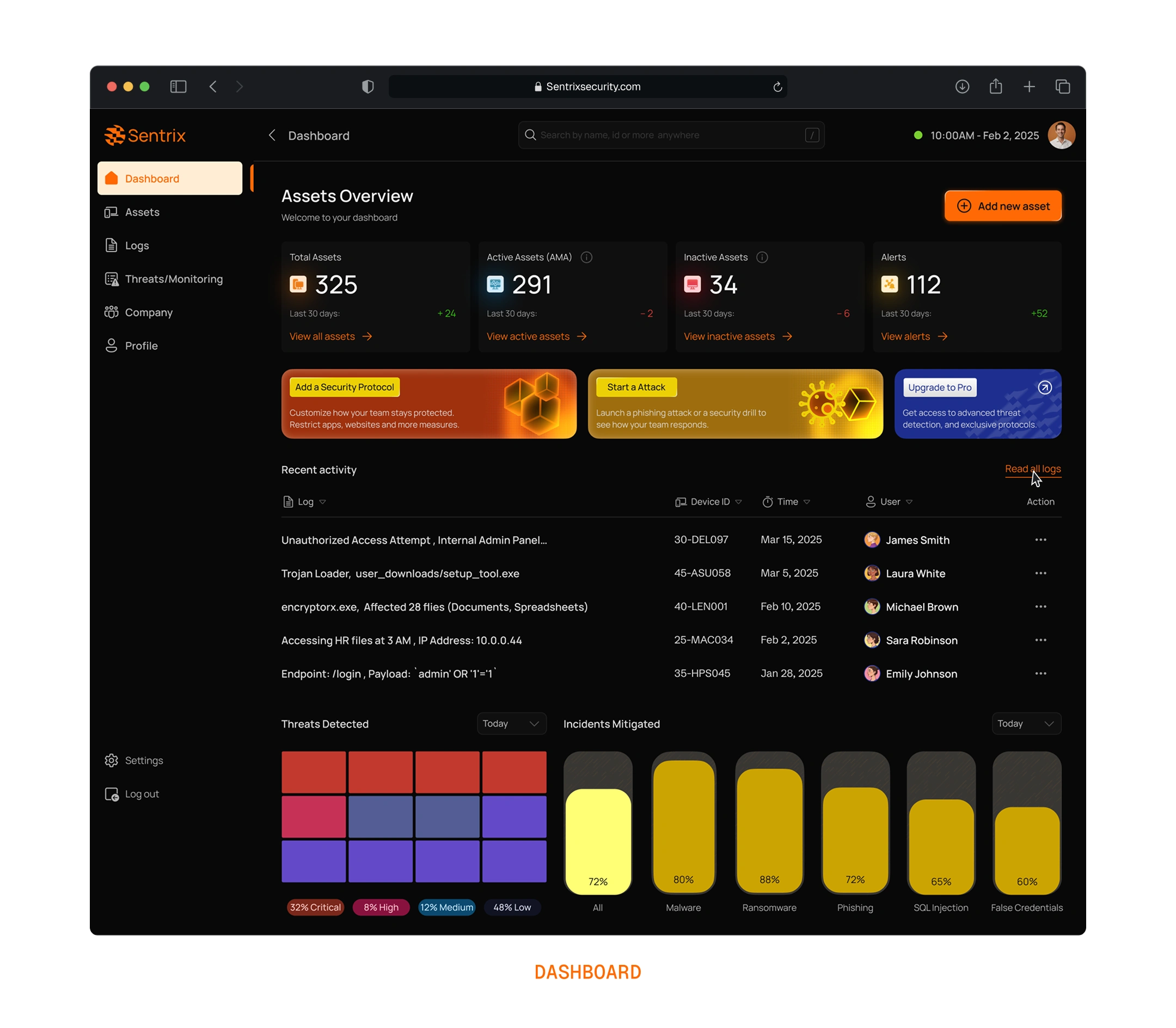 The product design intentionally avoided fear-based patterns. Dashboards were simplified to focus on assets, alerts, and incidents with clear status indicators. Logs were grouped into readable incidents. By designing for confidence instead of fear, Sentrix helped users stay engaged, take action sooner, and trust the product as a reliable security partner rather than a source of stress.