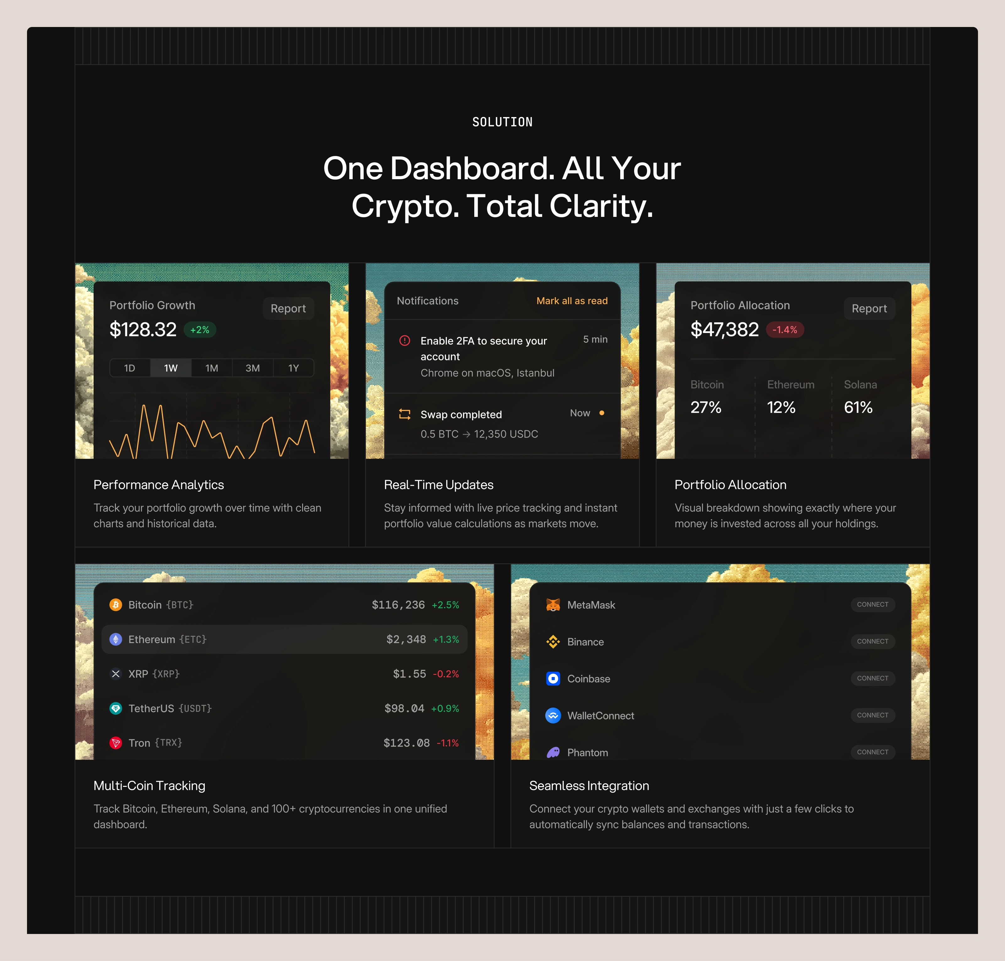 Crypto investors struggle with scattered assets across multiple platforms and inconsistent tracking tools. CoinDash needed a simple landing page that builds trust, showcases features clearly, and pushes users to connect their wallets.