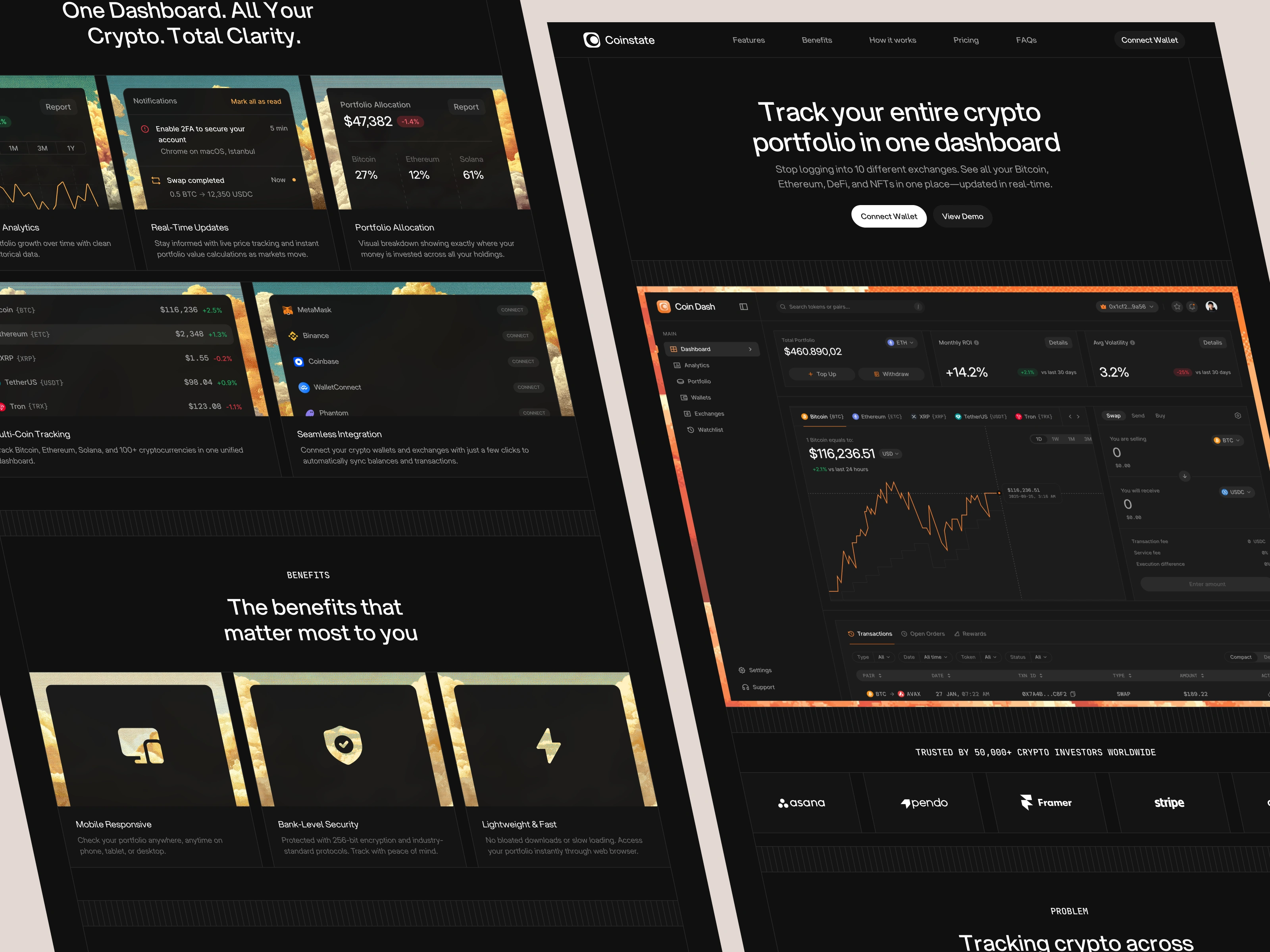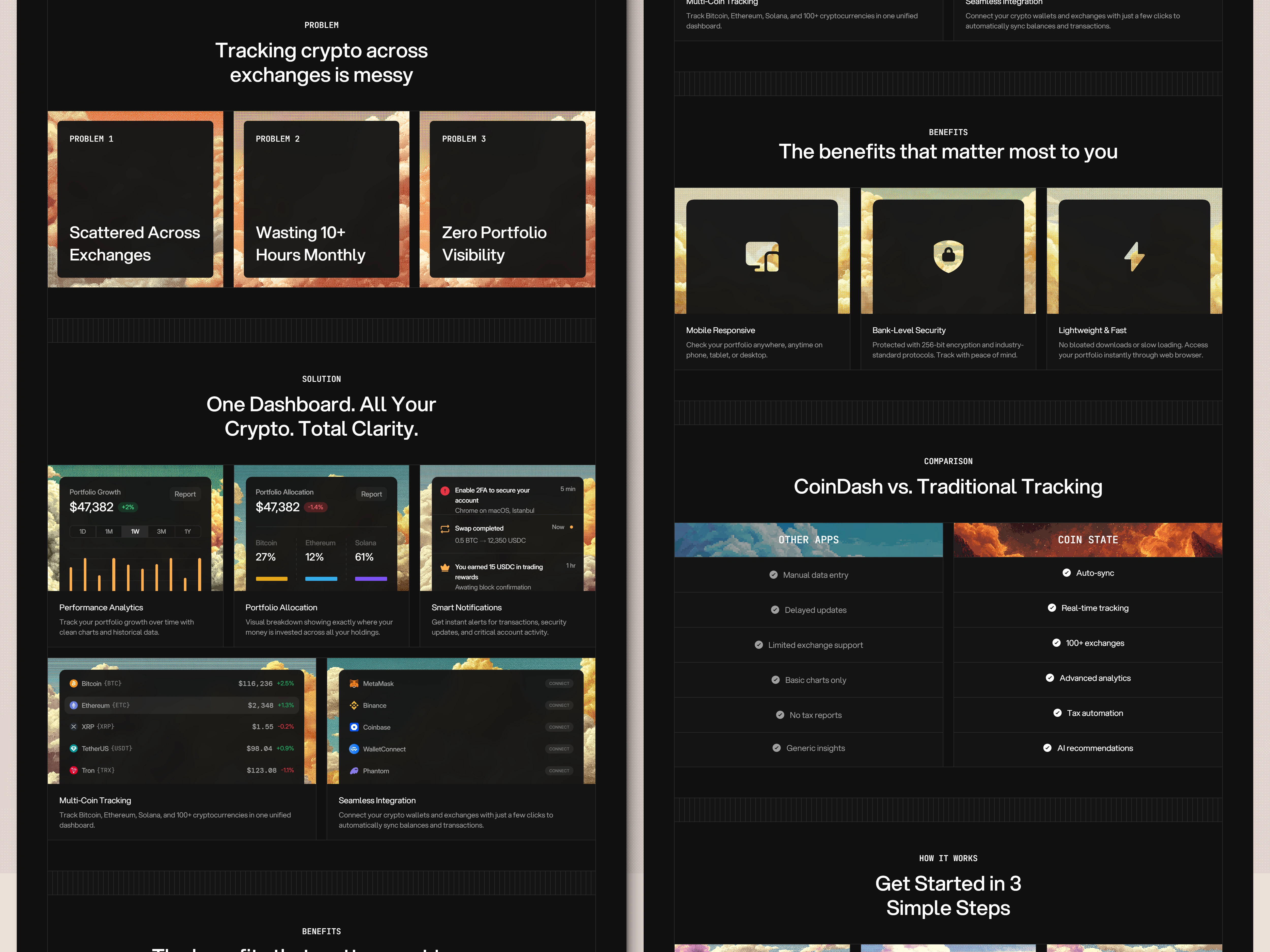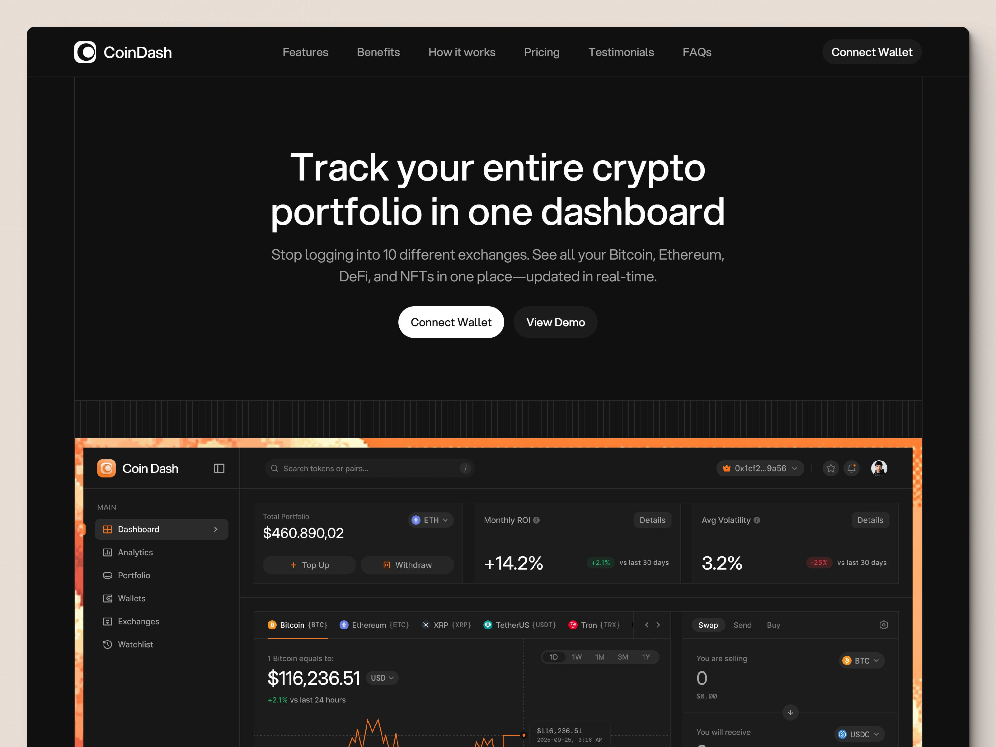 CoinDash is an AI-powered crypto portfolio tracker that helps investors monitor all their holdings across multiple exchanges and wallets in one unified dashboard. The landing page was designed to clearly explain the platform's value and drive wallet connections.