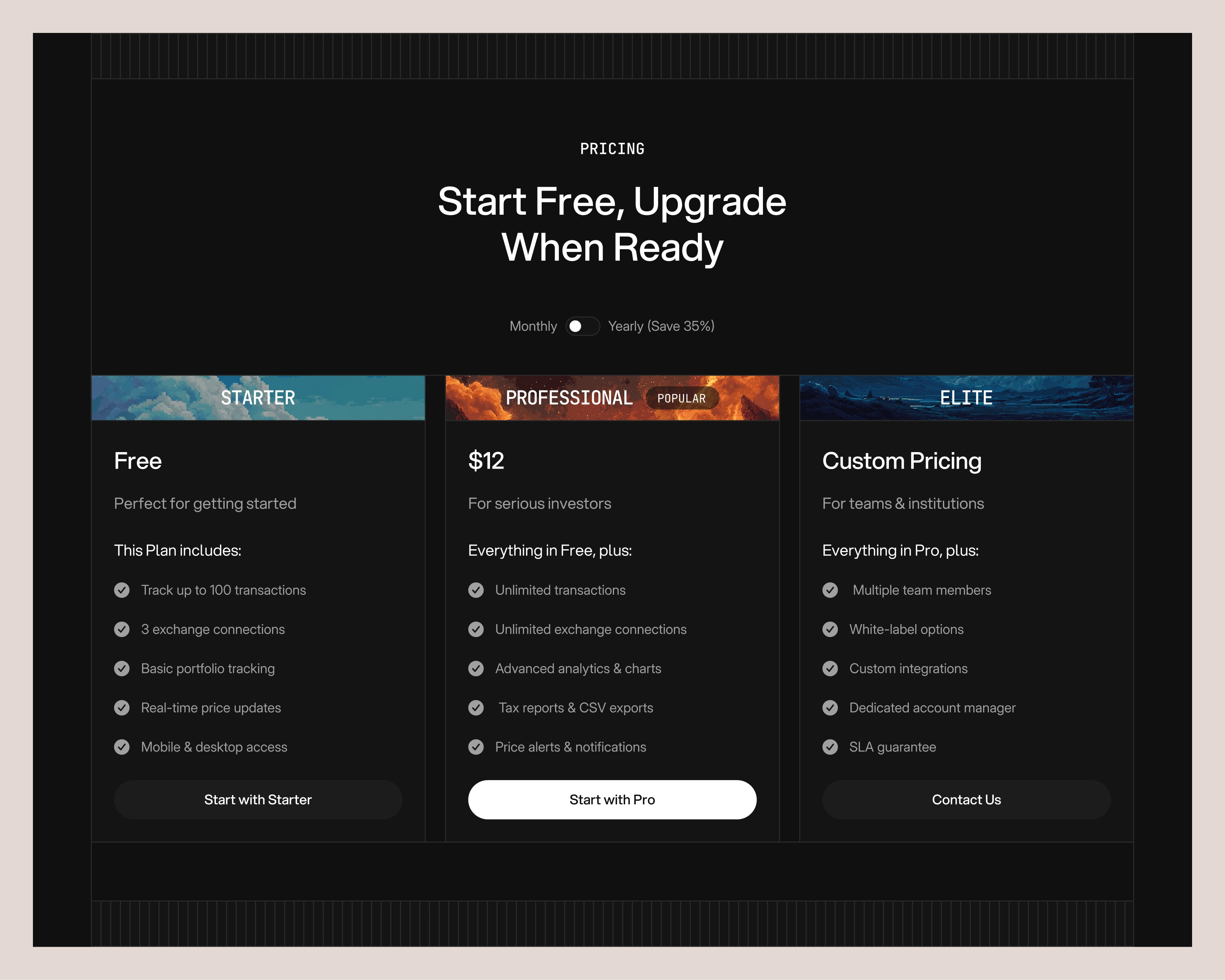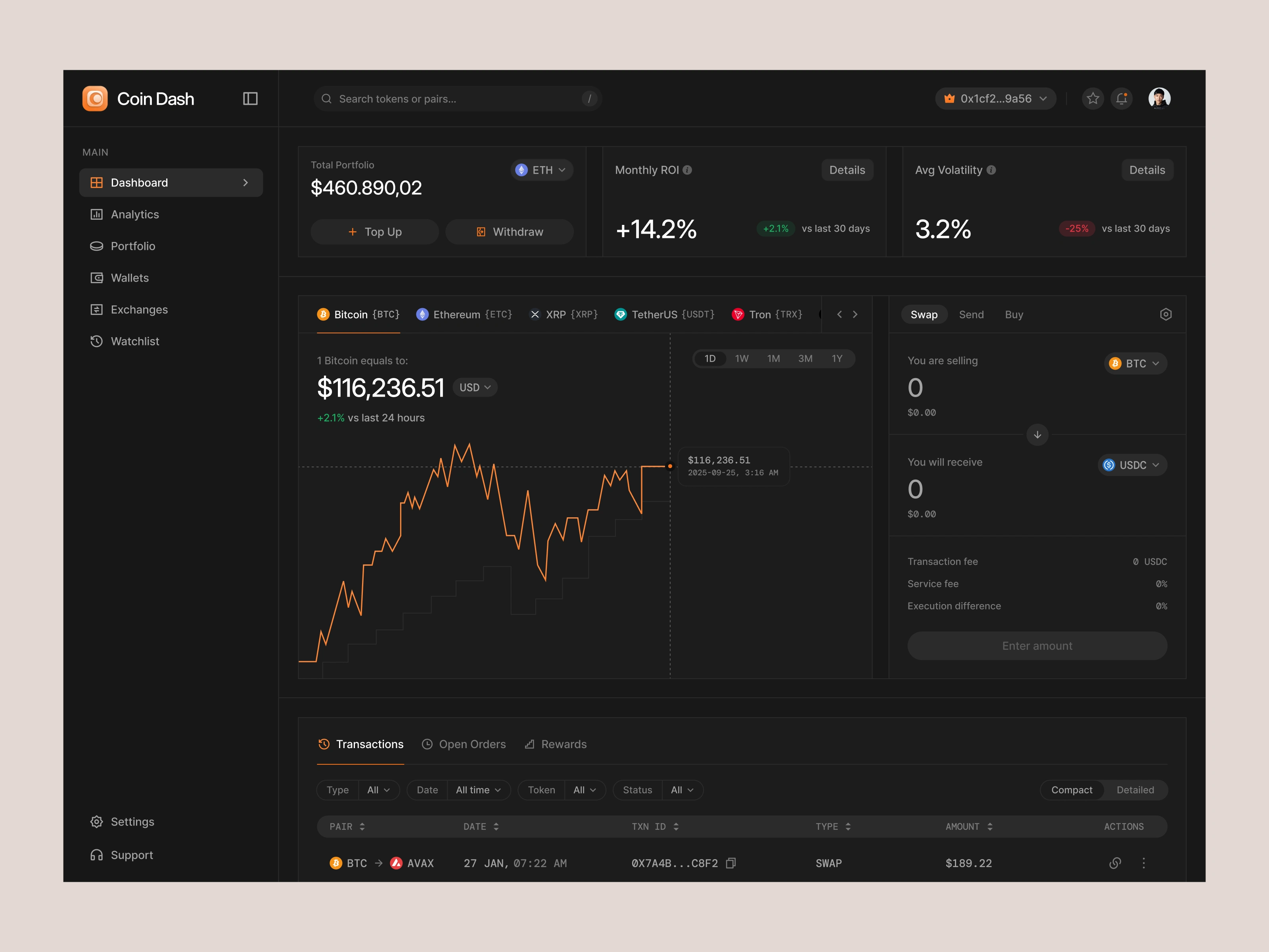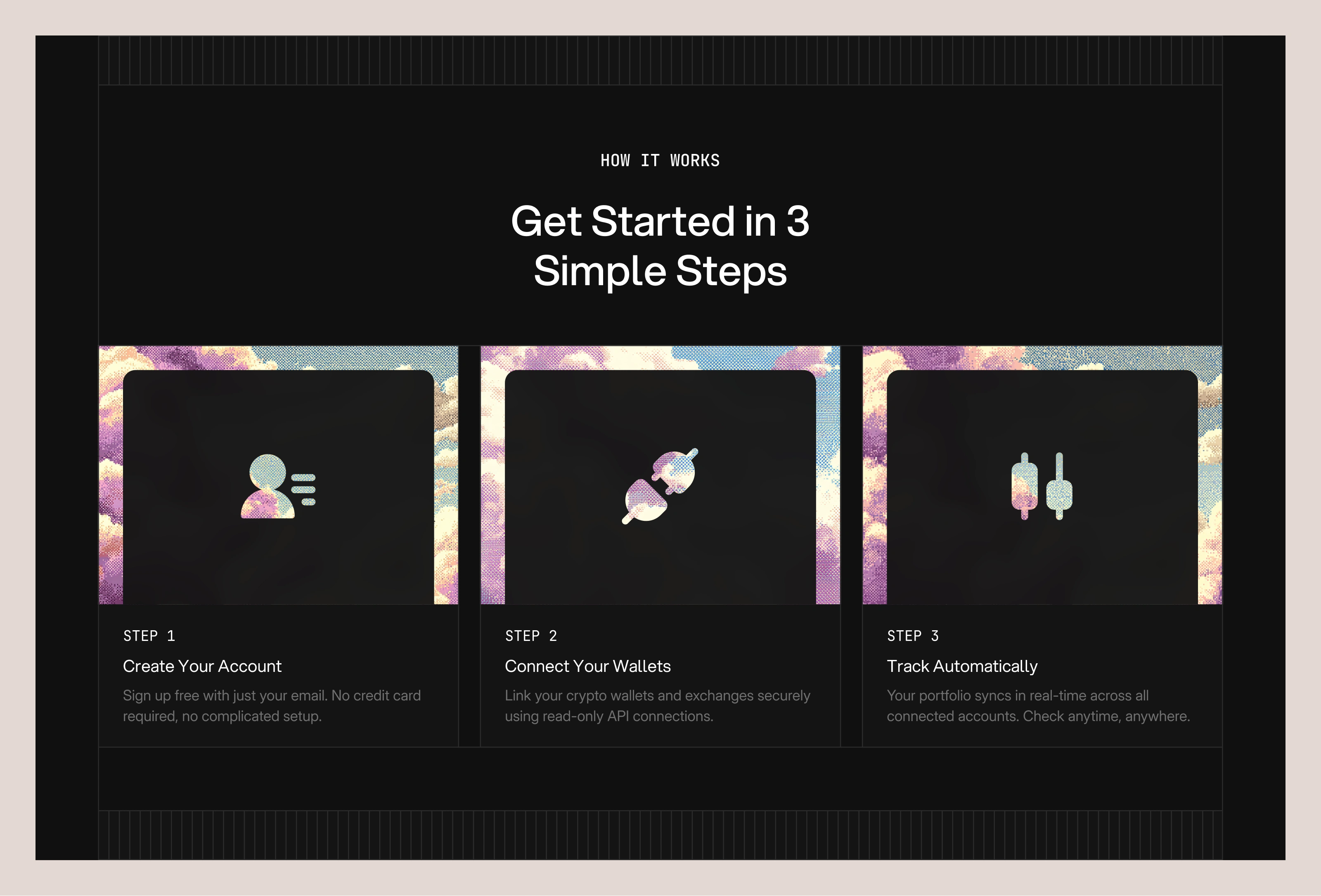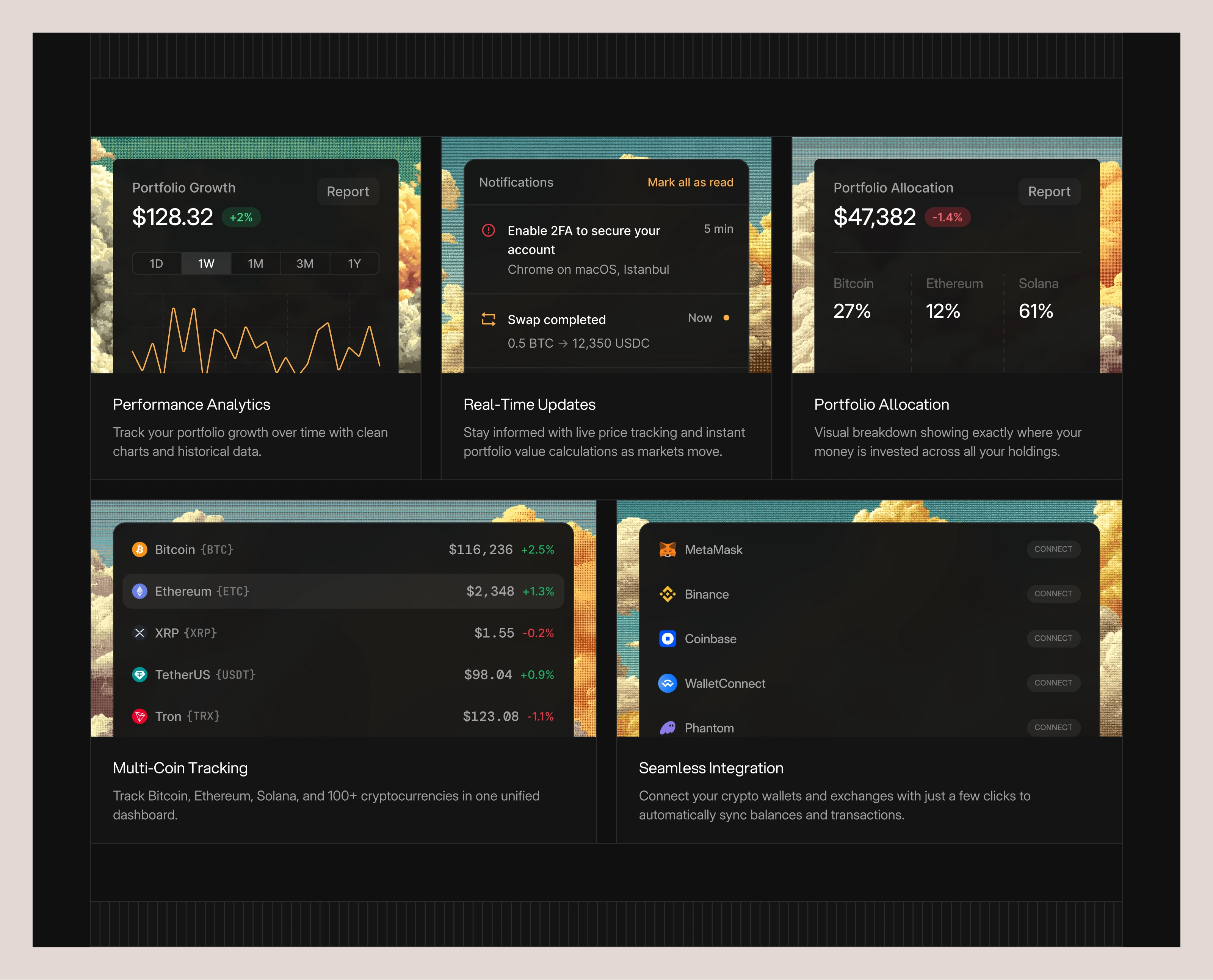 CoinDash is an AI-powered crypto portfolio tracker that helps investors monitor all their holdings across multiple exchanges and wallets in one unified dashboard. The landing page was designed to clearly explain the platform's value and drive wallet connections.