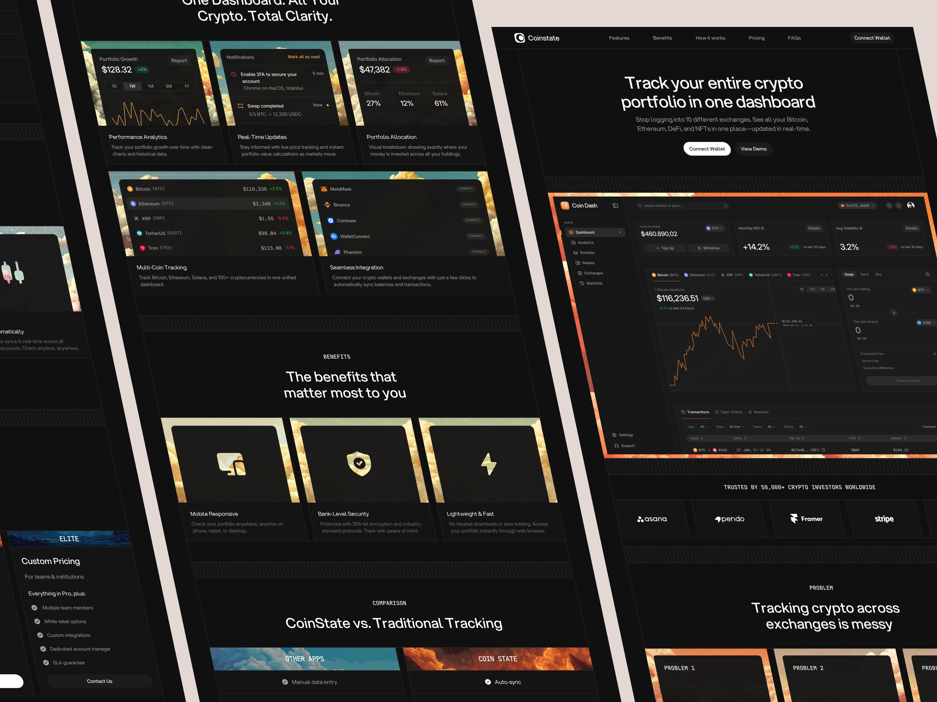 The landing page was designed to clearly communicate CoinDash's crypto tracking and drive wallet connections through clean messaging and feature showcases.