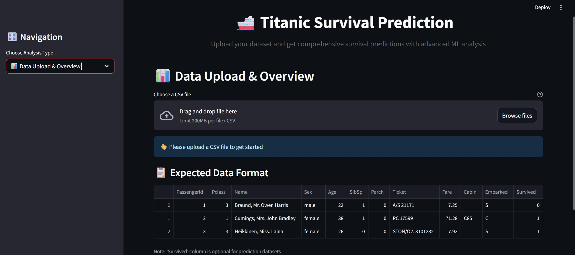 http://localhost:8501Input/For training/ foldertrain.csv fileInput/For testing/ foldertest.csv filePassengerId: Unique identifier (integer)Pclass: Passenger class (1=First, 2=Second, 3=Third)Name: Passenger name (string)Sex: Gender (male/female)Age: Age in years (numeric, can have missing values)SibSp: Number of siblings/spouses aboard (integer)Parch: Number of parents/children aboard (integer)Ticket: Ticket number (string)Fare: Passenger fare (numeric, can have missing values)Cabin: Cabin number (string, can be empty)Embarked: Port of embarkation (C=Cherbourg, Q=Queenstown, S=Southampton)Survived: Survival status (0=Died, 1=Survived) - Required for trainingSurvived columnPosted Jul 6, 2025