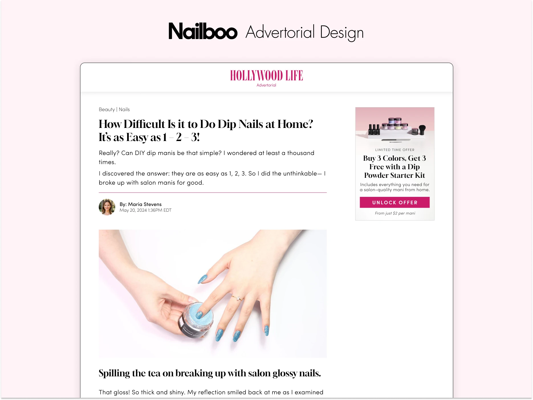 Advertorial design for Nailboo's Dip Kit in Hollywood Life.