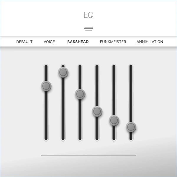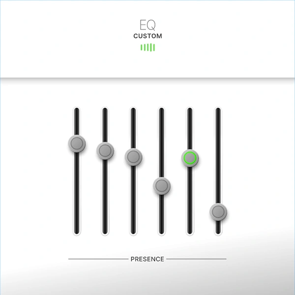 Audio EQ interface concept. Sliders have dynamic colors to display your audio peaking levels. Individual EQ sliders provide relatable names for sound frequencies instead of abstract numbers. A presets menu is intentionally limited to categories that are the most essential and memorable.