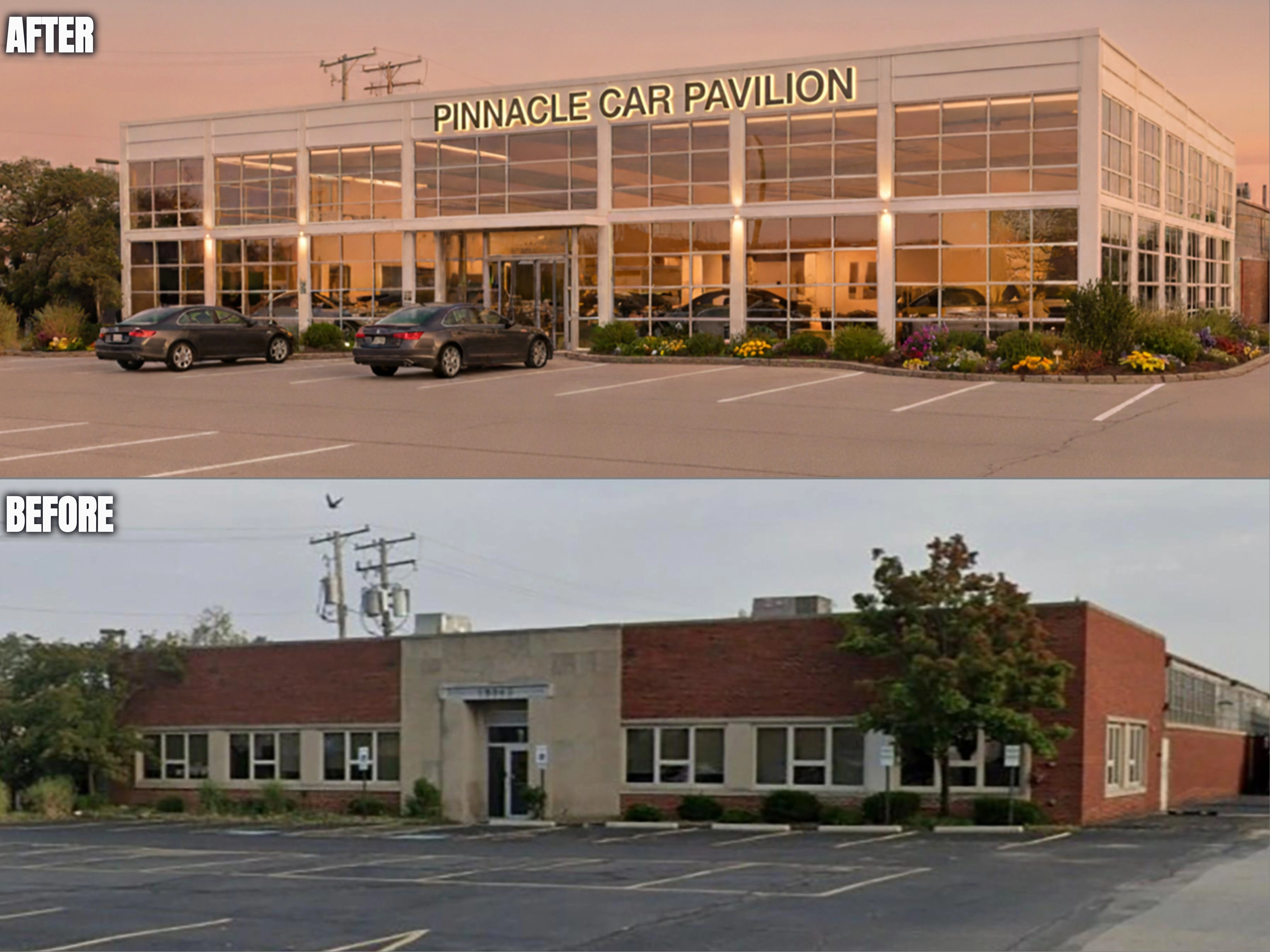 The Vision: The goal was to demonstrate the power of adaptive reuse by transforming the structure into a high-value commercial destination. The concept replaces the heavy, opaque facade with an expansive glass curtain wall, creating a bright, modern showroom that connects with the community. A clear brand identity ("Pinnacle Car Pavilion"), professional landscaping, and warm twilight lighting were added to complete the aspirational vision.