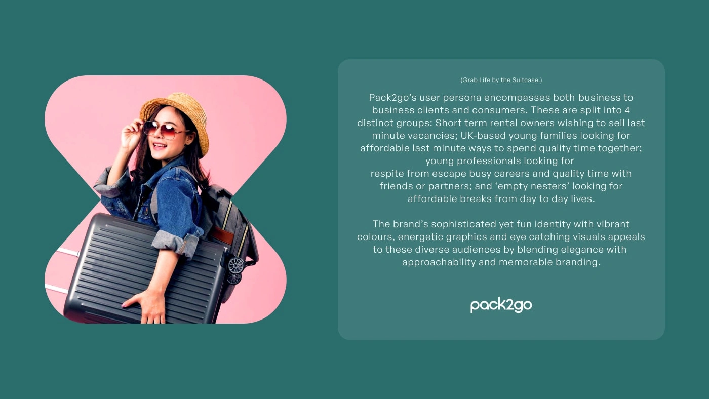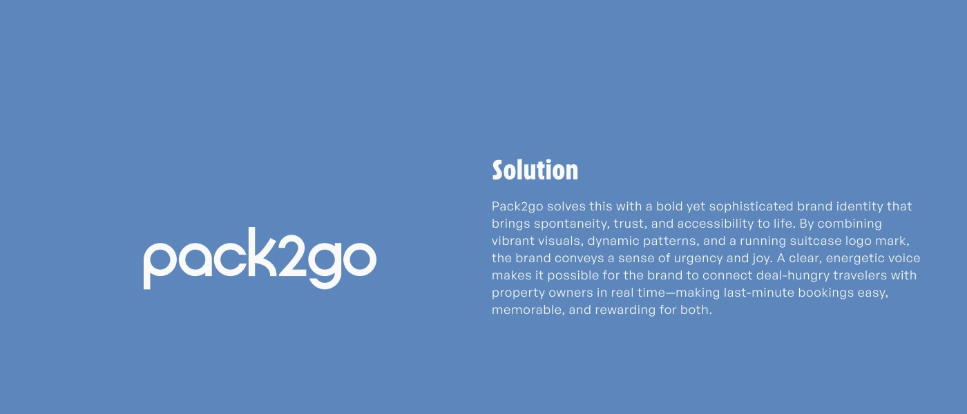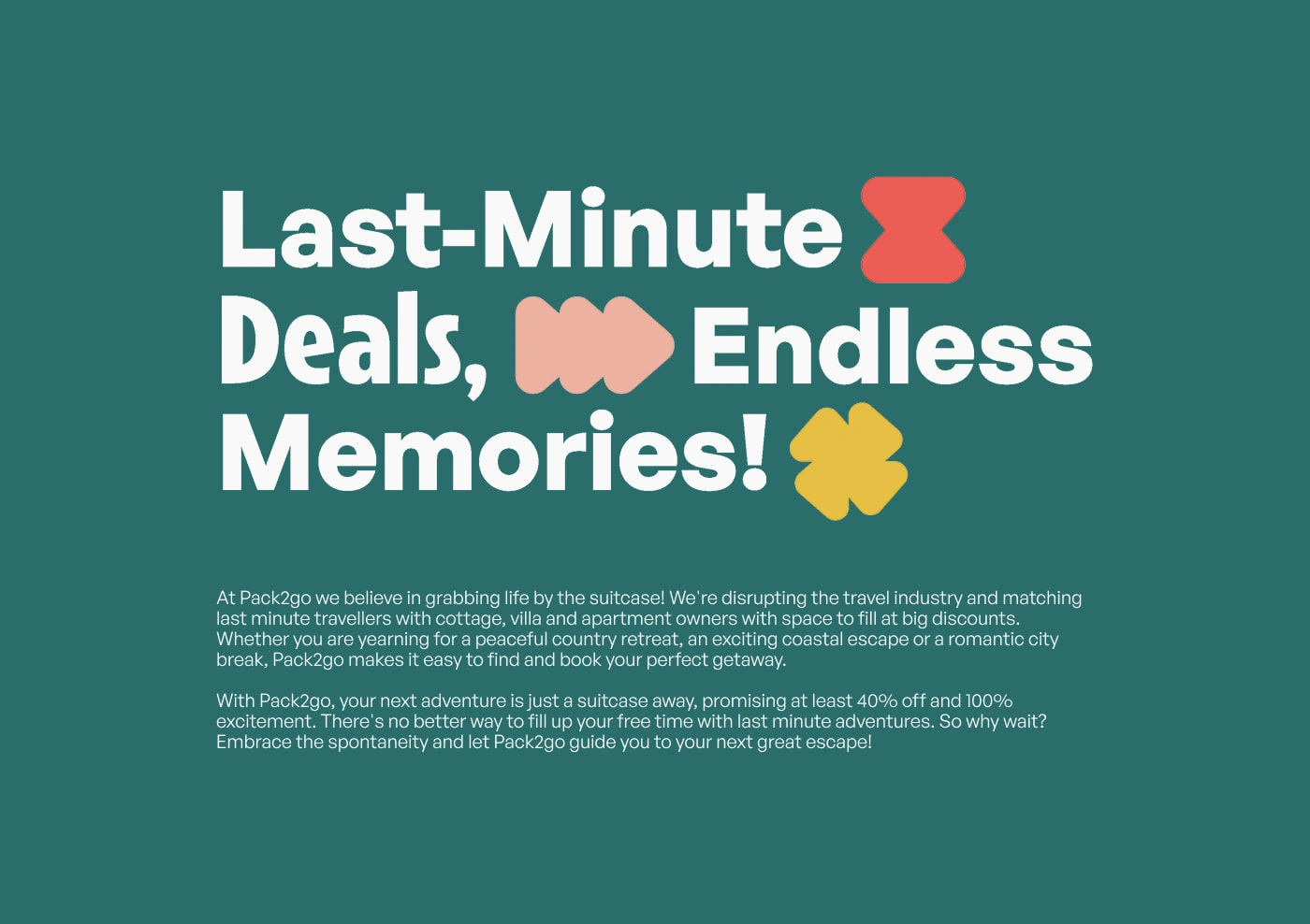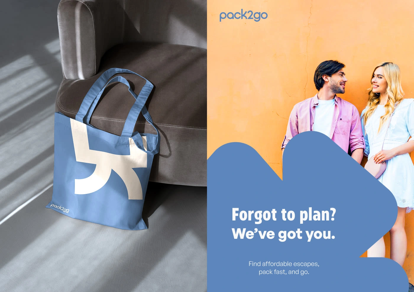 Pack2go is a vibrant travel platform designed for spontaneous getaways. The brand identity captures the thrill of last-minute adventures with a bold yet sophisticated logo, dynamic visuals, and energetic patterns. Aimed at travelers and property owners alike, Pack2go blends affordability with excitement—offering a fresh, approachable visual language that reflects its mission: to turn last-minute bookings into lasting memories.