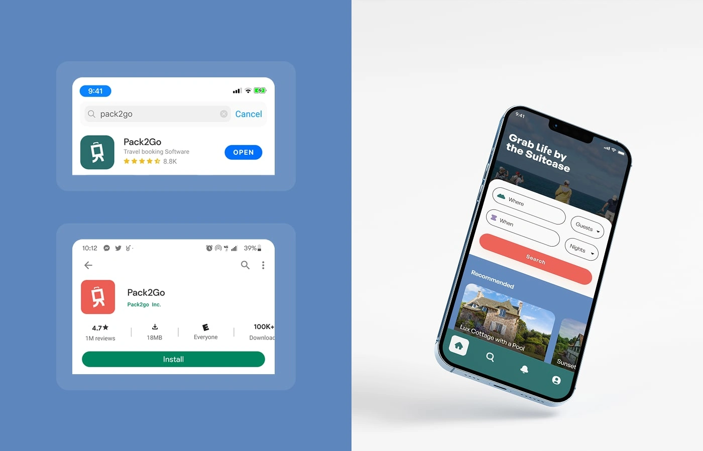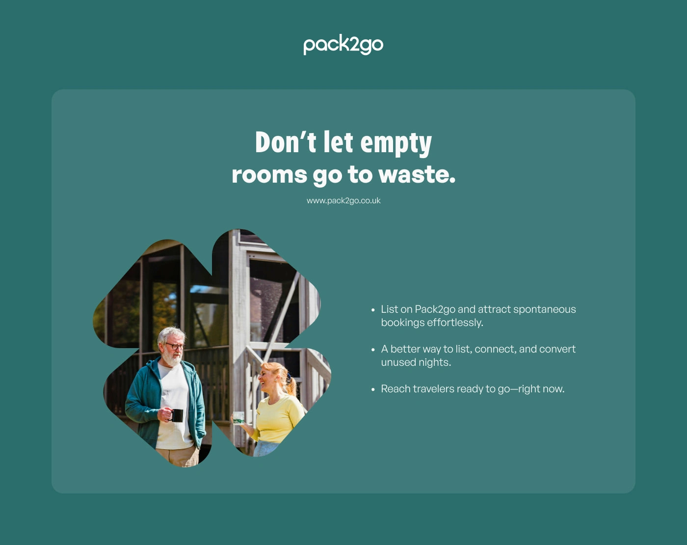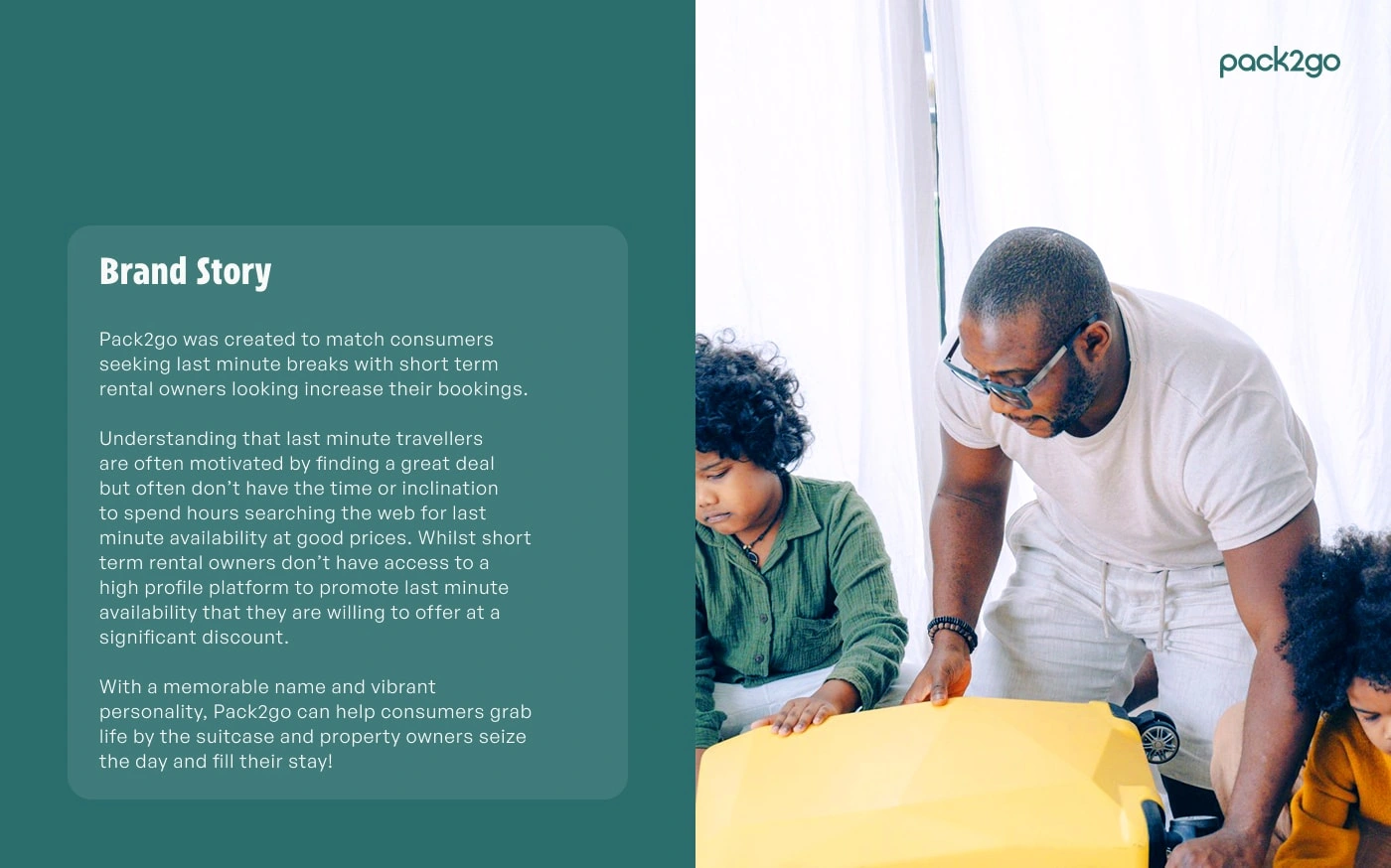 Pack2go is a vibrant travel platform designed for spontaneous getaways. The brand identity captures the thrill of last-minute adventures with a bold yet sophisticated logo, dynamic visuals, and energetic patterns. Aimed at travelers and property owners alike, Pack2go blends affordability with excitement—offering a fresh, approachable visual language that reflects its mission: to turn last-minute bookings into lasting memories.