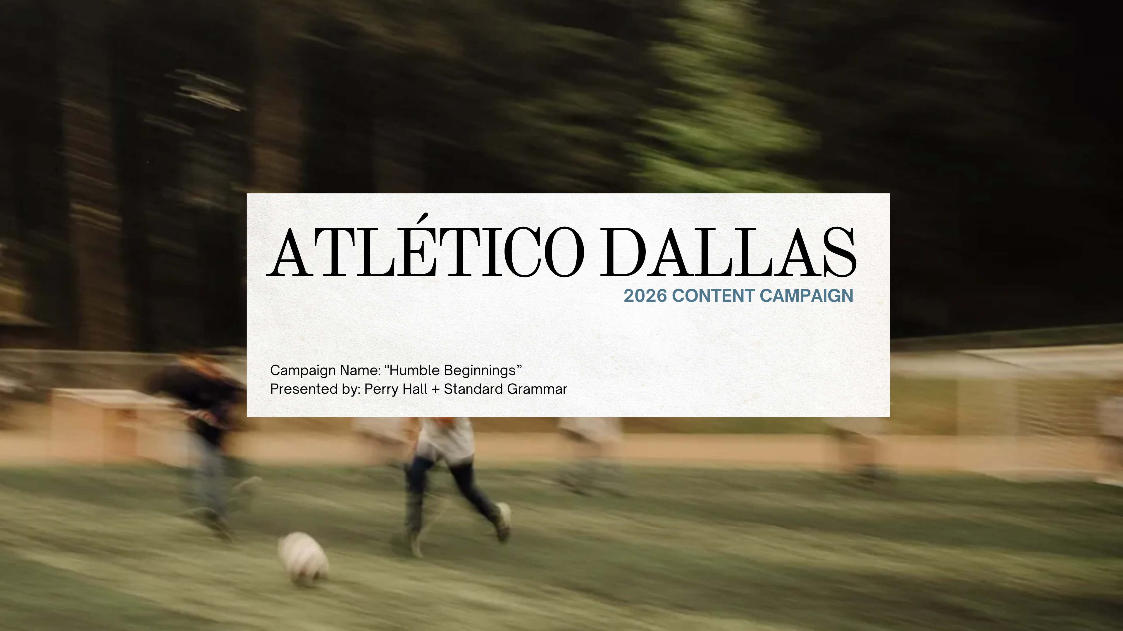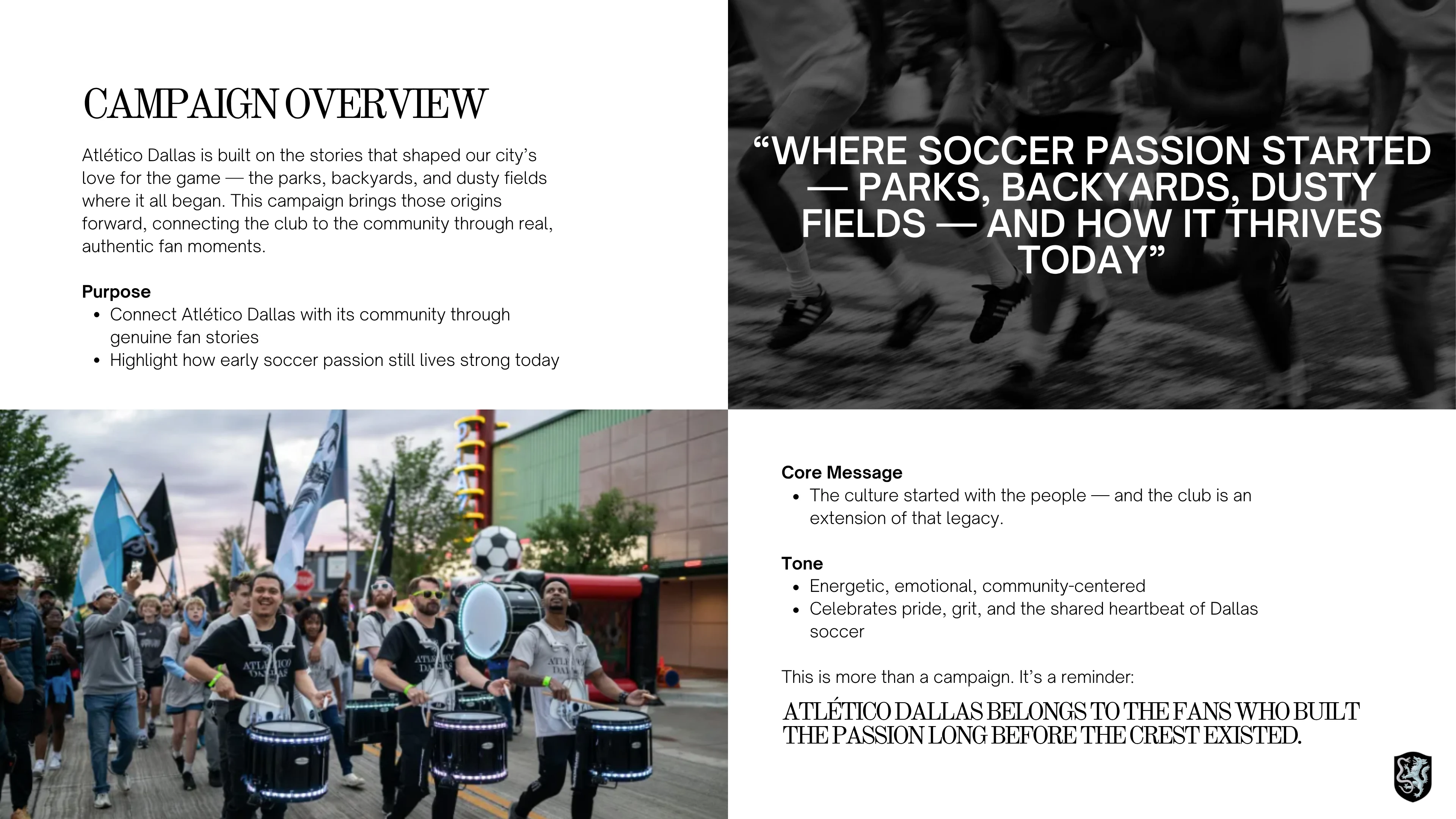 A polished, highly functional campaign deck that enabled the creative team to execute efficiently, while maintaining the energetic, authentic, community-focused tone central to Atlético Dallas’ brand.