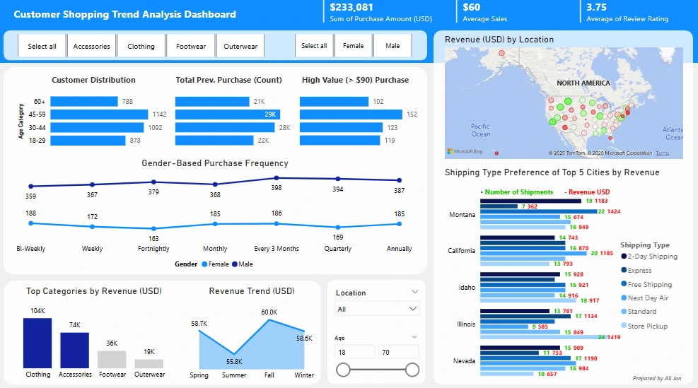 When it comes to fulfillment, shipping data from top-performing cities (Montana, California, Idaho, Illinois, Nevada) suggests a strong preference for Free Shipping and Store Pickup, especially in Illinois and Montana. Cities like Nevada and California lean more toward Next Day Air and 2-Day Shipping, reflecting possible urban demand for convenience or faster delivery expectations.