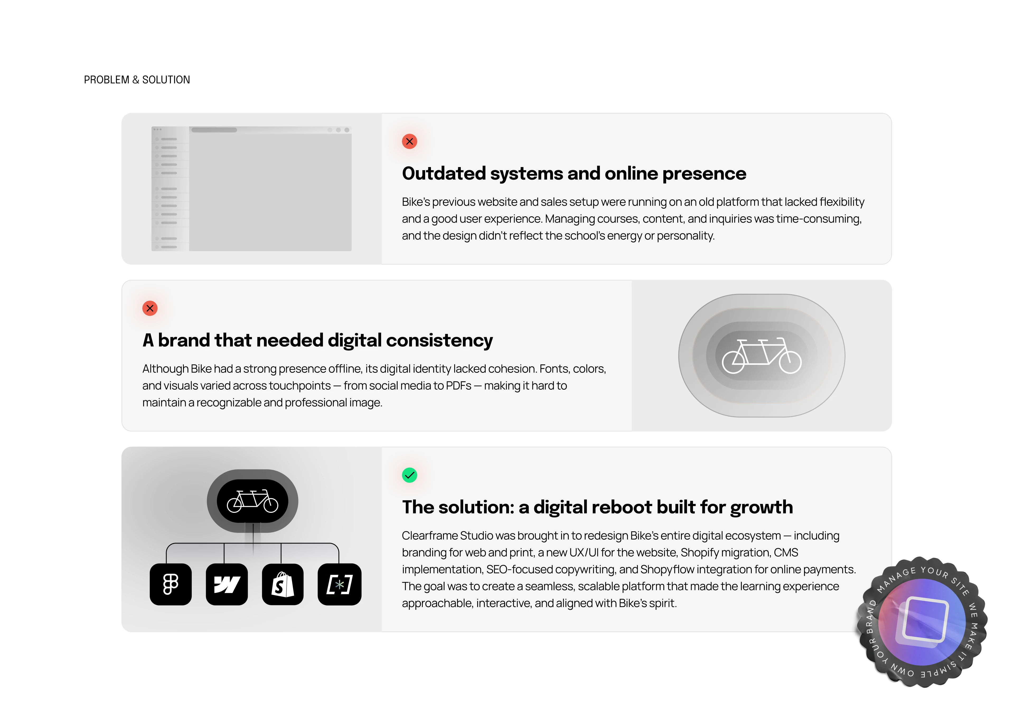 Problem – BIKE needed a modern site that clearly explained their programs without losing their distinctive tone, and that could guide both individuals and companies to the right next step.