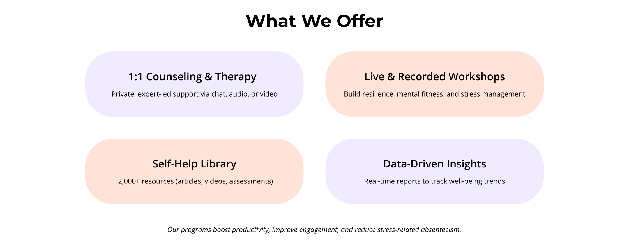 Four key services are presented in an organized, color-coded layout, making the information easy to scan. Each service description is short yet impactful, focusing on real benefits like resilience, stress management, and mental fitness.