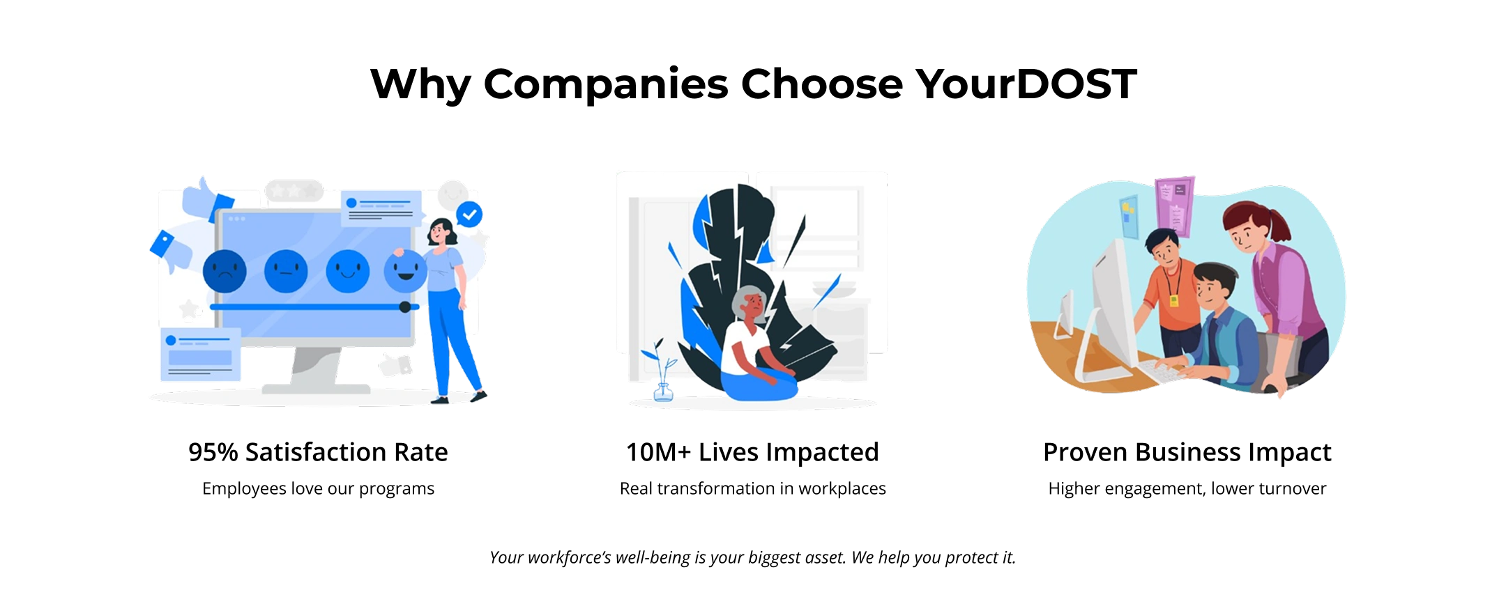 Building Trust: A dedicated space for YourDOST’s impact metrics & testimonials assures decision-makers that they are in good hands.