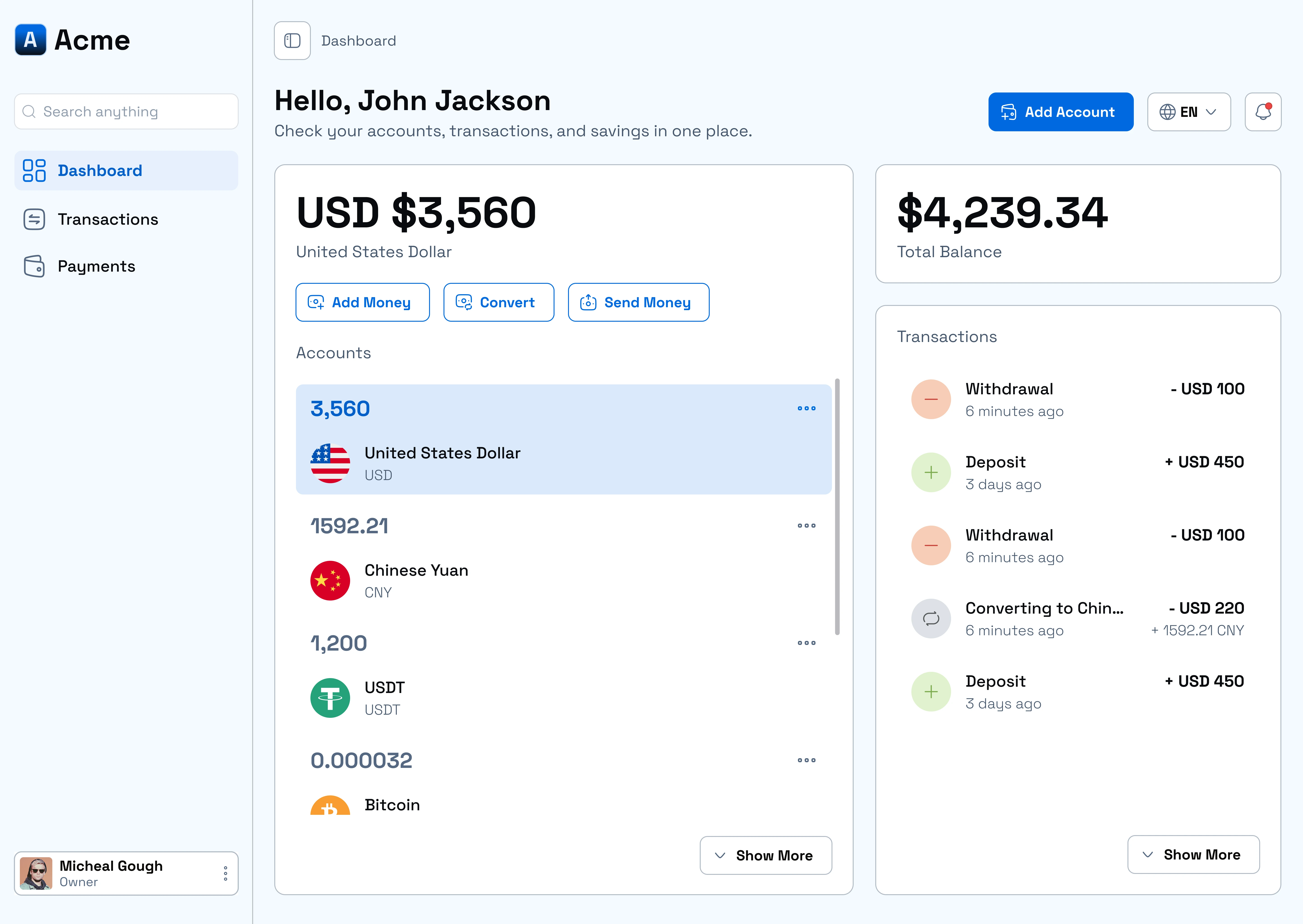 I designed a modern banking app for individuals and small businesses who need an easier way to manage money. Many users are underserved by traditional banks, so we focused on simplicity, clarity, and accessibility from the start.
