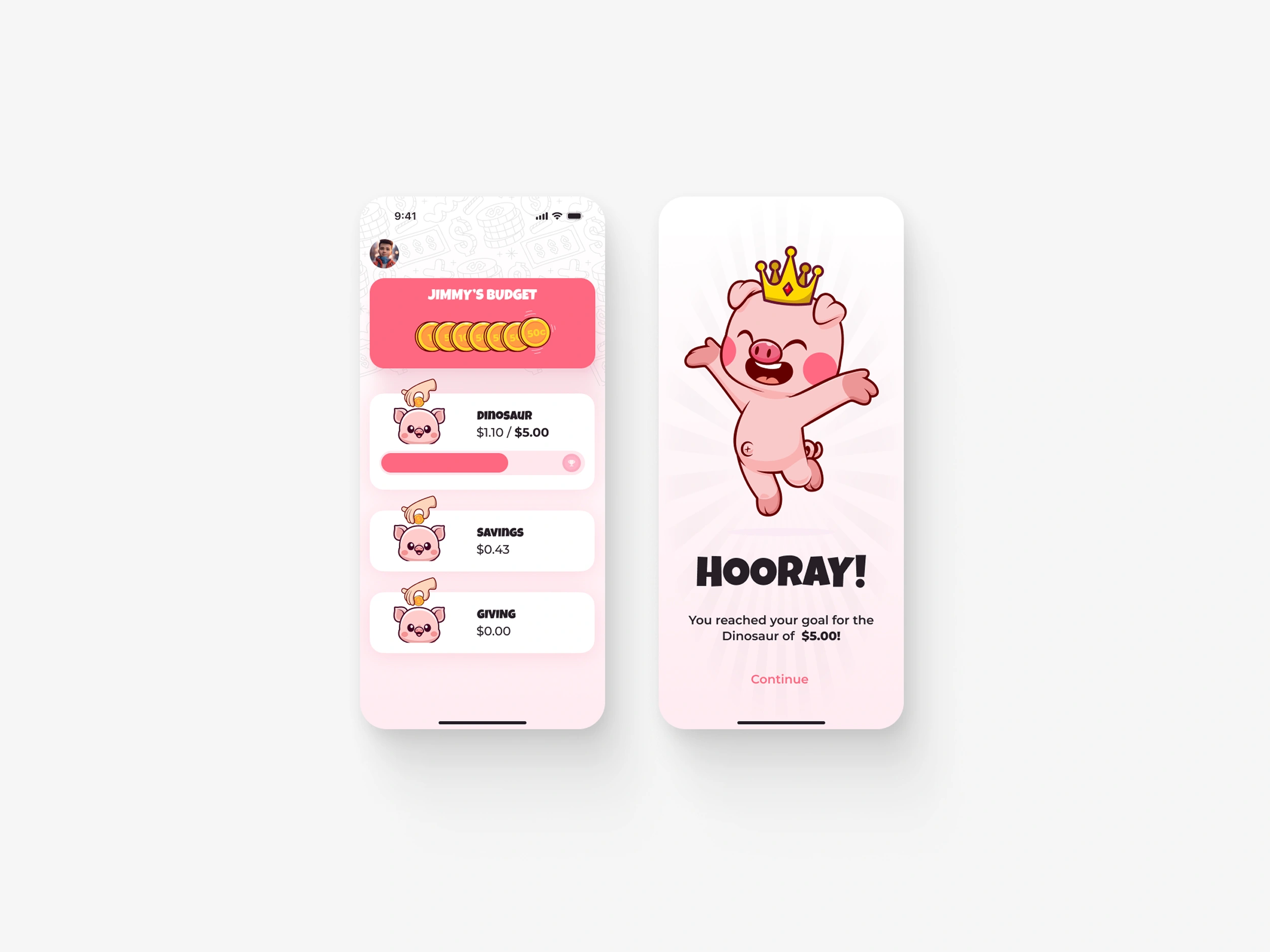 Create a playful budgeting interface where kids can assign coins to piggy banks for different goals (e.g., saving, giving), while parents retain control over setup, funding, and management.