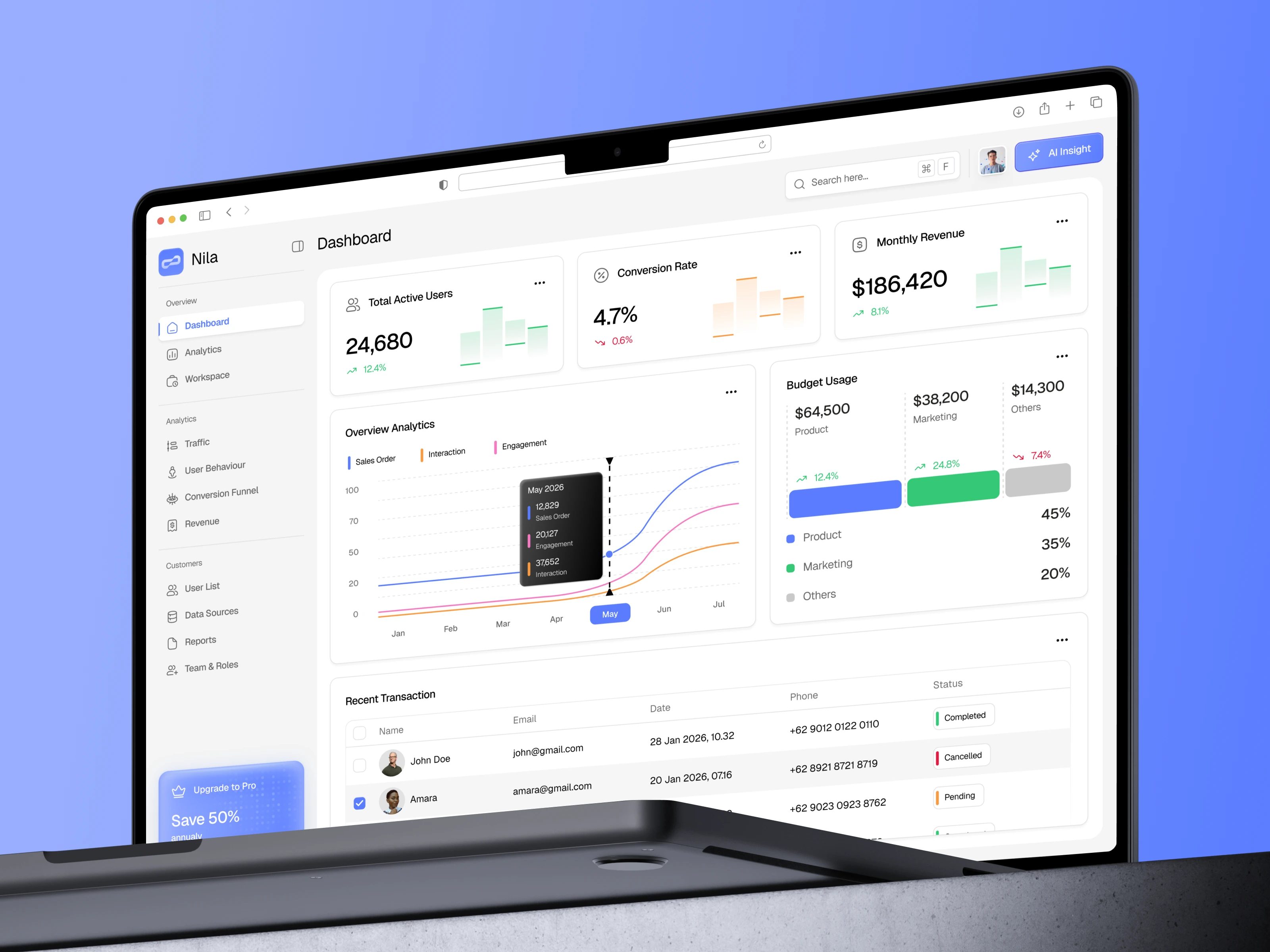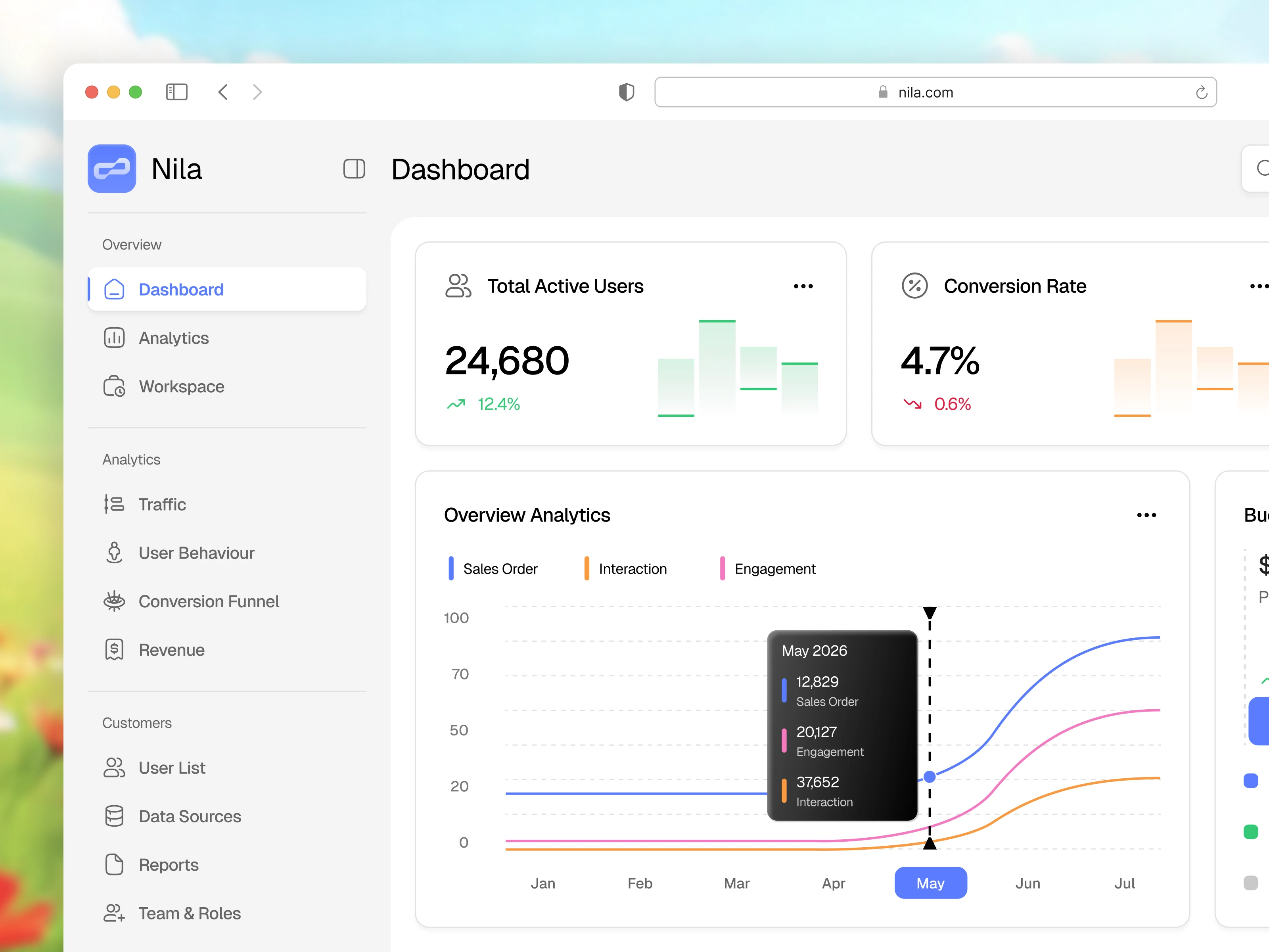 A modern analytics dashboard concept designed for Nila, a SaaS platform focused on performance tracking and business insights.