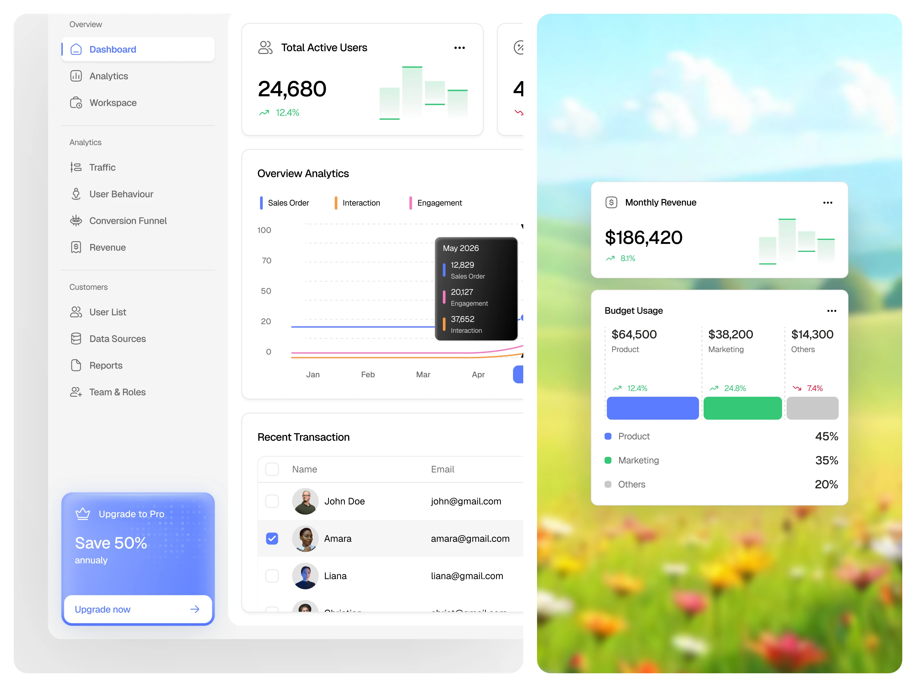 This interface prioritizes clarity, hierarchy, and data readability — helping teams monitor active users, conversion rates, revenue, and budget allocation in one structured view.