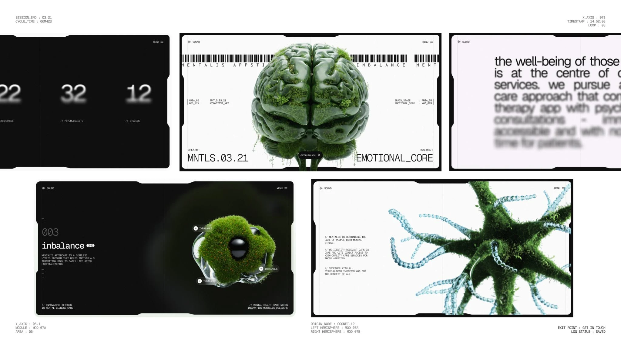 From neural nodes to emotional cores — each screen simulates interaction inside a living care system.