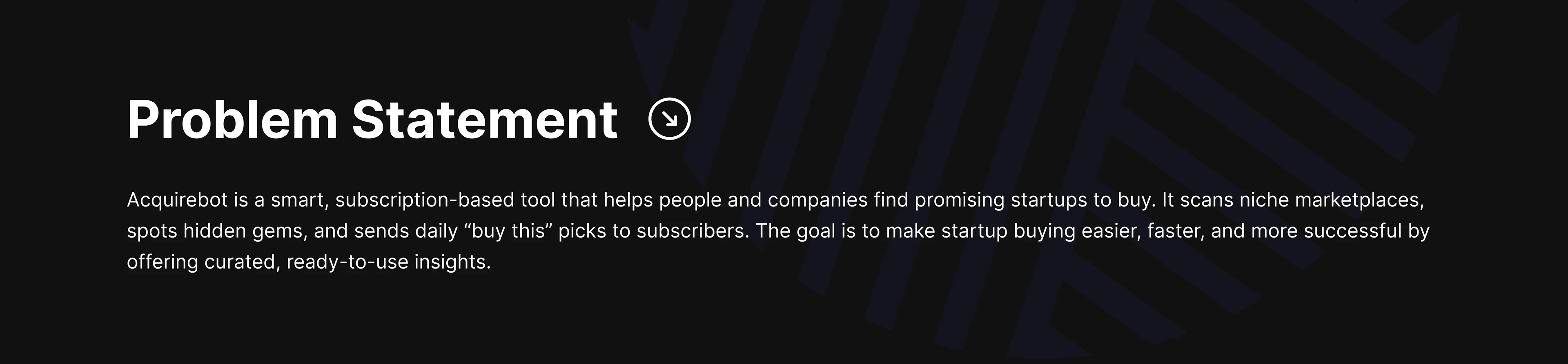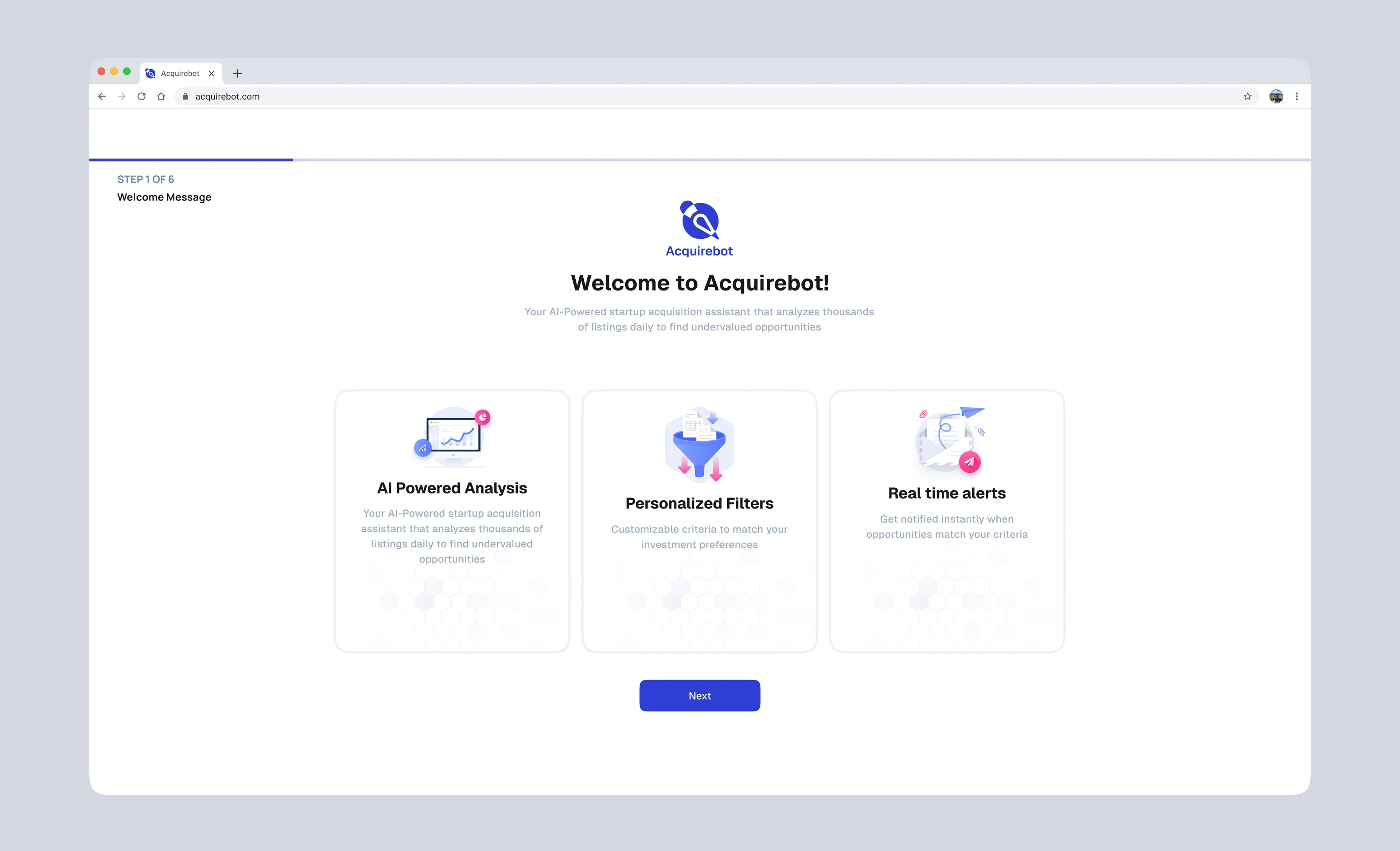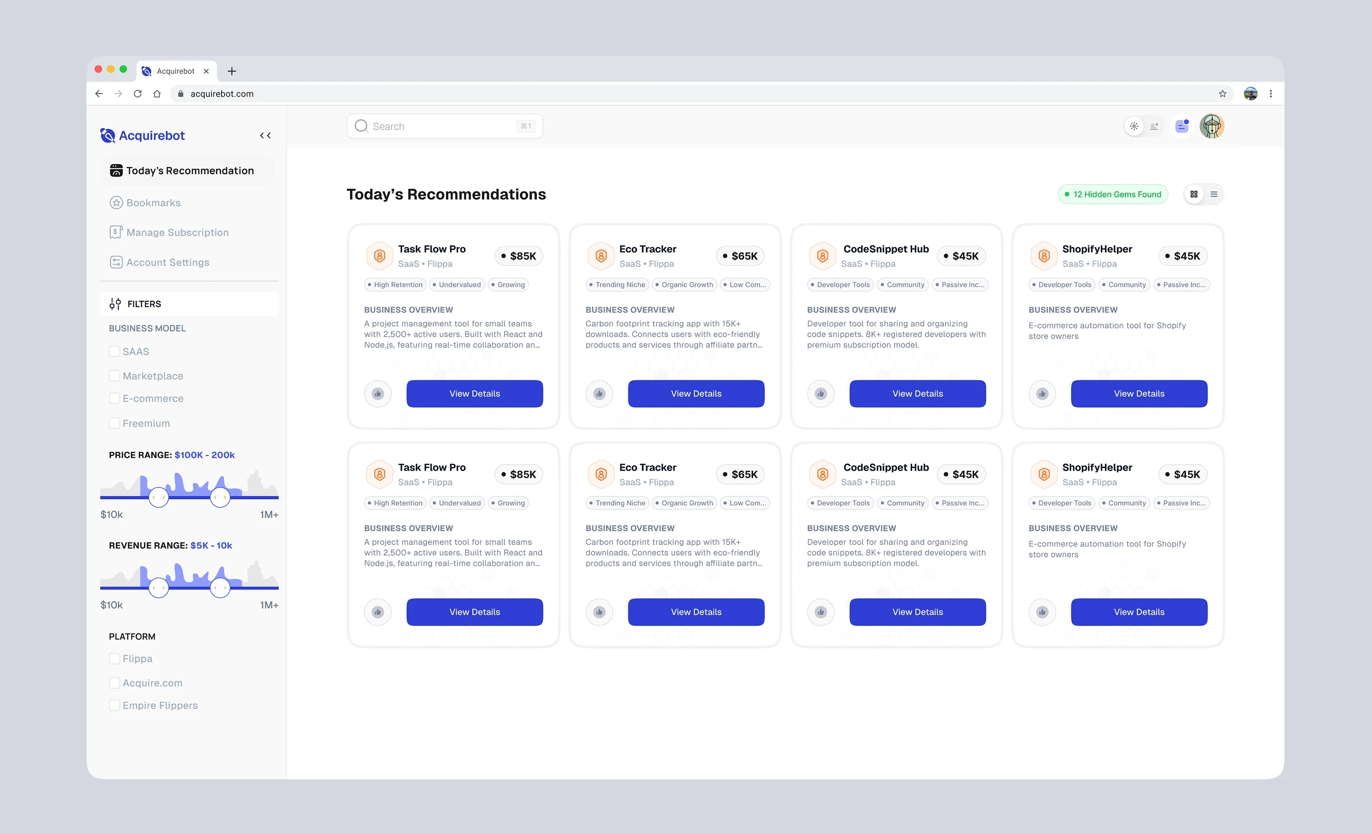 Acquirebot is a subscription tool that finds hidden startup acquisition opportunities and sends daily curated recommendations to make buying faster and easier.