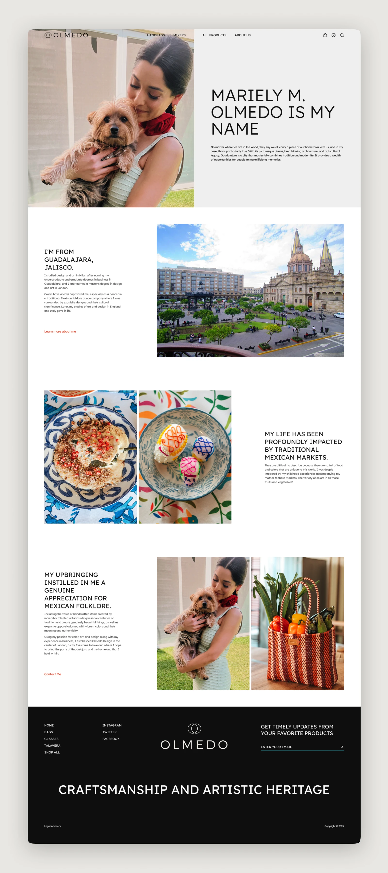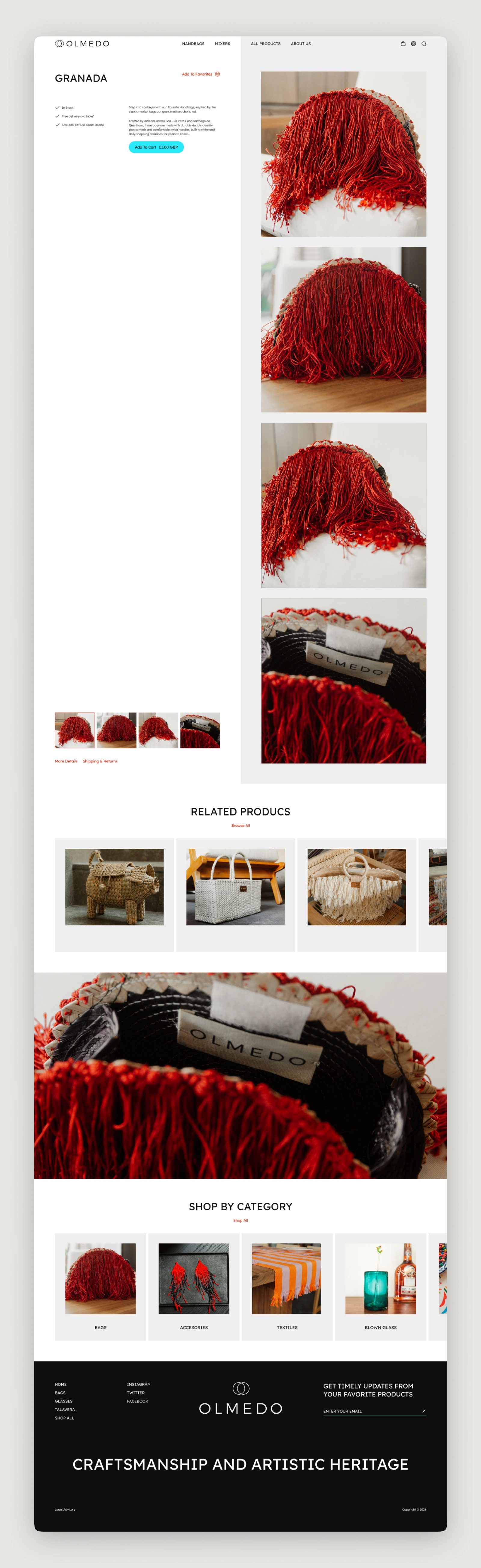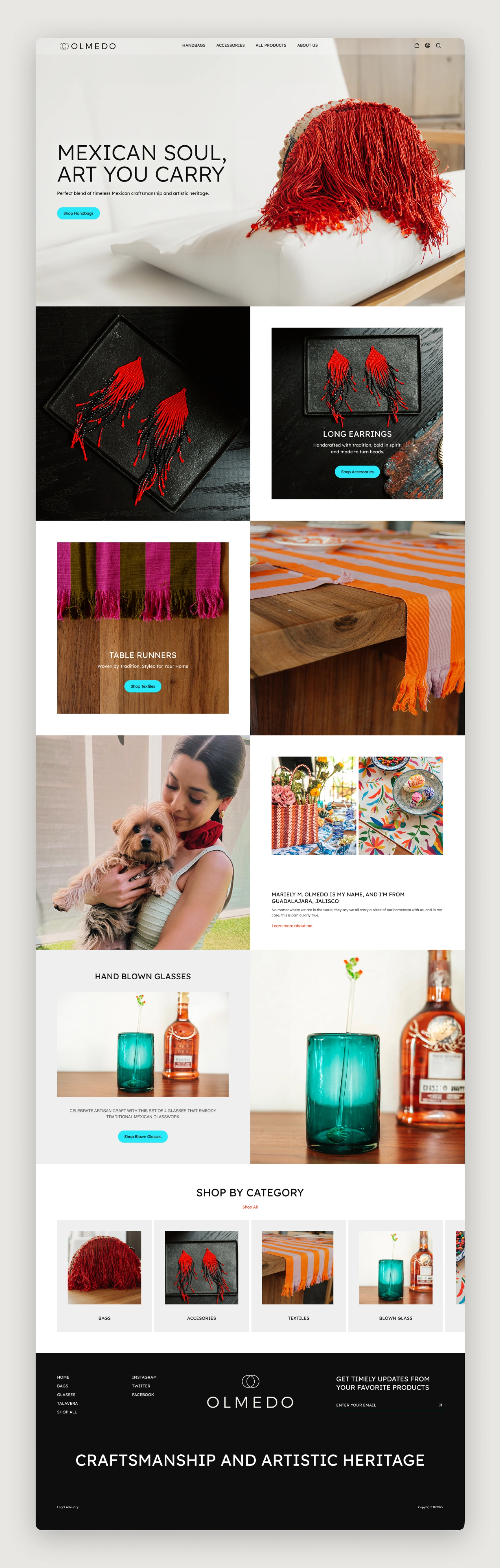 The Olmedo homepage is designed to highlight the richness and character of each piece through a visually driven, editorial layout. The experience balances bold imagery with clean structure, allowing textures, colors, and materials to take center stage without distraction. Large-scale visuals, intentional spacing, and minimal interface elements create a sense of calm while still feeling expressive and culturally grounded. The goal is to introduce the brand not just as a store, but as a reflection of craftsmanship, heritage, and artistic identity.