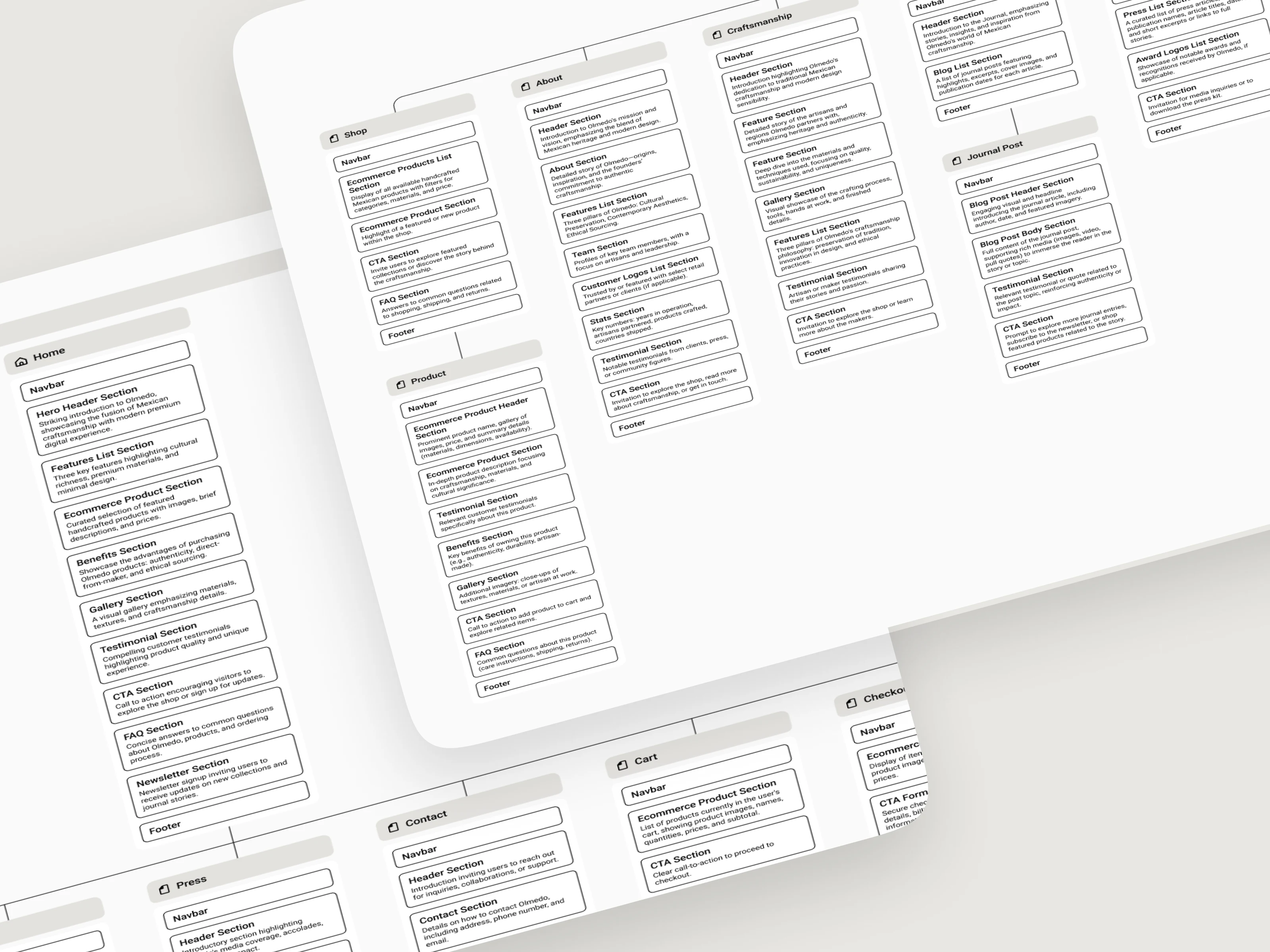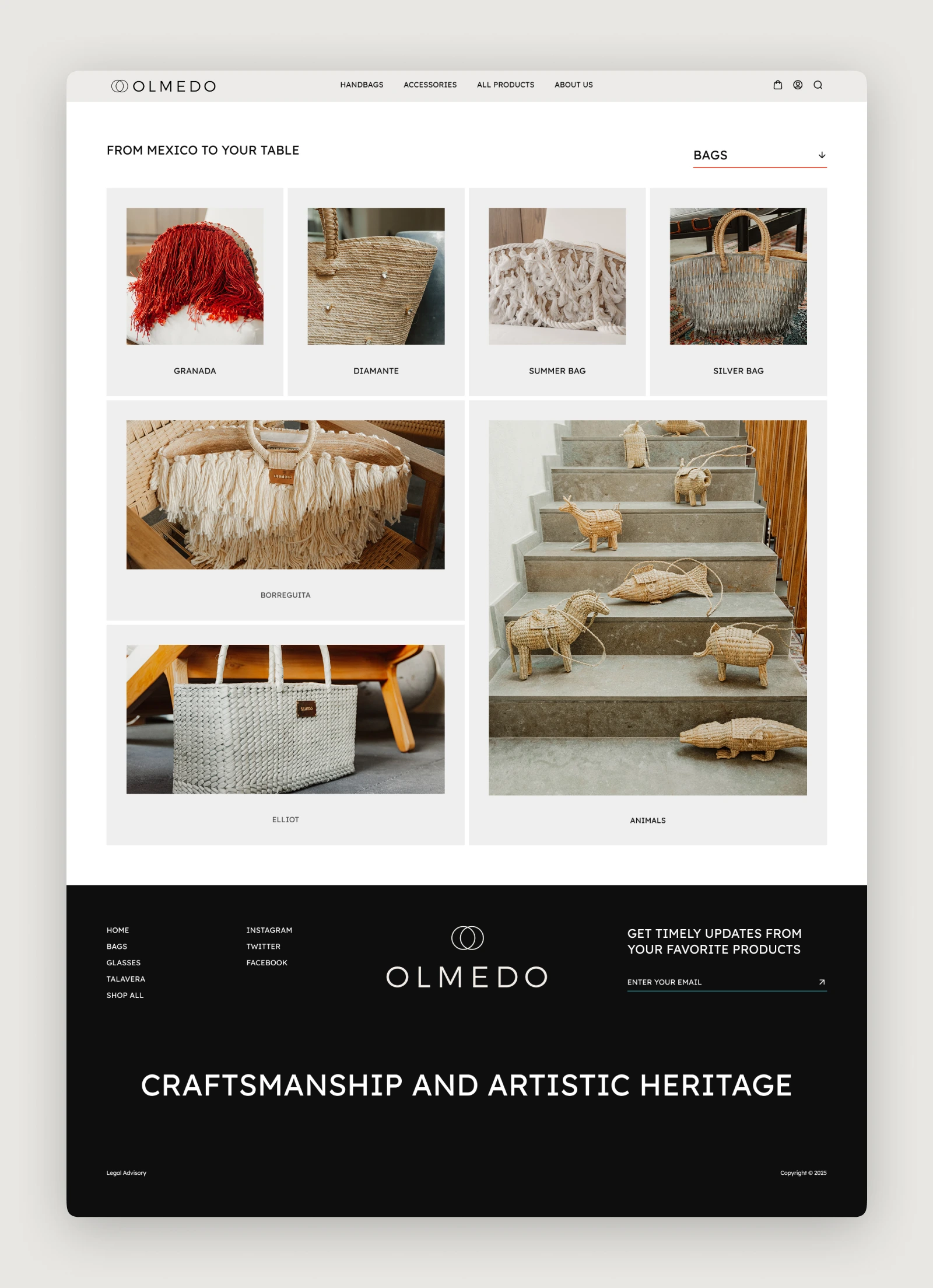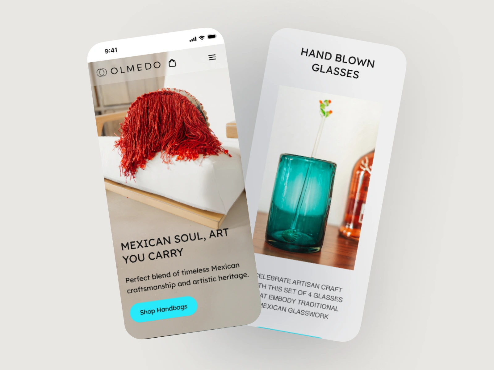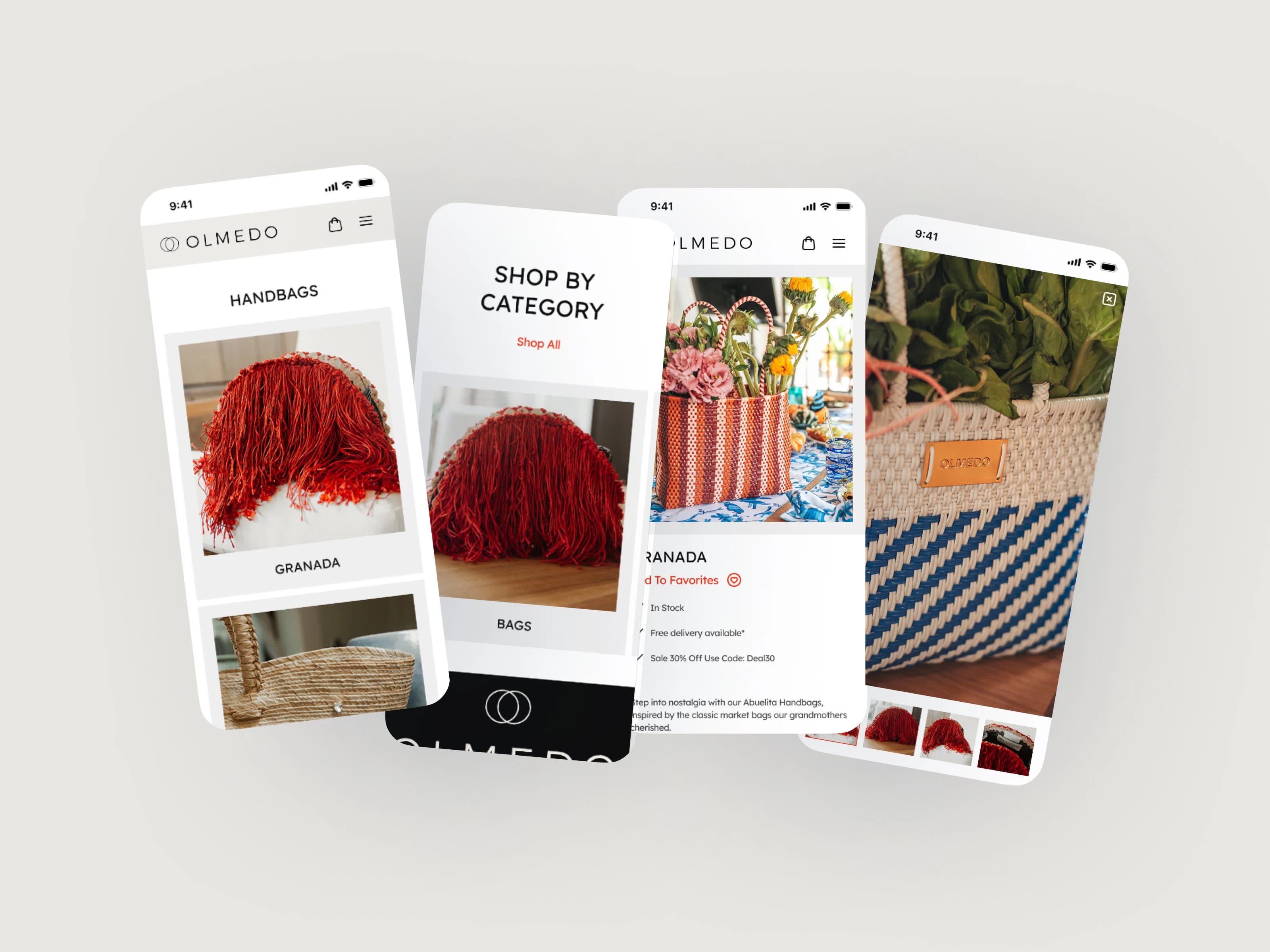 The Olmedo homepage is designed to highlight the richness and character of each piece through a visually driven, editorial layout. The experience balances bold imagery with clean structure, allowing textures, colors, and materials to take center stage without distraction. Large-scale visuals, intentional spacing, and minimal interface elements create a sense of calm while still feeling expressive and culturally grounded. The goal is to introduce the brand not just as a store, but as a reflection of craftsmanship, heritage, and artistic identity.