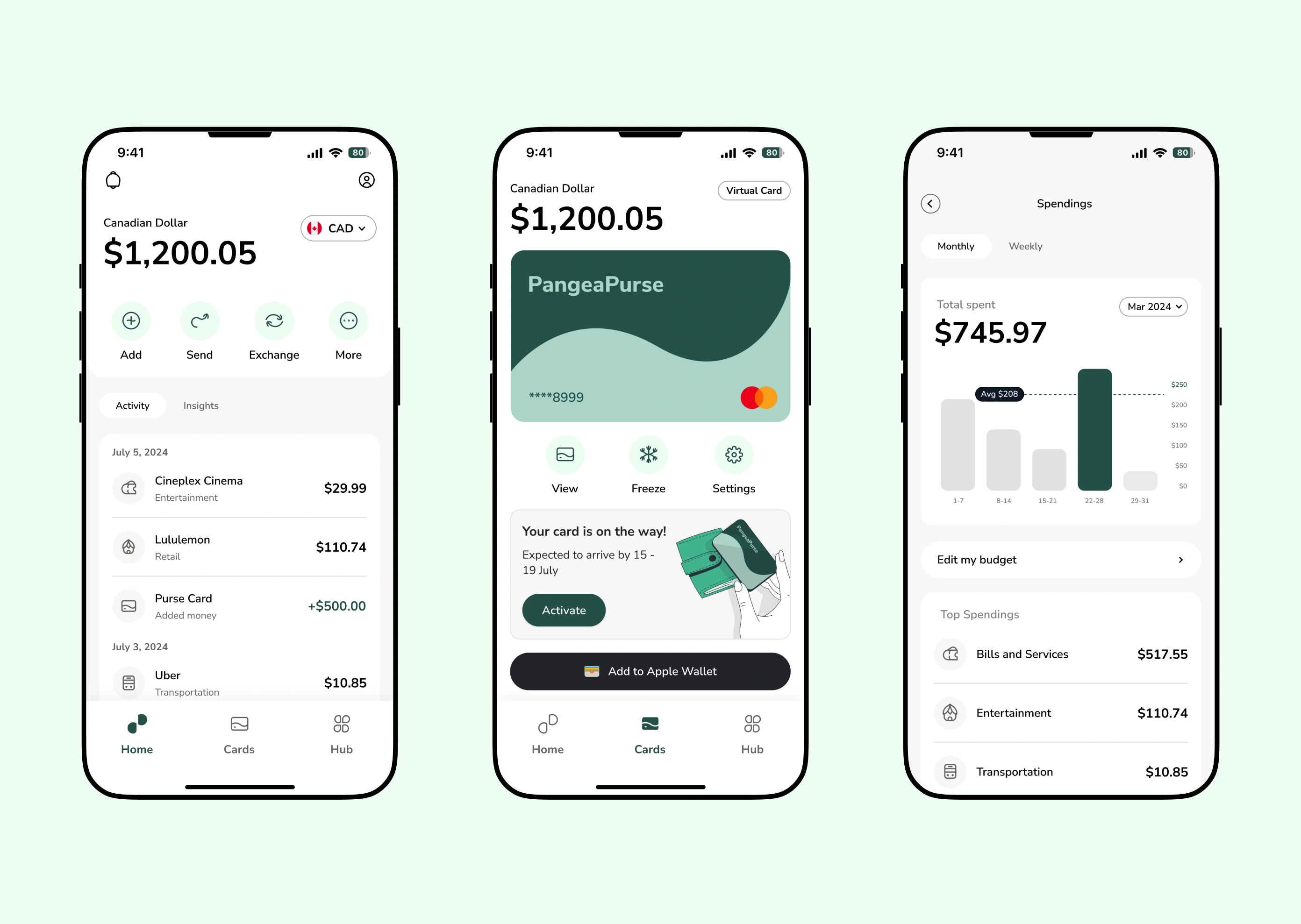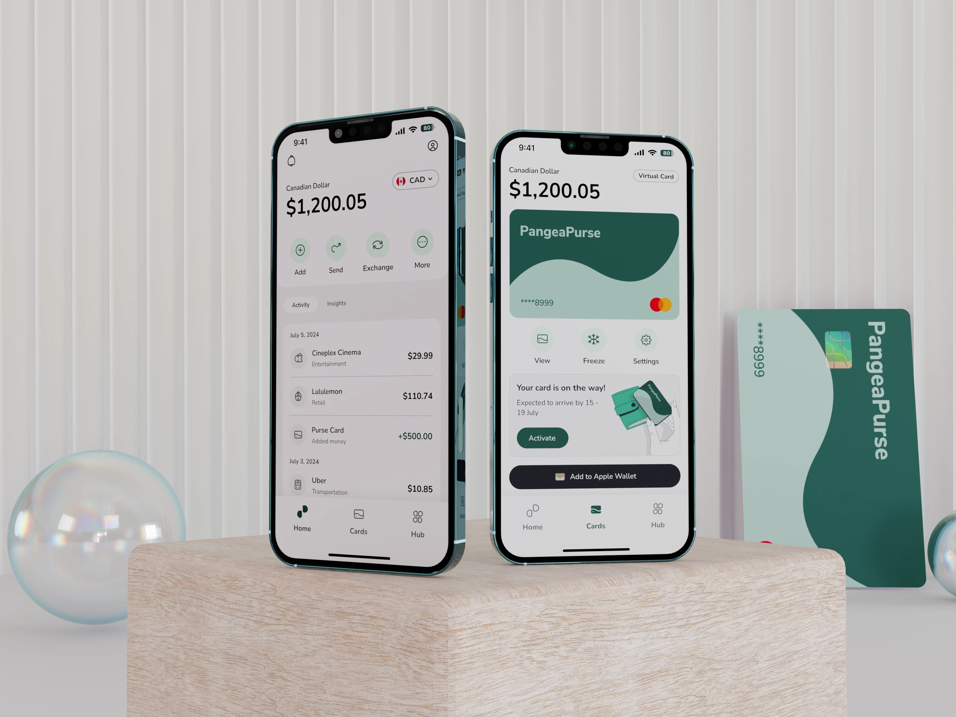 The visual identity uses a balanced color pallete for freshness and approachability. Typography is clean and functional, with generous spacing to enhance readability and calm. In the UI, I designed modular card components and data-visual sections to present financial information clearly and confidently. The brand mark reflects movement and currency flow, hinting at global connectivity, while the overall aesthetic remains crisp, friendly, and contemporary.