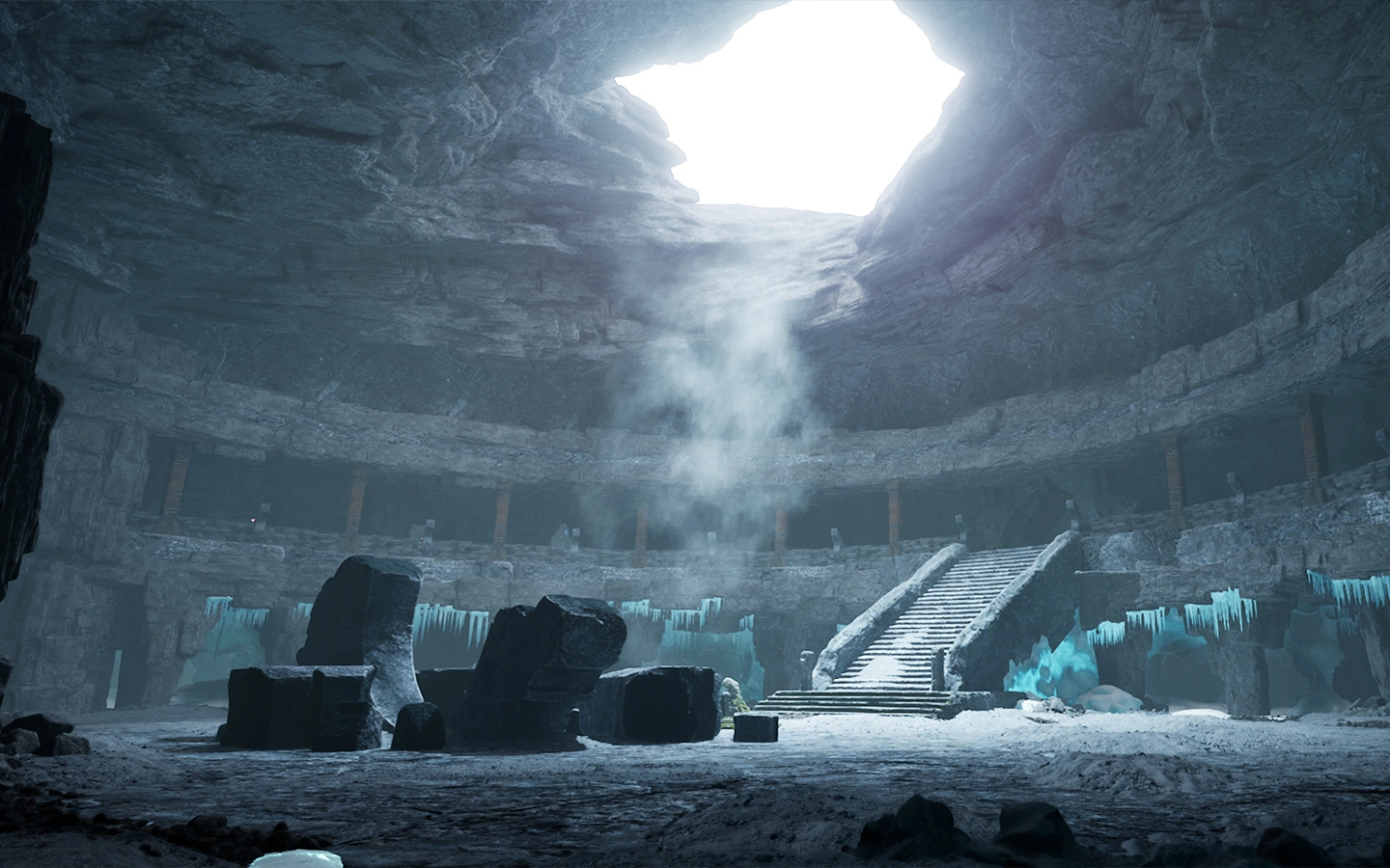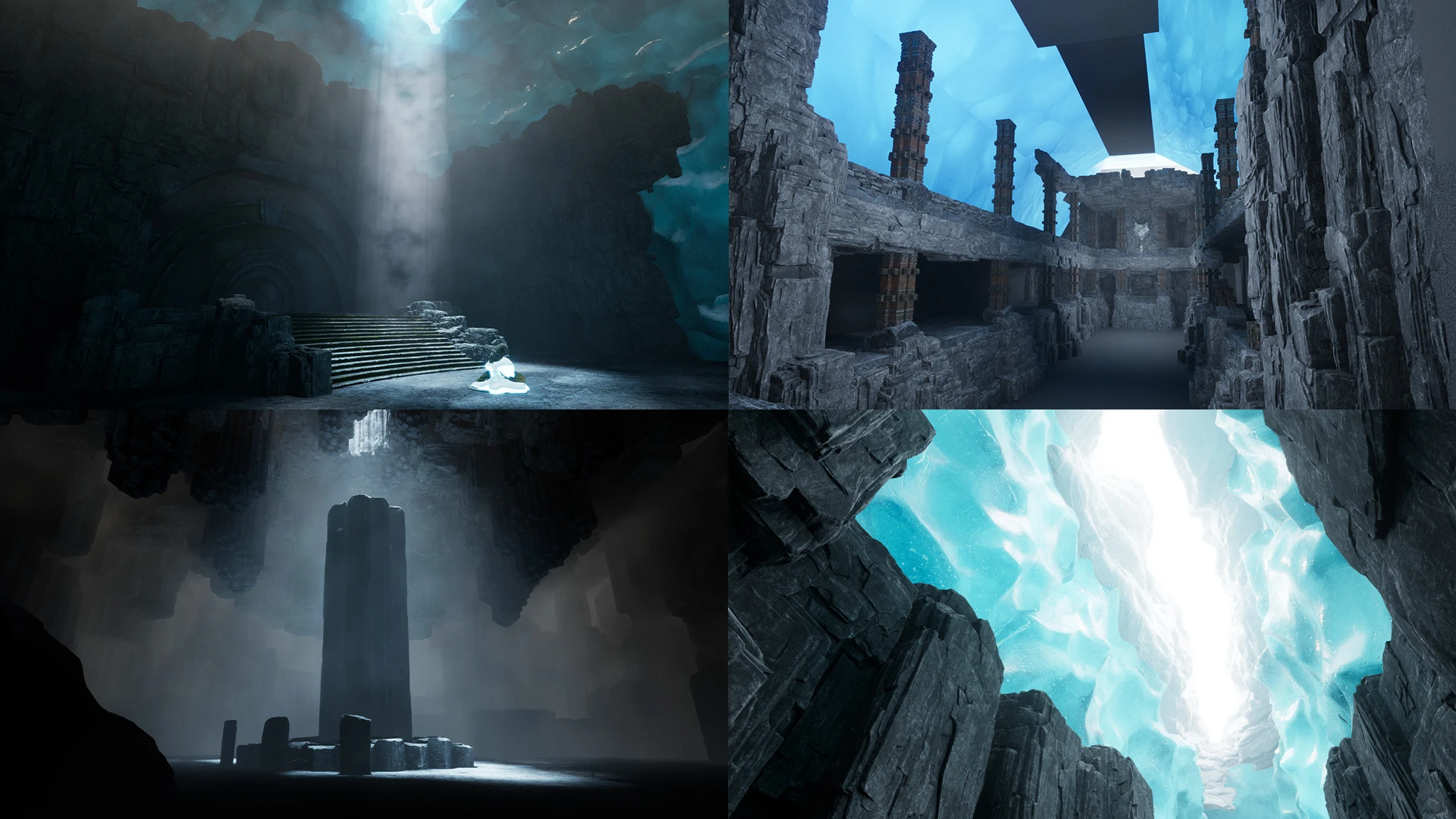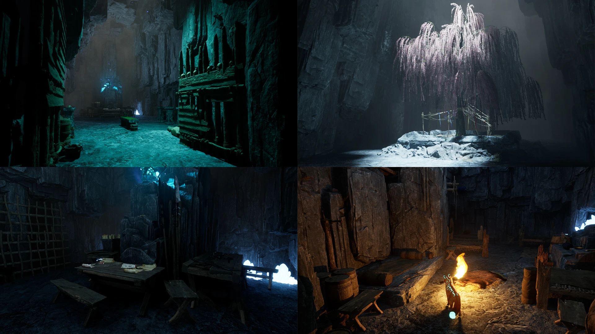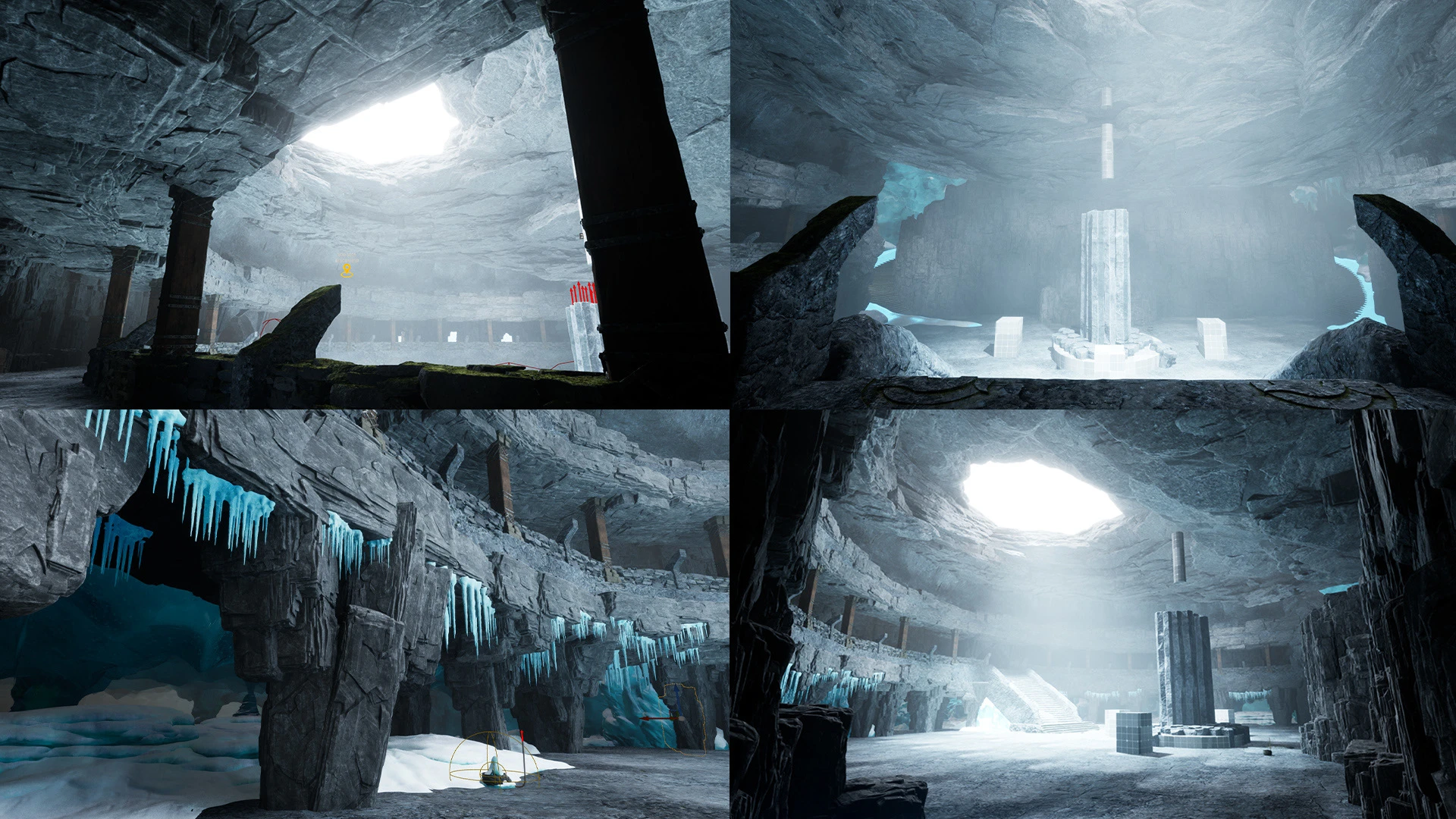This project involved combining raw environmental elements (ice/rock) with elements of constructed civilization (shelter/tribal life). The layout was designed around the tribe's needs, creating distinct areas such as a blacksmith, living quarters, and sacred spaces, each detailed with appropriate assets to convey its function and narrative importance.