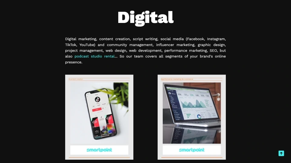 Smartpoint is a multifaceted company offering various professional services including podcast studio operations, event planning, team building, PR services, and content & creative services. Their digital presence consisted of only a basic homepage with a hero section, severely limiting their ability to showcase their extensive portfolio and service offerings.