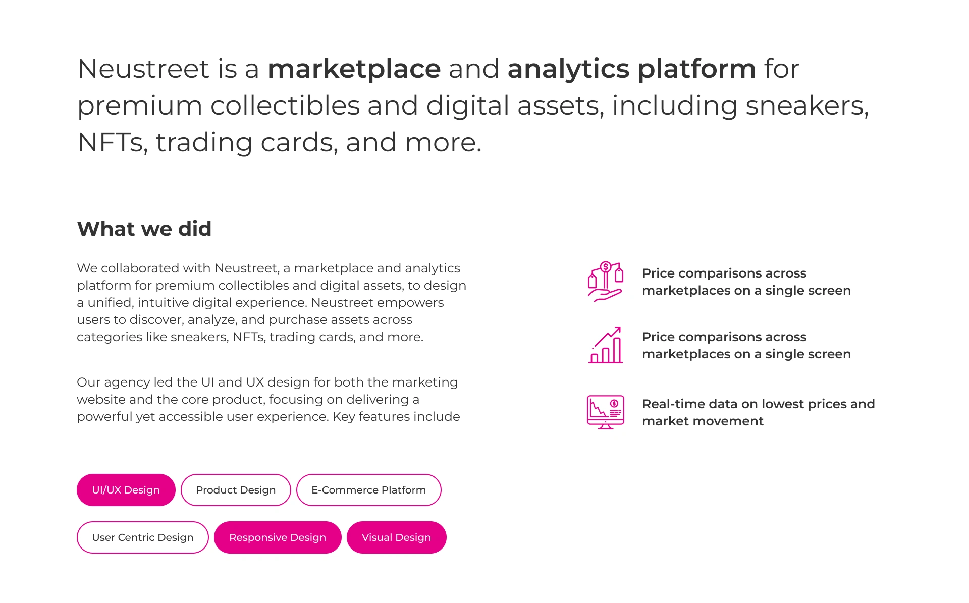 Neustreet is a marketplace and analytics platform for premium collectibles and digital assets like sneakers, trading cards, NFTs, and more. The team approached us to help craft a cohesive digital experience that could support deep data, real-time market insights, and intuitive exploration across categories.