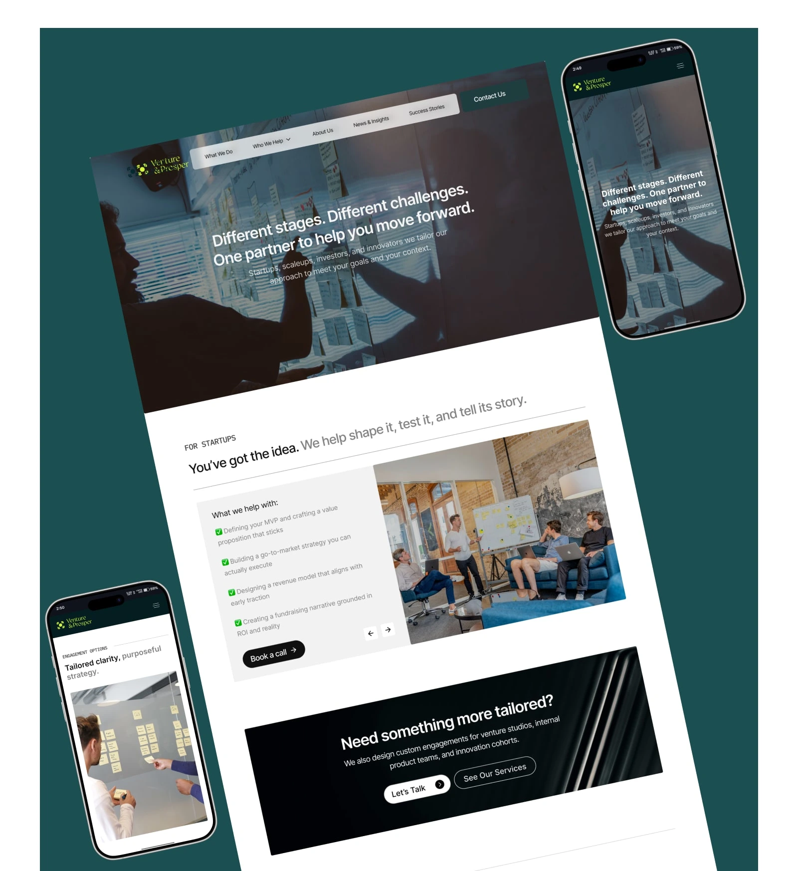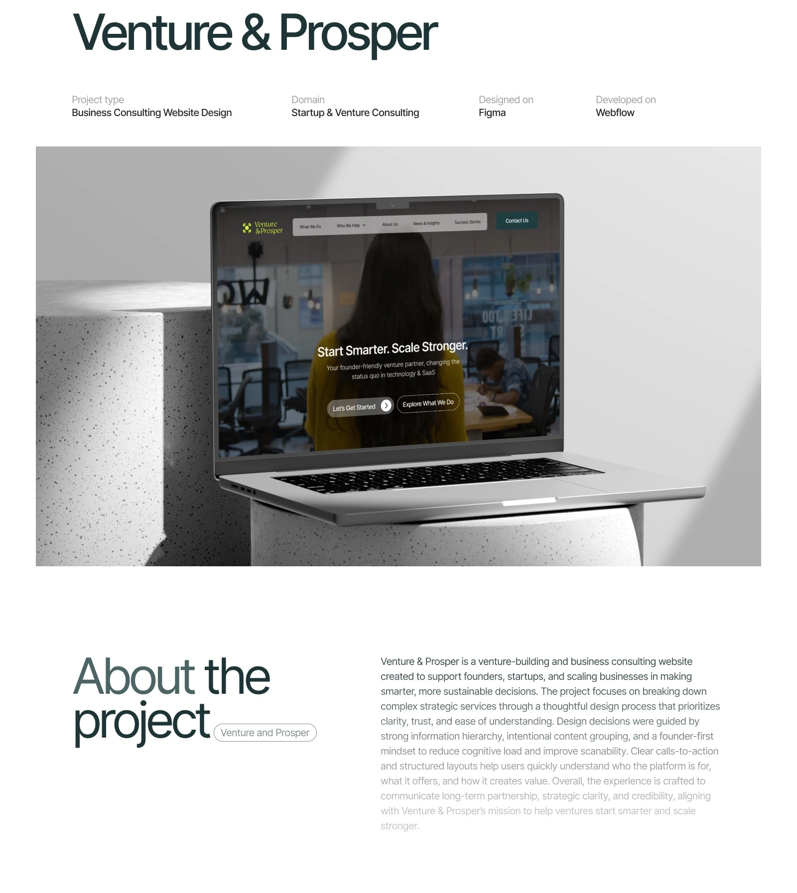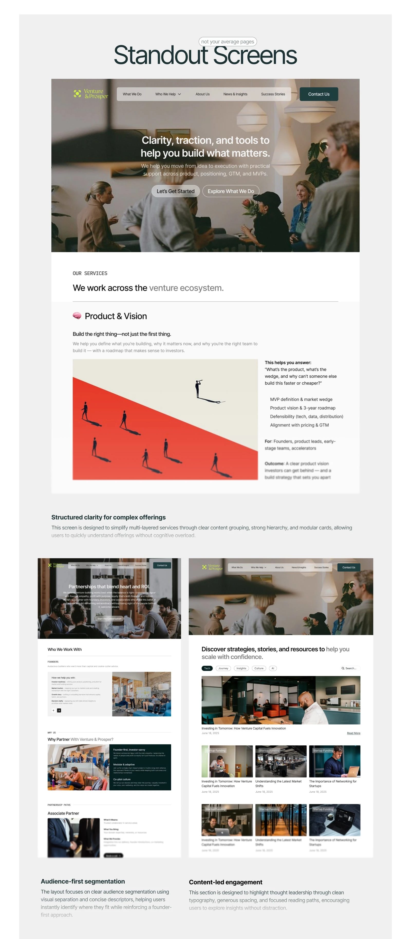 The final website presents Venture & Prosper as clear, dependable, and thoughtfully positioned. It supports the brand’s intent by making information easy to navigate, establishing trust through design restraint, and creating a digital presence that feels considered, professional, and built for long-term engagement.