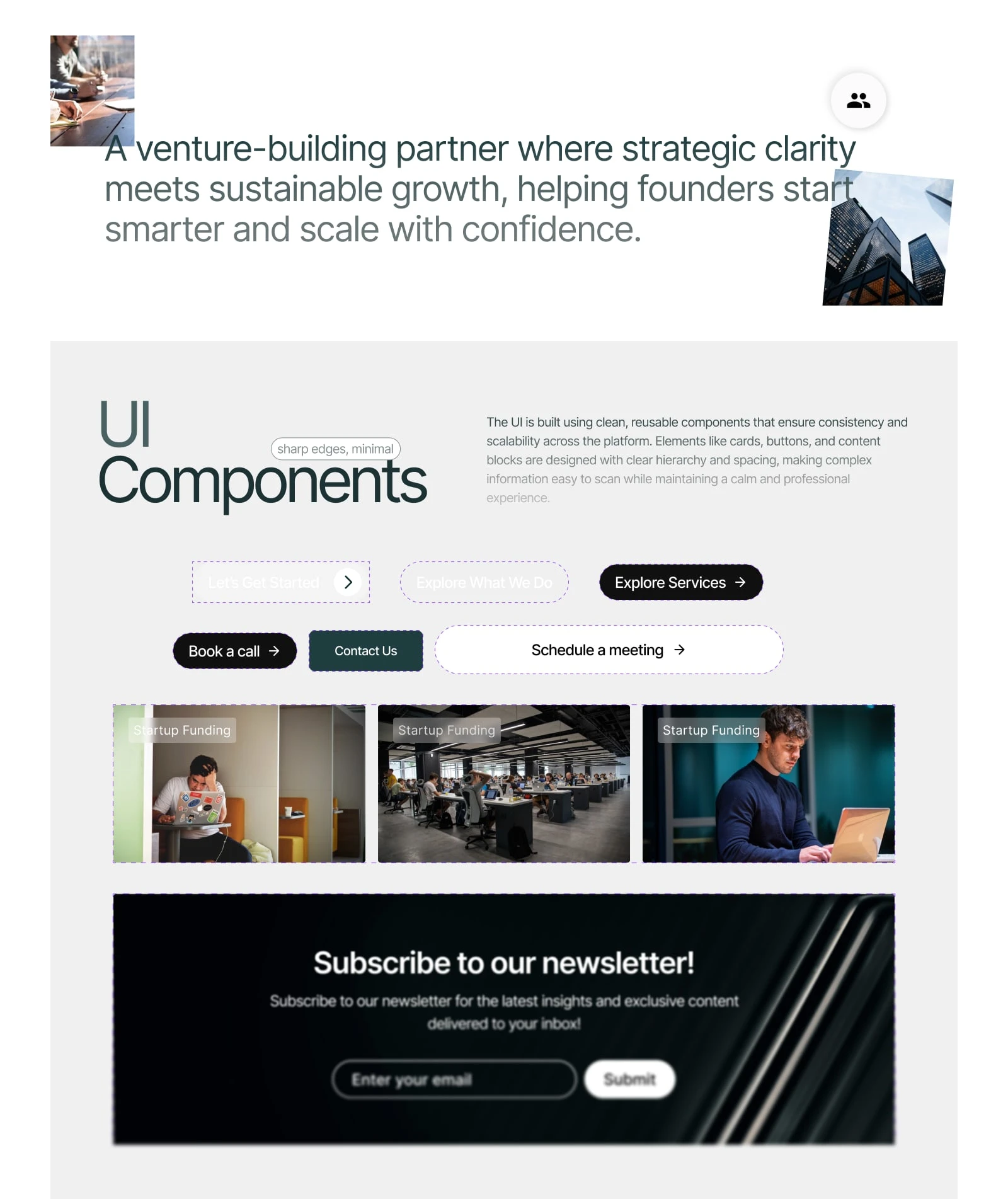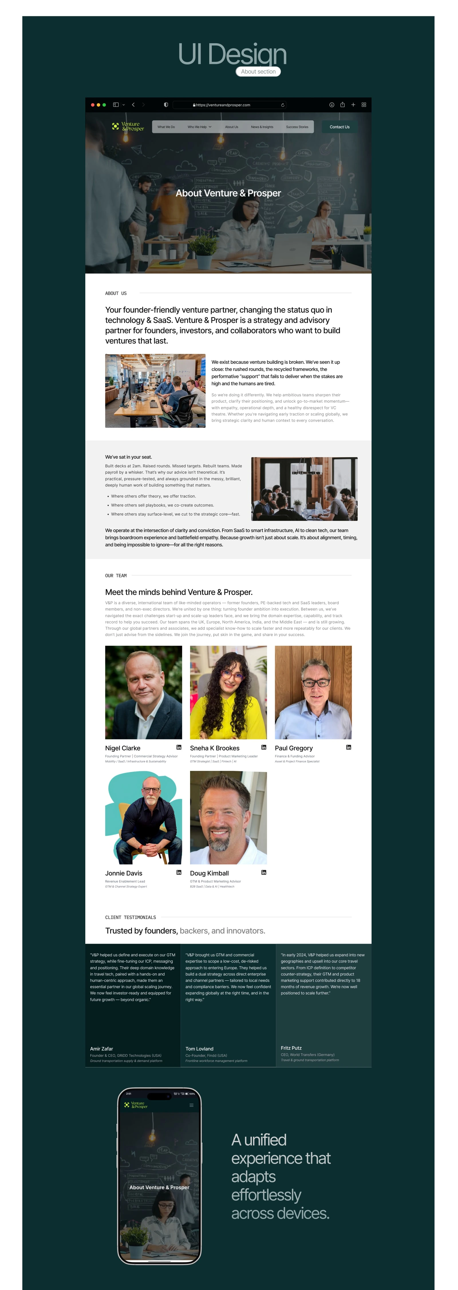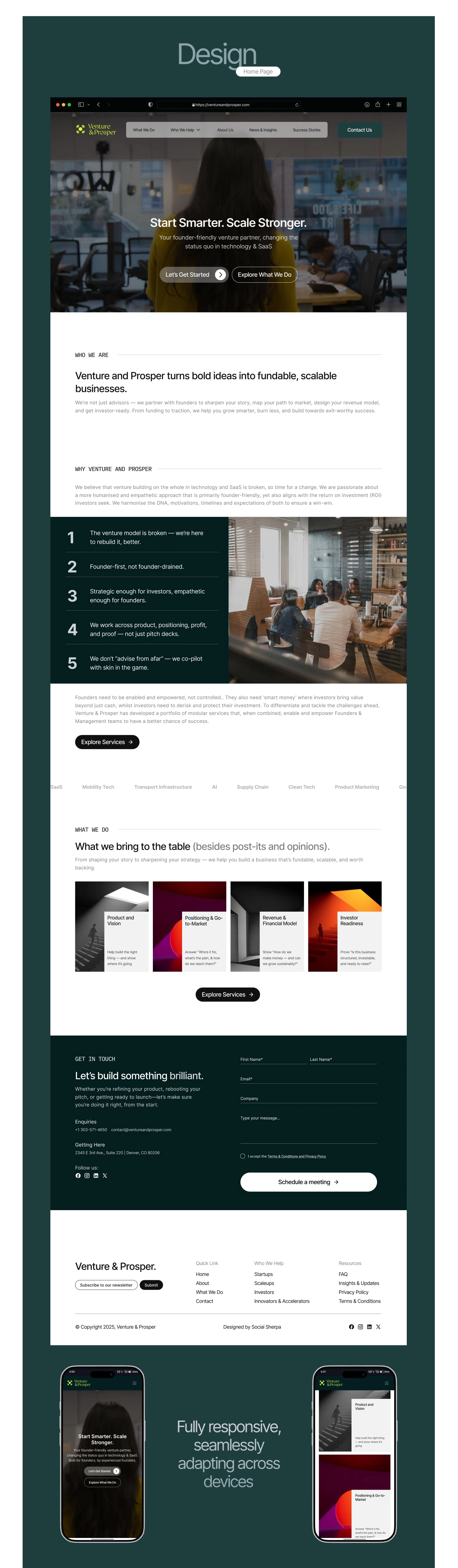 The final website presents Venture & Prosper as clear, dependable, and thoughtfully positioned. It supports the brand’s intent by making information easy to navigate, establishing trust through design restraint, and creating a digital presence that feels considered, professional, and built for long-term engagement.