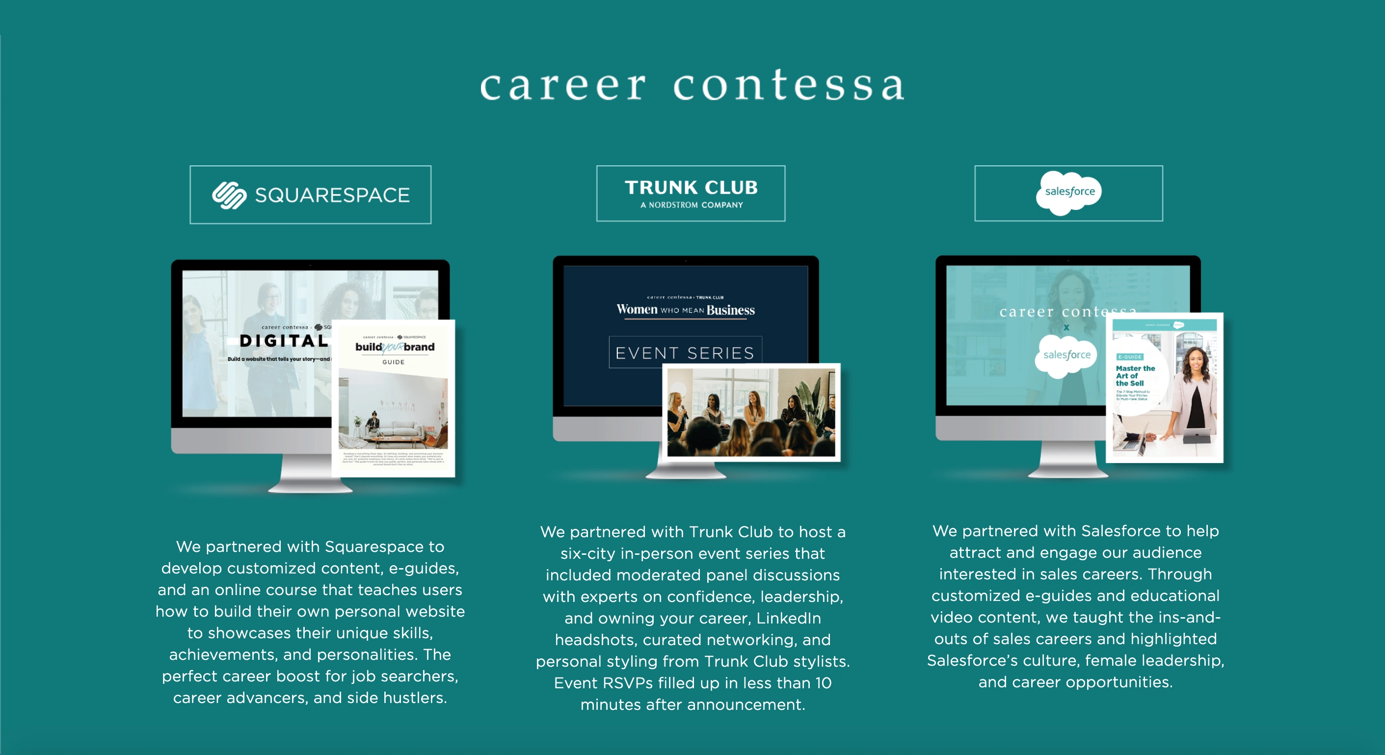 Served as the lead graphic designer at Career Contessa who’s role included creating e-guides and downloadable resources, designing various webpages, making design templates for social media posts, and branding e-courses.