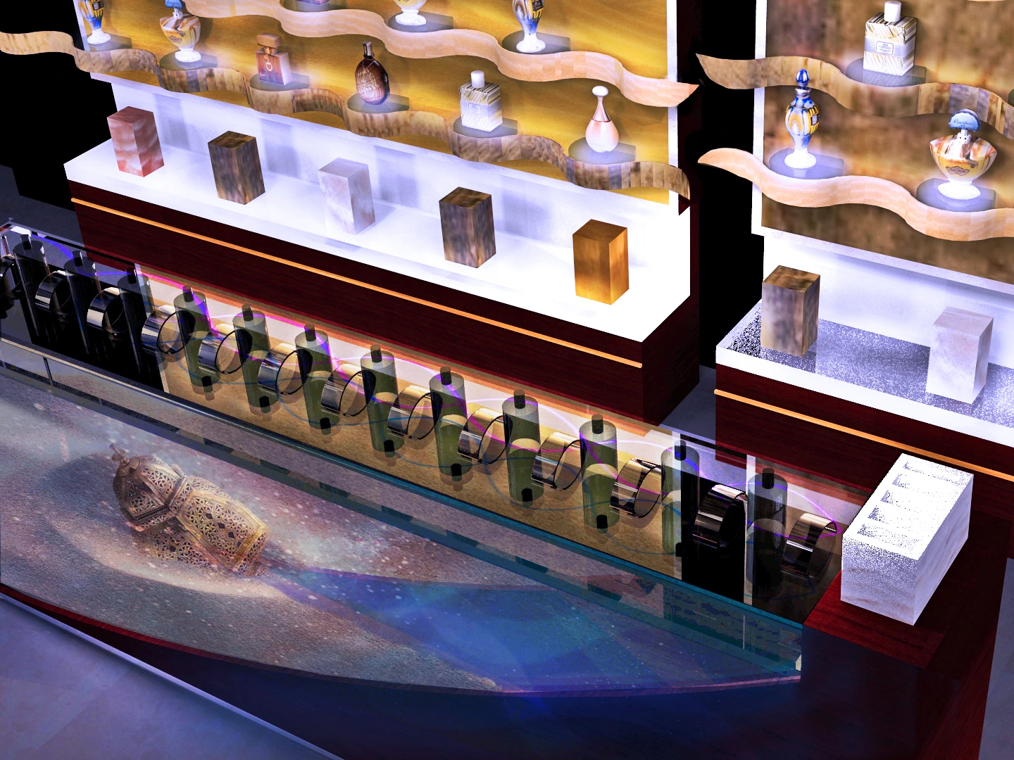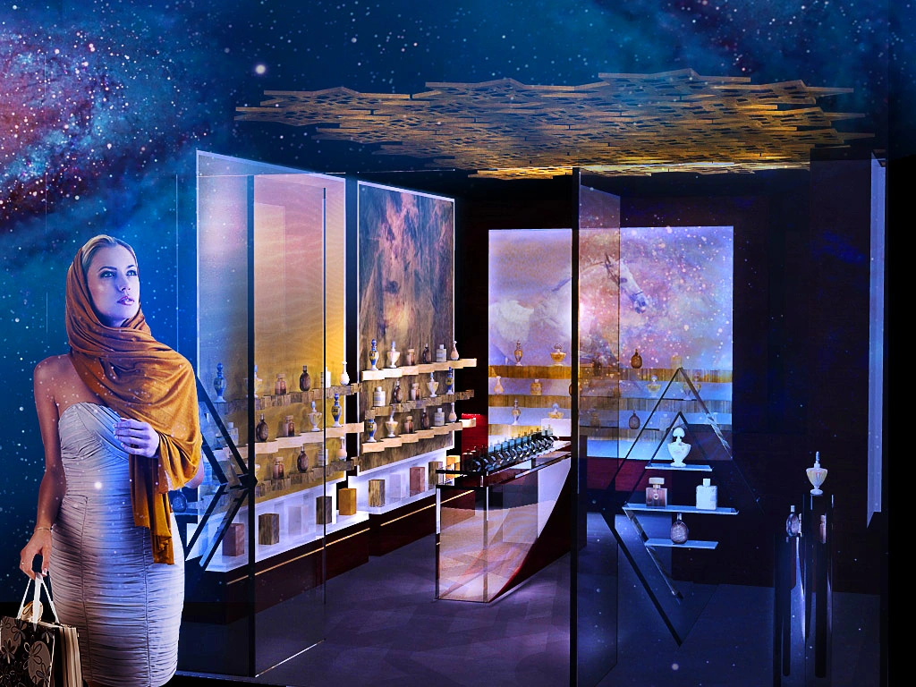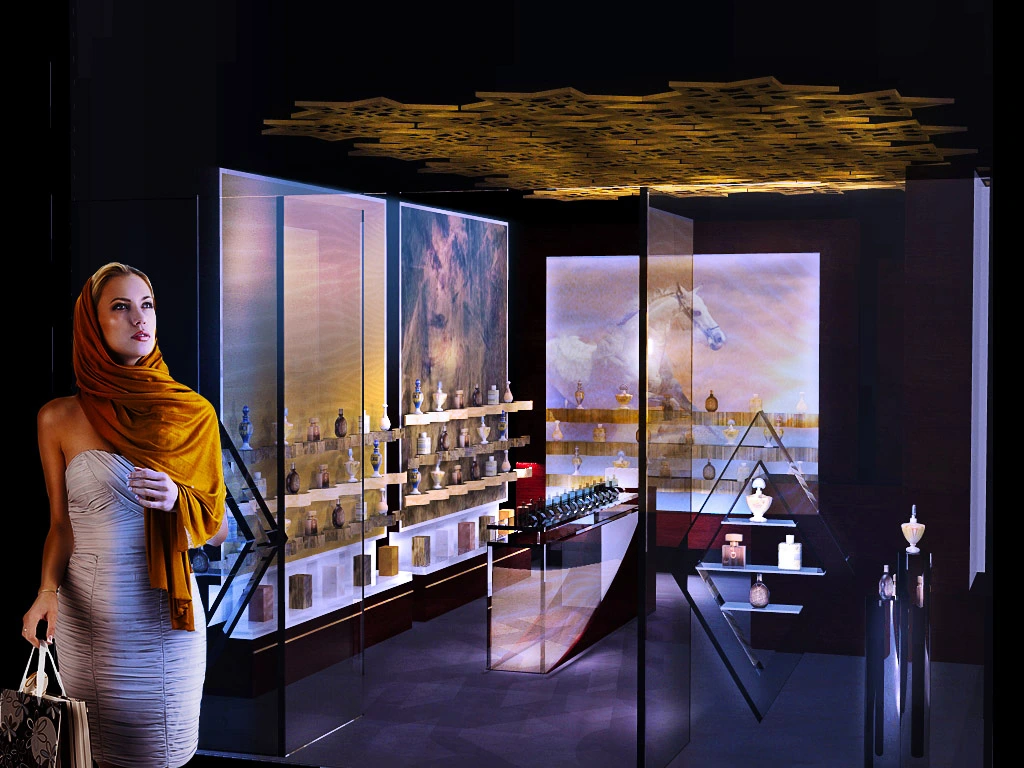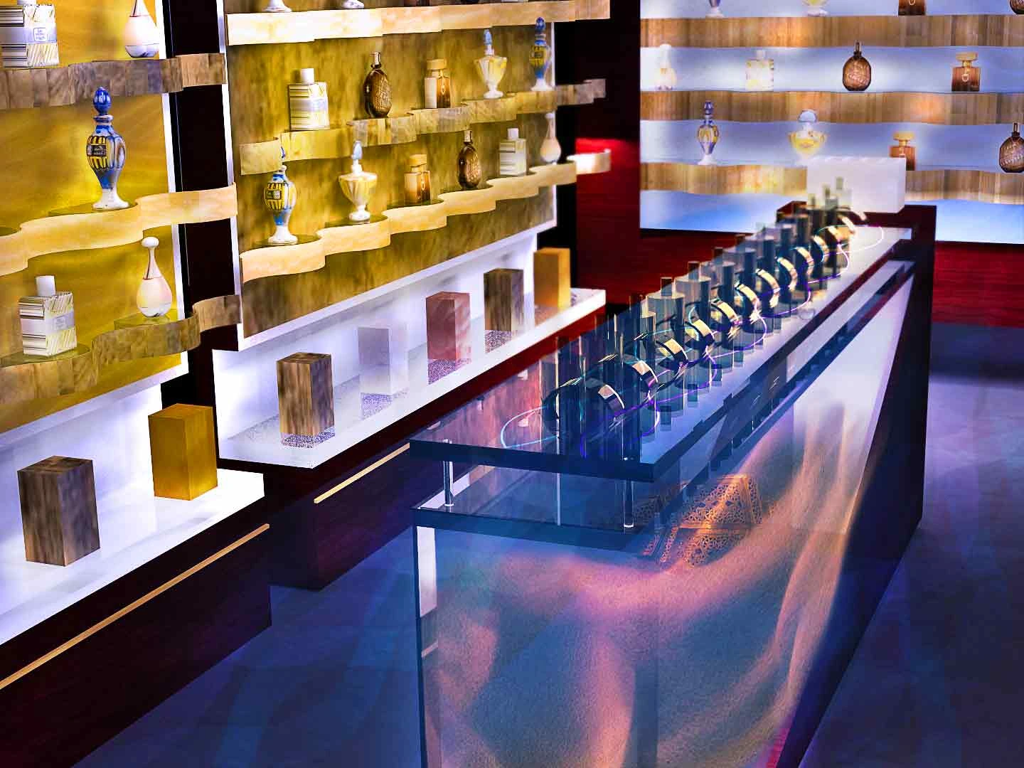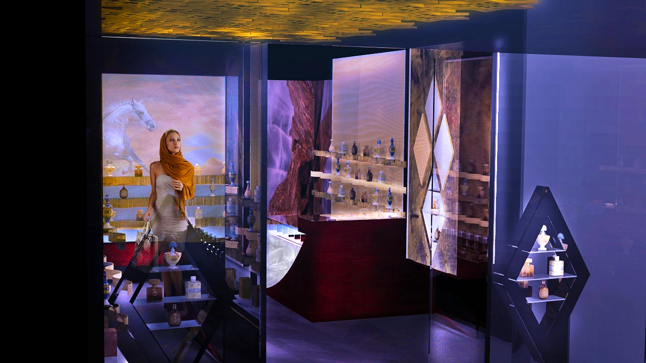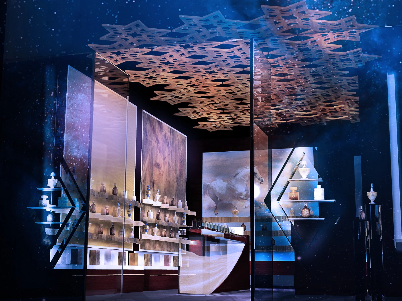 The challenge was to capture the spirit of Middle Eastern culture in an imaginative, poetic way and fuse it with the world of fragrance, translated into a contemporary Western retail environment.