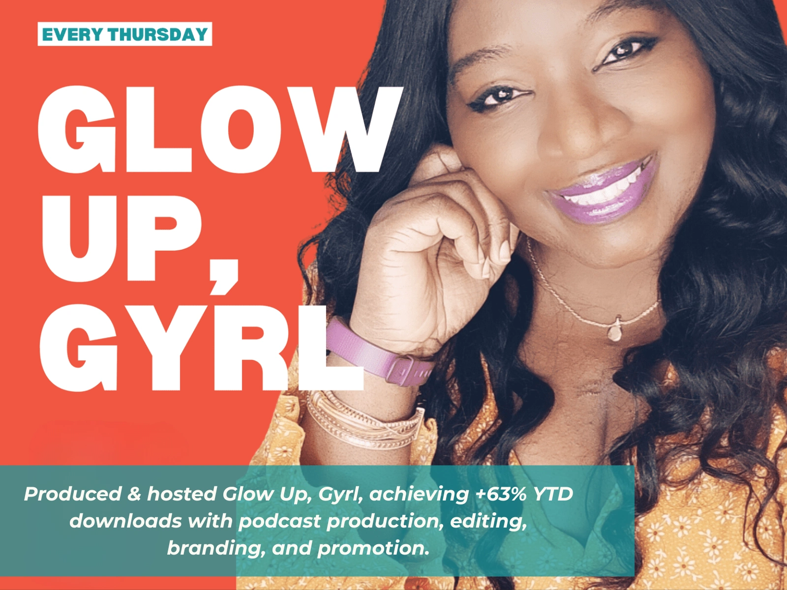Produced & hosted Glow Up, Gyrl, achieving +63% YTD downloads with podcast production, editing, branding, and promotion.