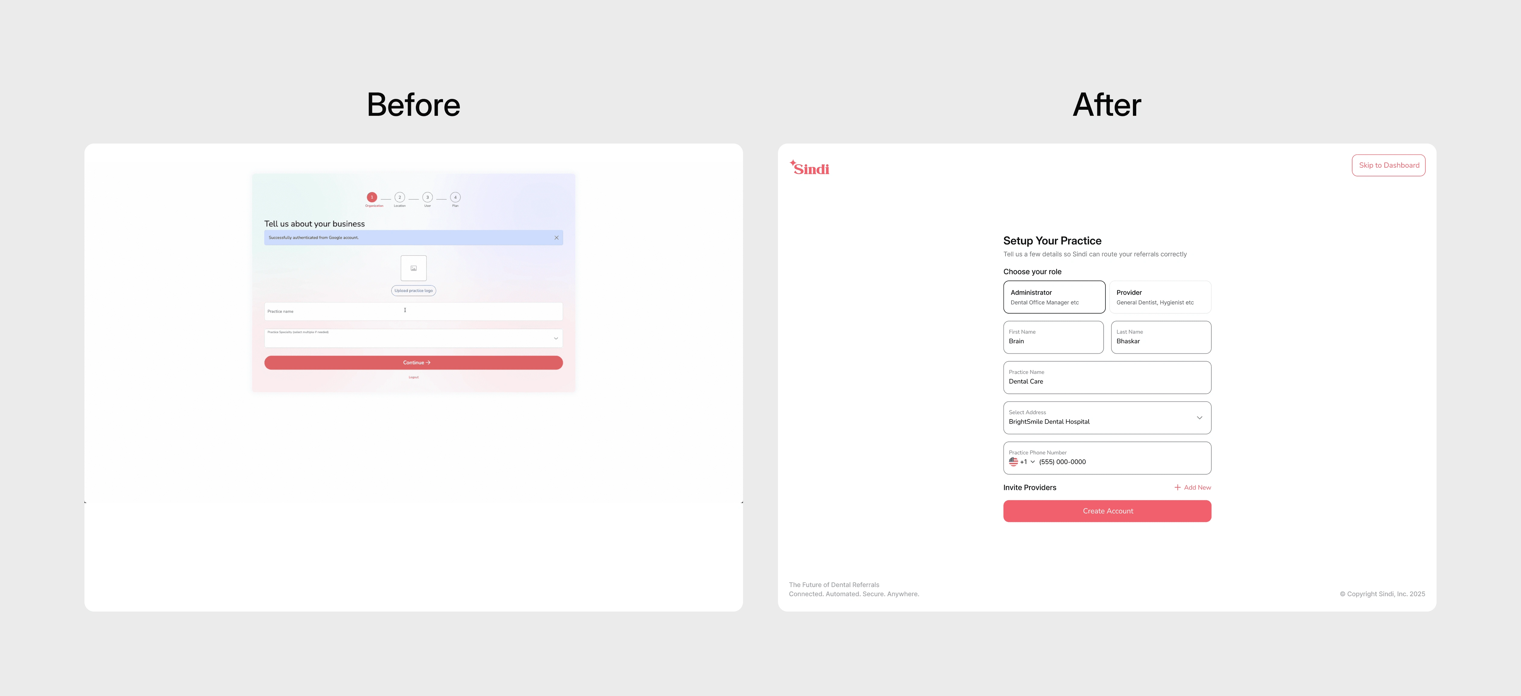 Reduced onboarding friction by 90% and increased onboarding completion by 45% by compressing a long, fragmented setup into a fast “SSO → 1 setup screen → dashboard” flow