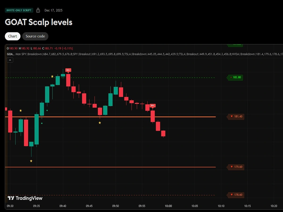 GOAT Scalp levels: A PineScript indicator that displays daily trading setup levels (Breakout, Breakdown, Bounce, Rejection) for multiple tickers, generates BUY/SELL signals on level crosses, tracks T1 targets (80% move) with real-time stars, and uses a two-phase system that switches from Breakout/Breakdown to Bounce/Rejection when rejection conditions are met.