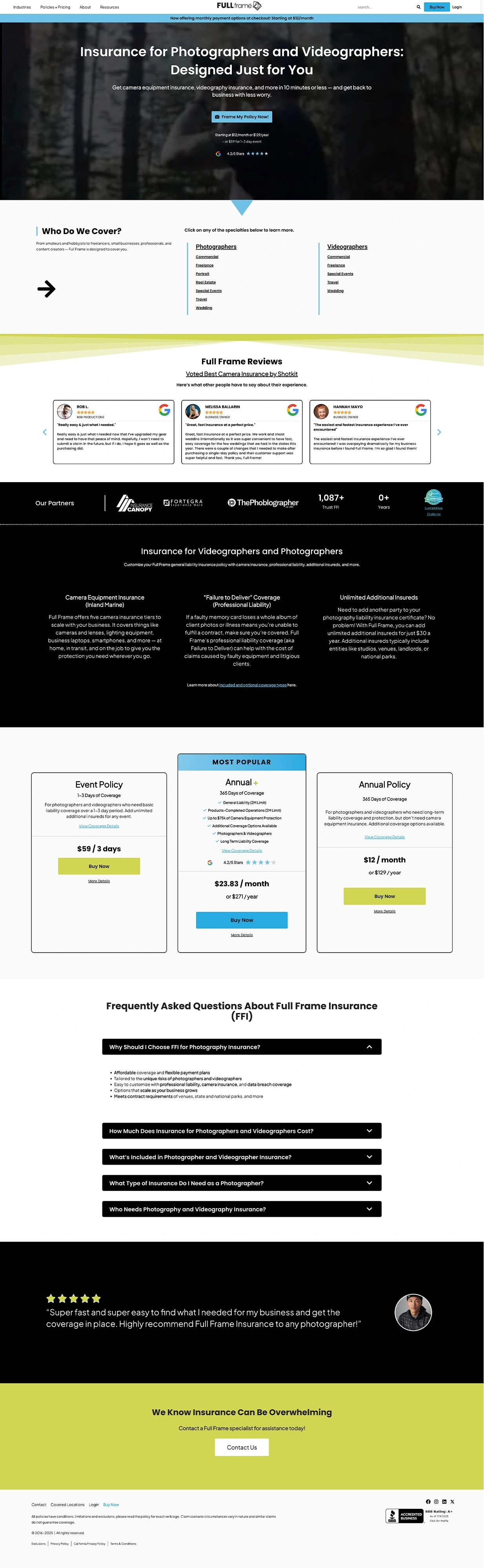 As a Full-Stack Developer and WordPress Website Designer, I led the complete redesign and development of the Full Frame Insurance website a digital insurance provider focused on photographers and creatives.