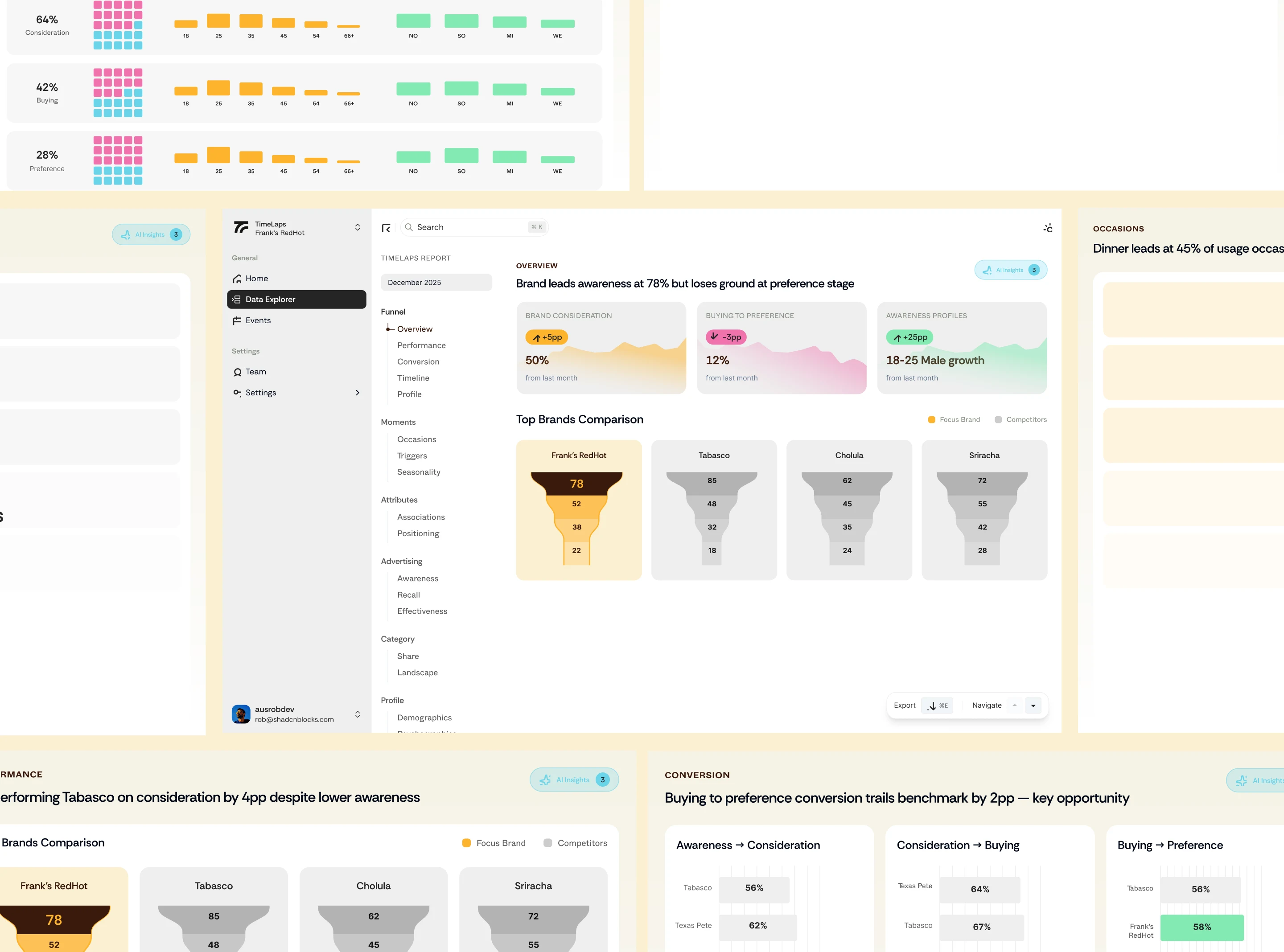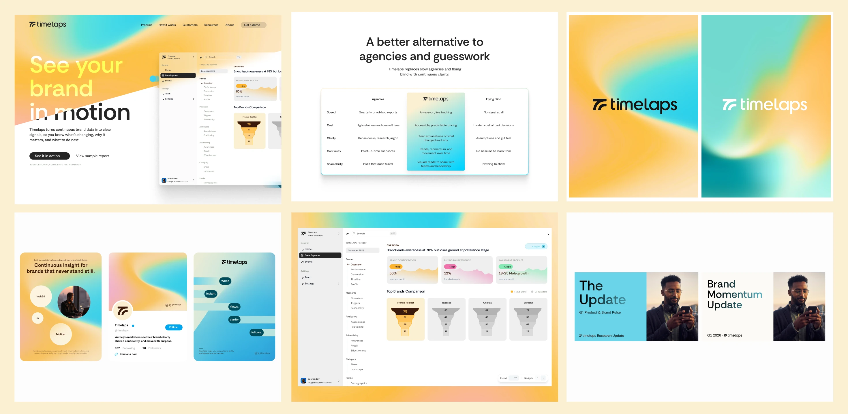 Strategy, naming, brand identity, and product UI for Timelaps, a design-led brand tracking platform built to replace static research with insight in motion.