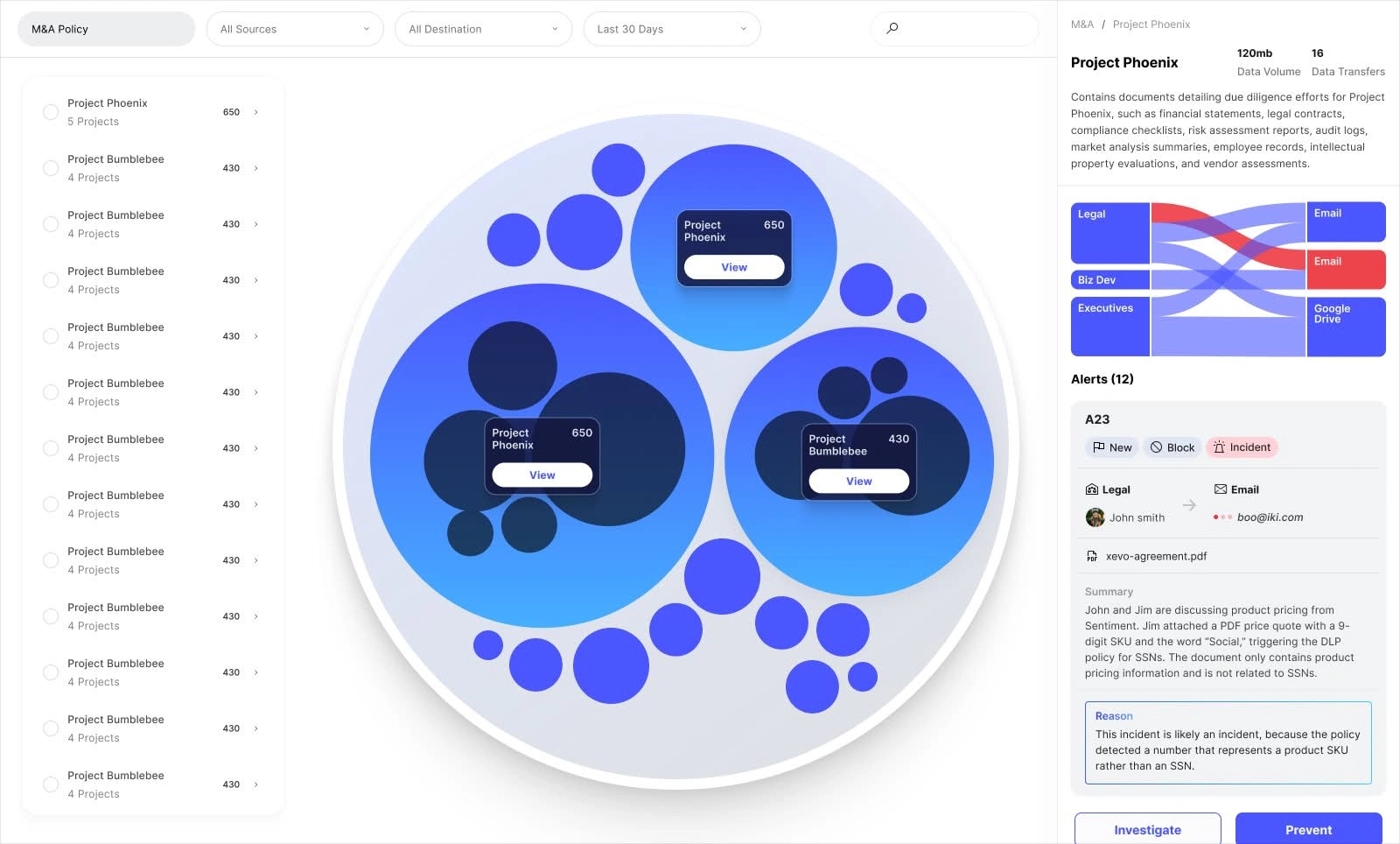 We ditched the traditional table-heavy UI in favor of an organic, cluster-based view that highlights flows and hotspots at a glance, giving security teams a birds-eye view of potential risks across departments and communication channels.