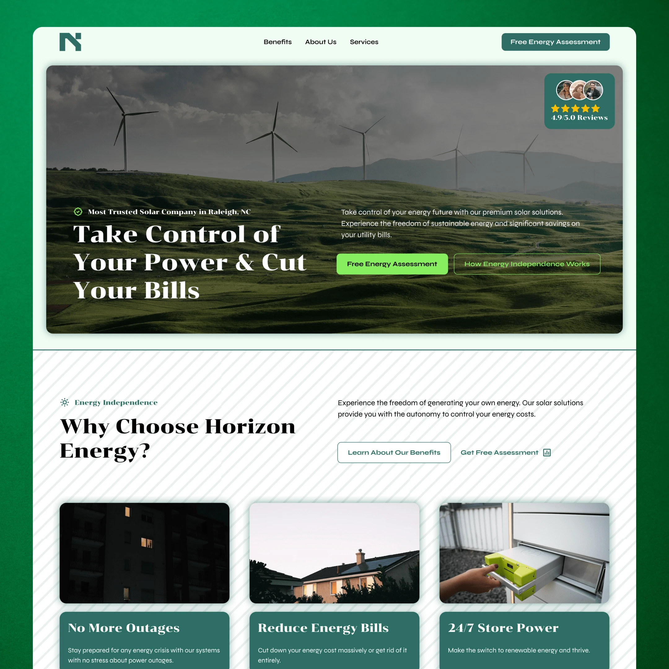Solar website design project for a company called Horizon Solar, focusing on energy independence and savings.