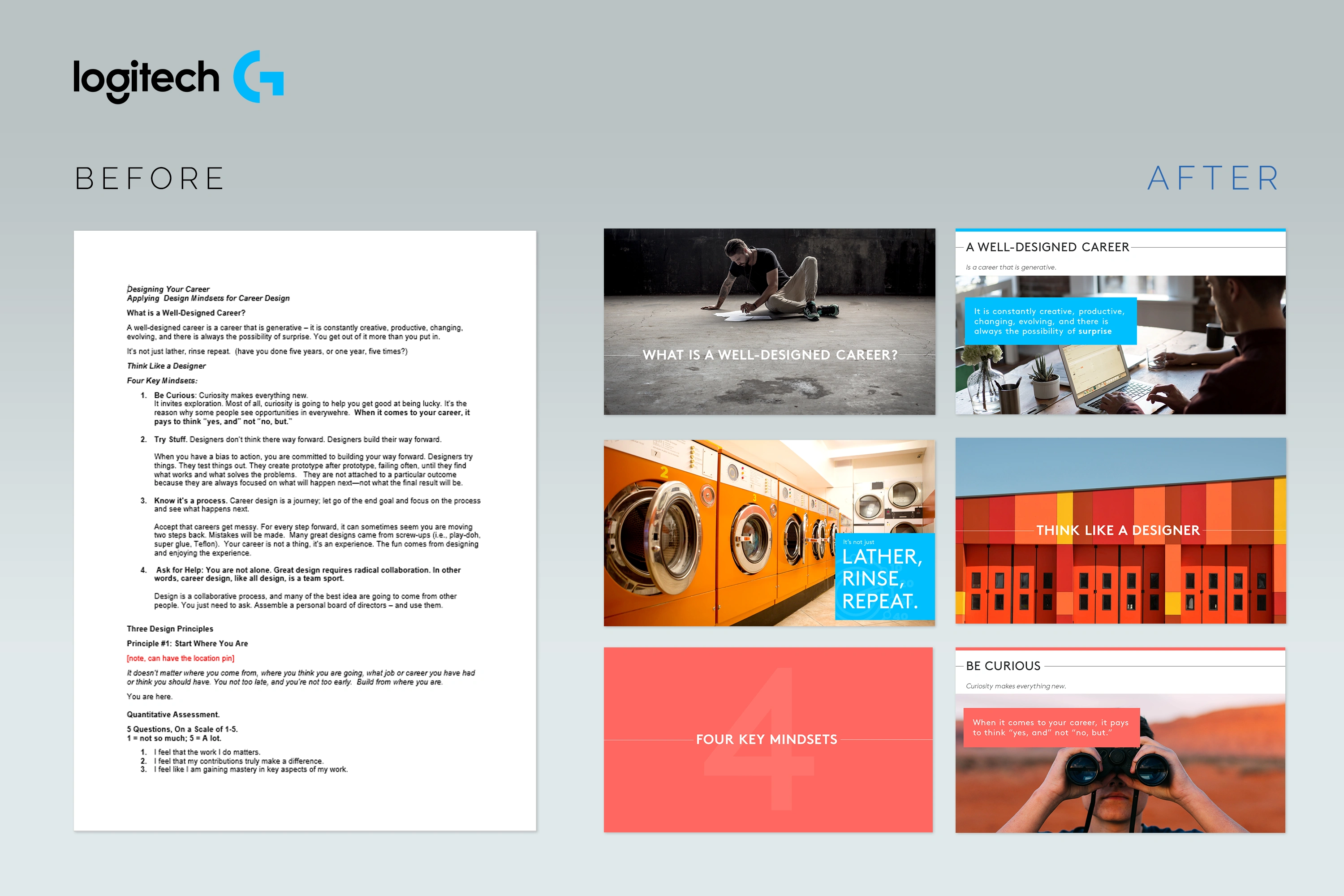 Complete revamp of the leadership program at Logitech, plus presentation design across several teams